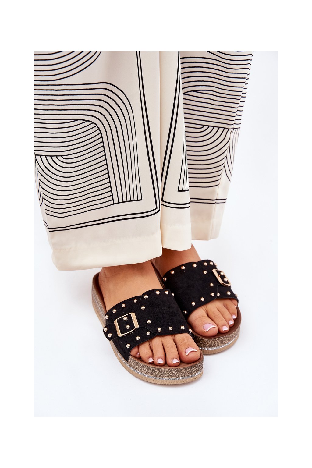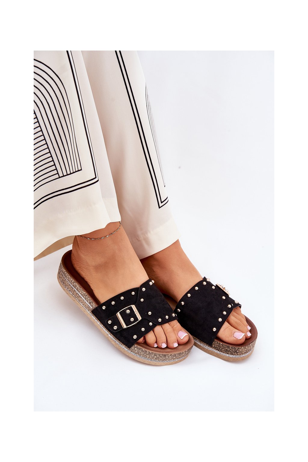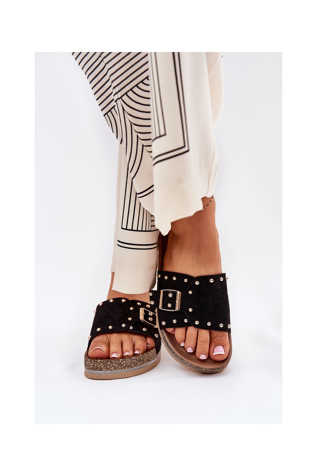 Čierne dámske papuče z eko semišu s rovnou podrážkou a ozdobnými hrotmi, kód produktu M550 BLACK