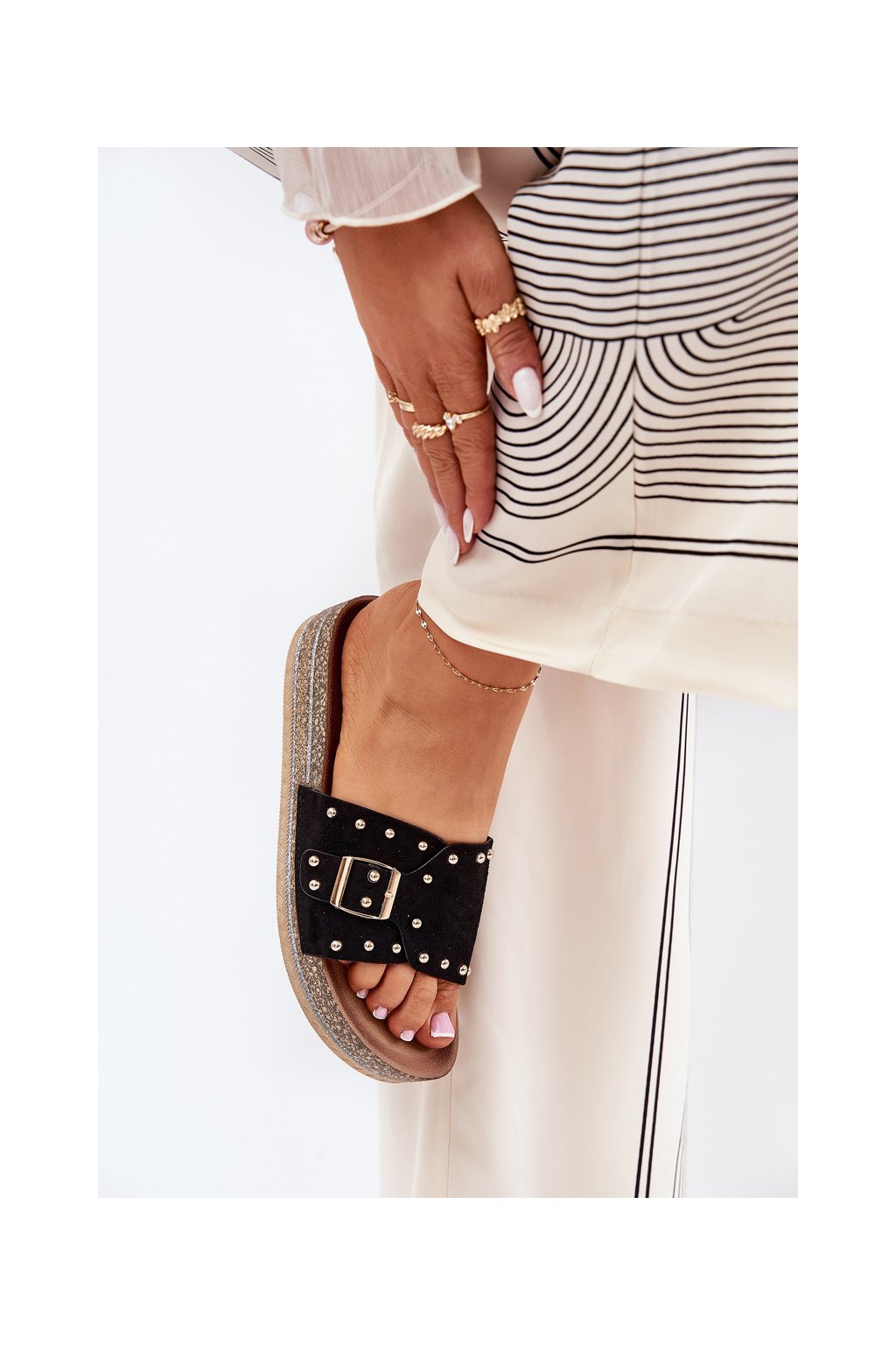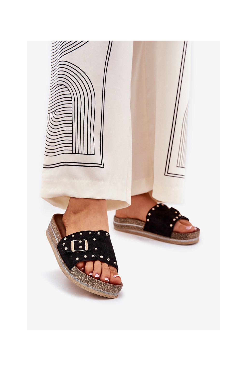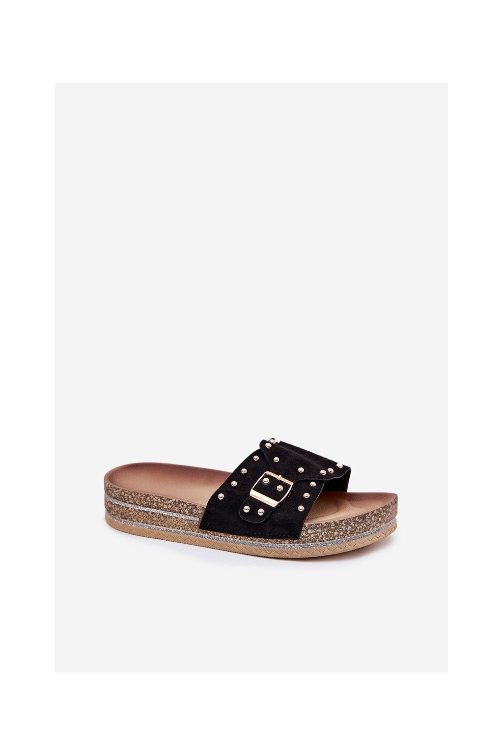 Čierne dámske papuče z eko semišu s rovnou podrážkou a ozdobnými hrotmi, kód produktu M550 BLACK