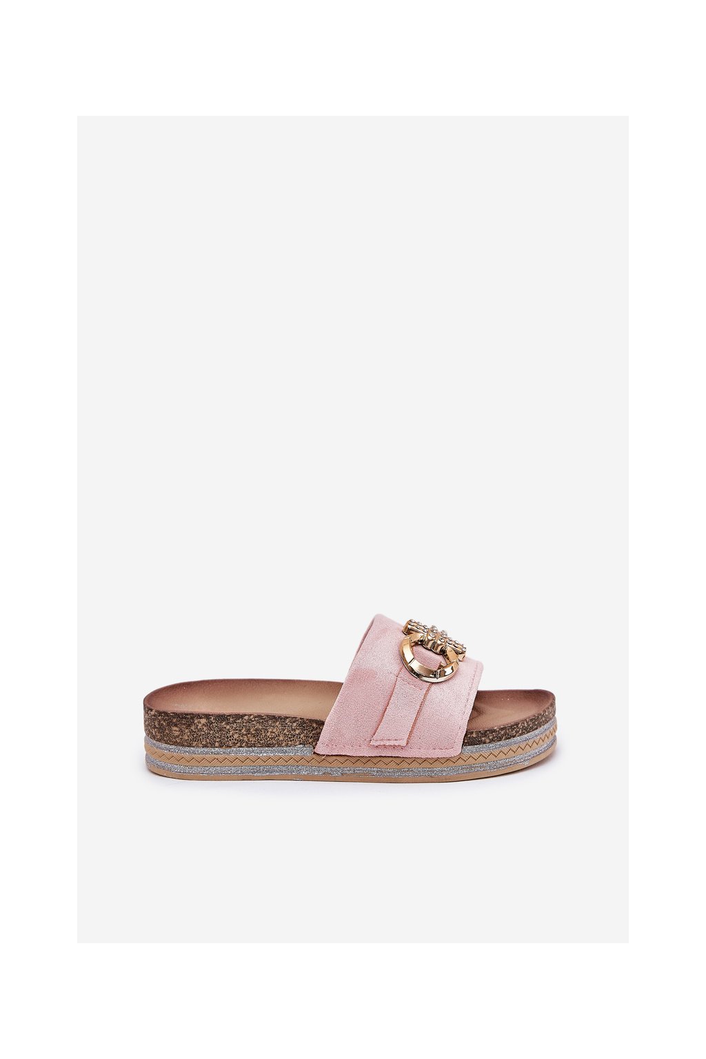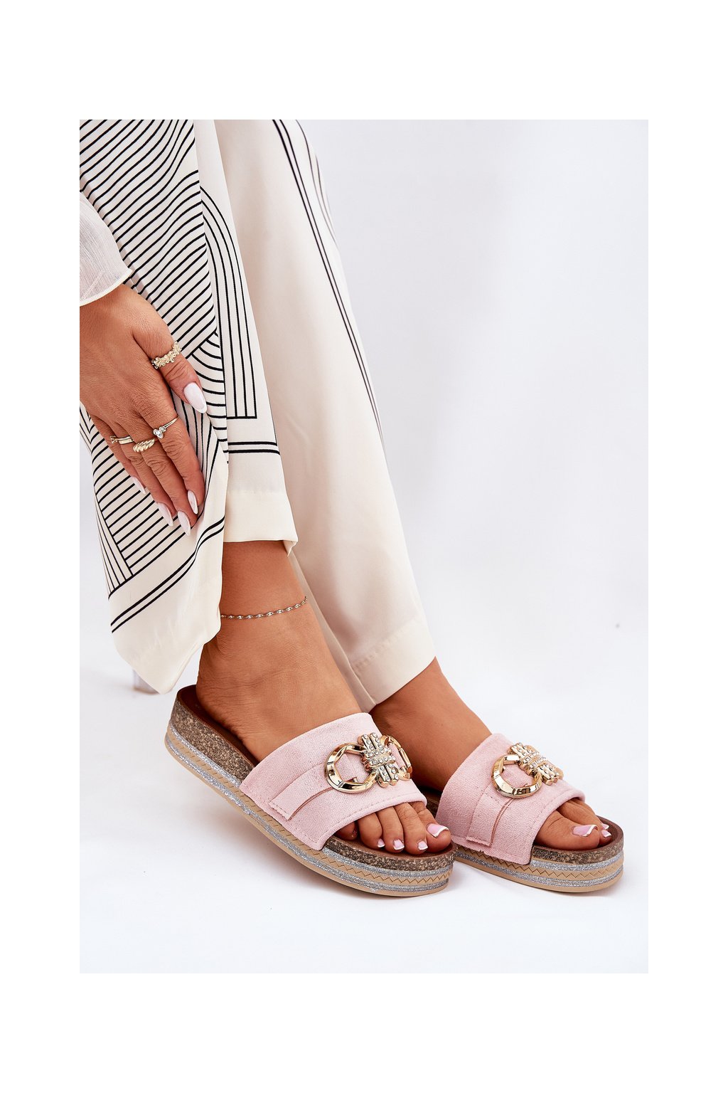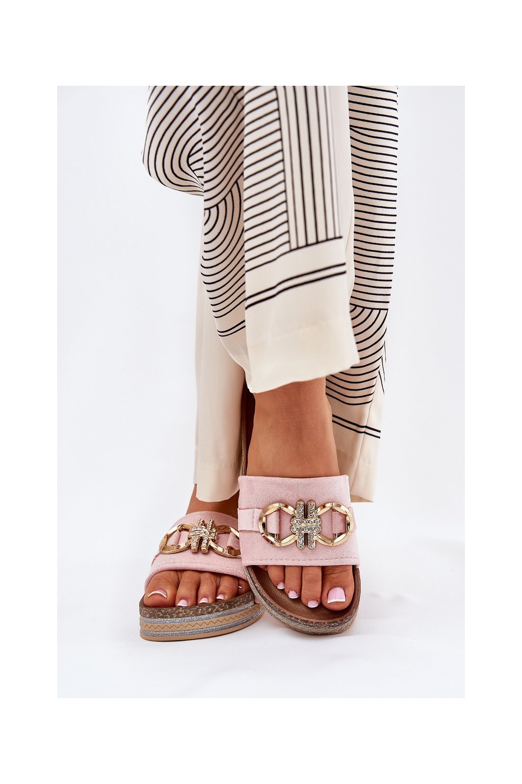 Ružové dámske papuče z eko semišu s trblietkami a zlatou ozdobou na rovnej podrážke, kód produktu M339 PINK