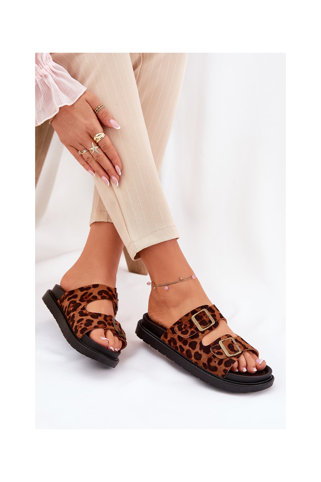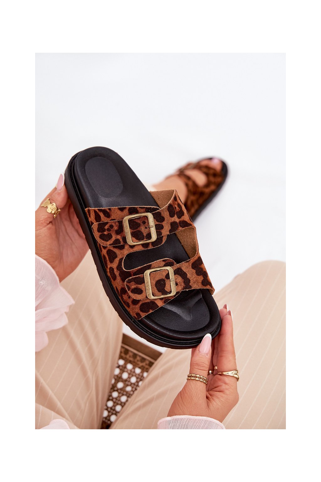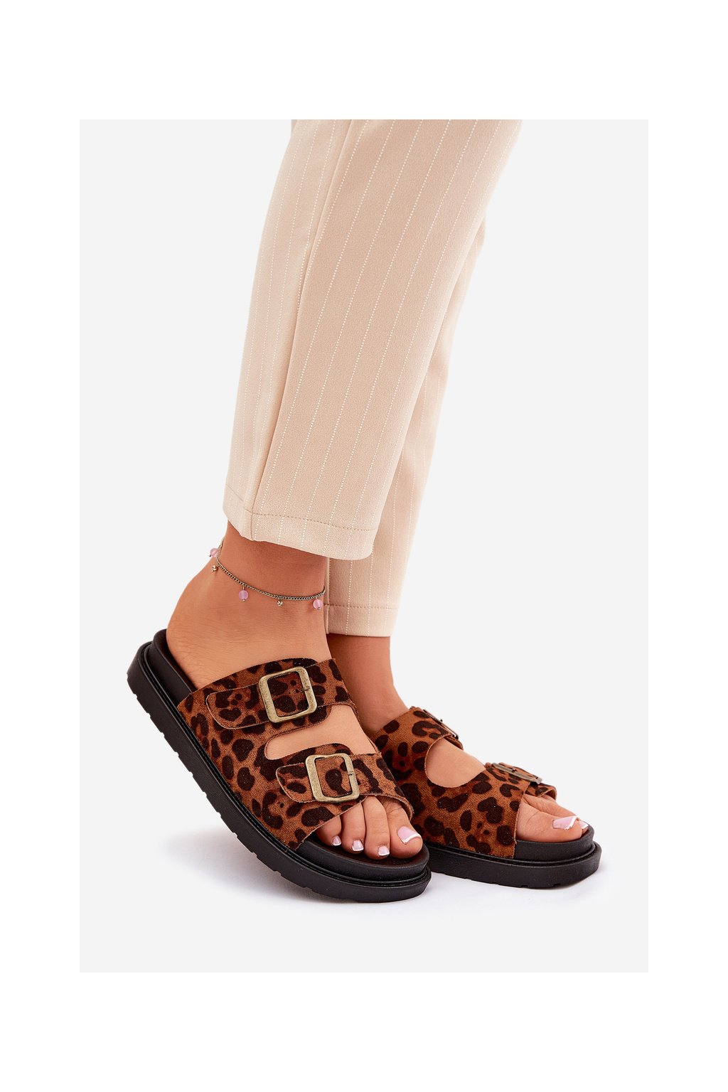 Hnedé dámske papuče z eko semišu s leopardím vzorom, M35 LEOPARD