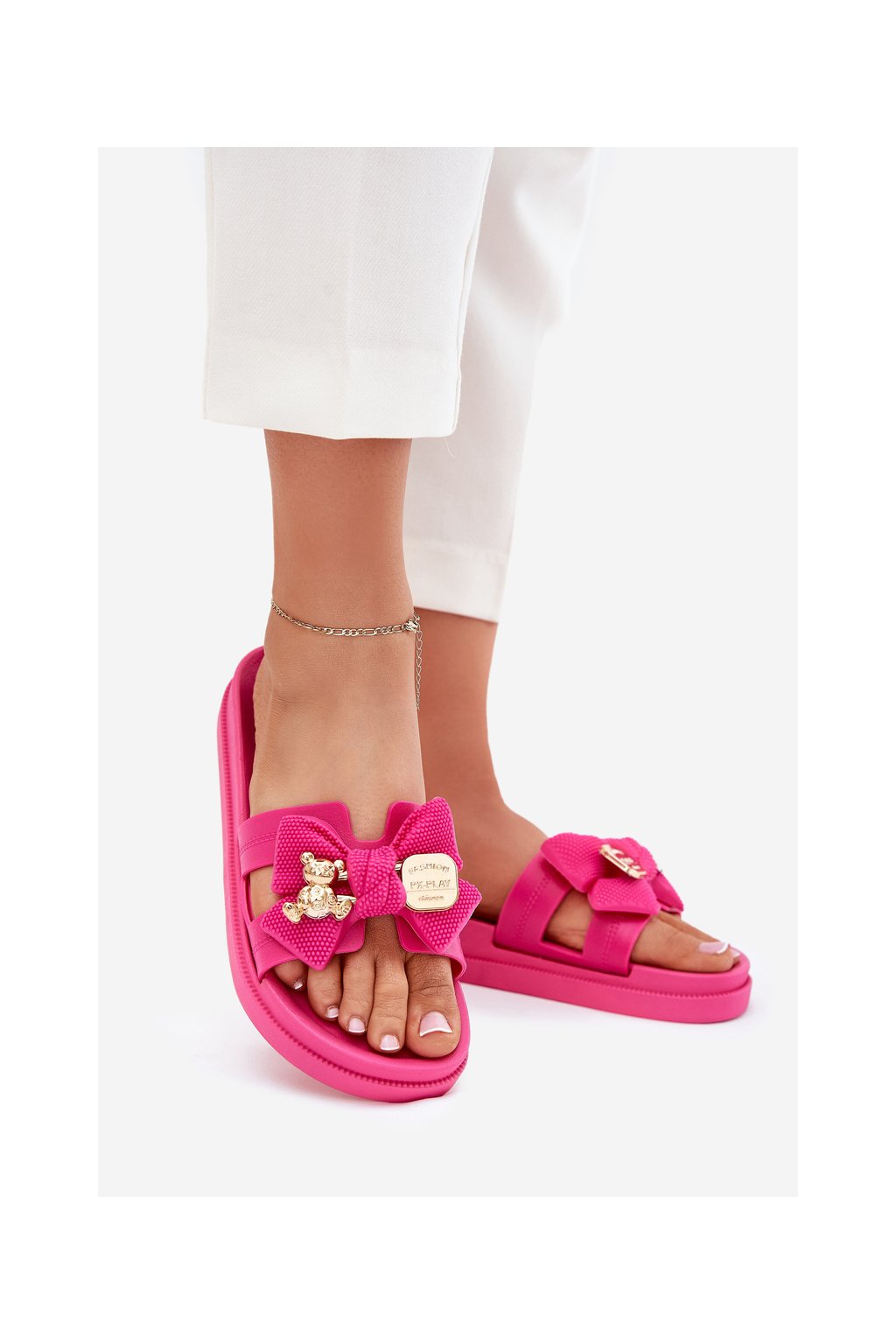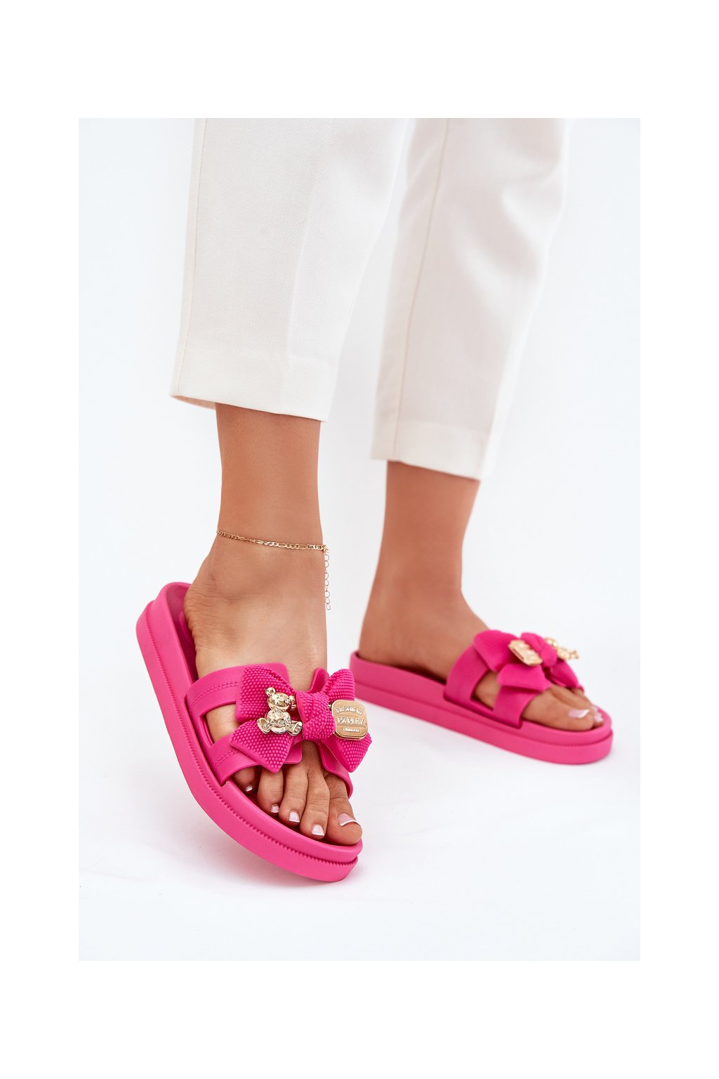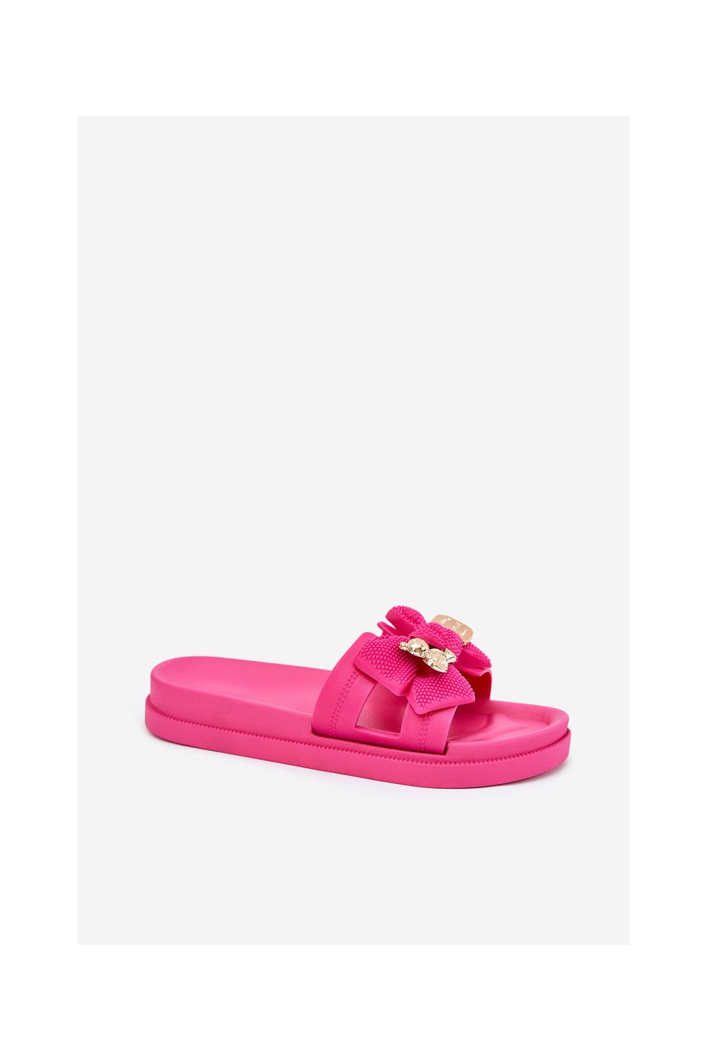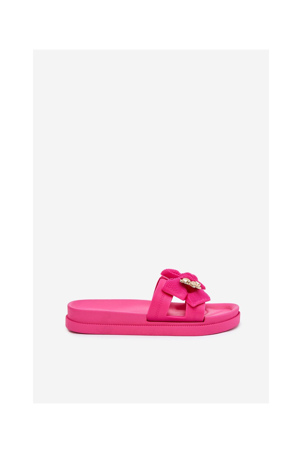Ružové dámske papuče s mašľou a zlatou brožou na rovnej podrážke, kód produktu CK323 FUSHIA