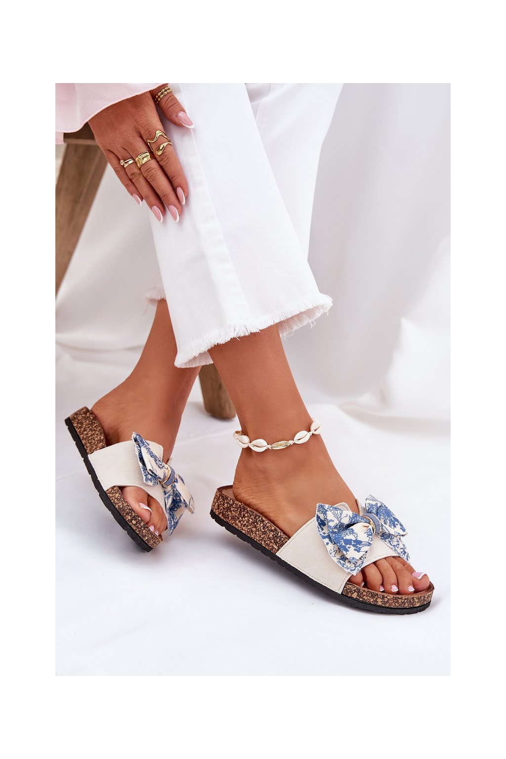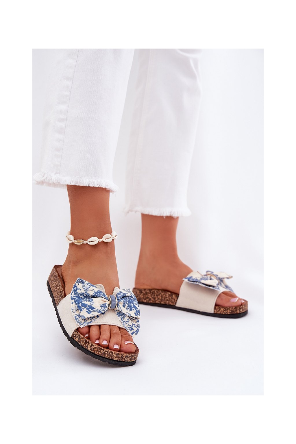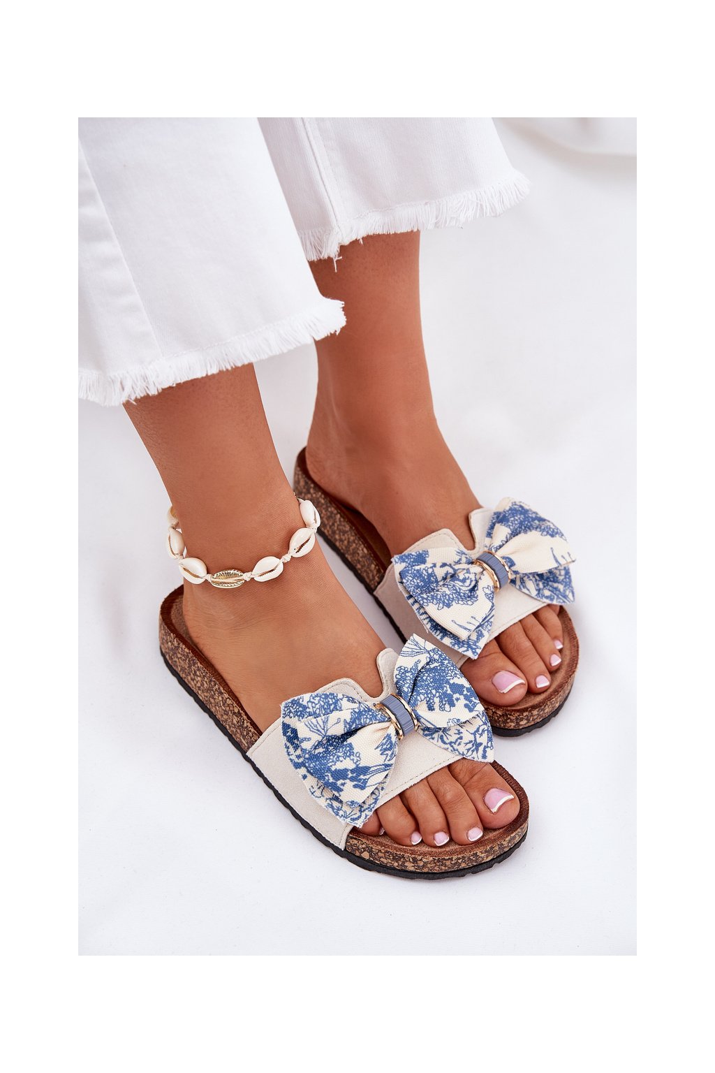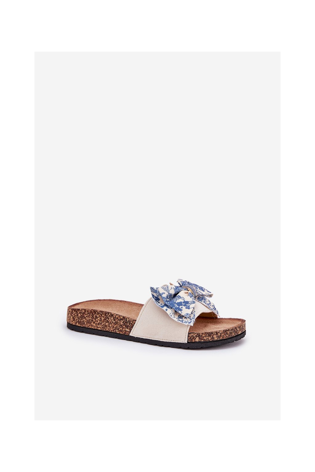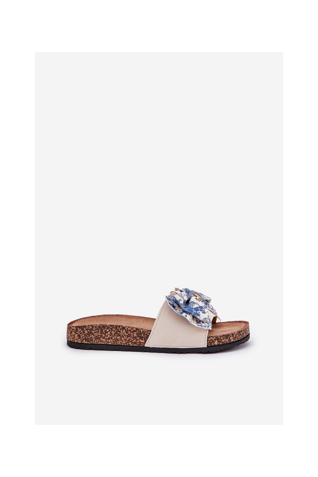 Modré dámske papuče na korkovej ploške s mašľou, textil, 1147 BLUE