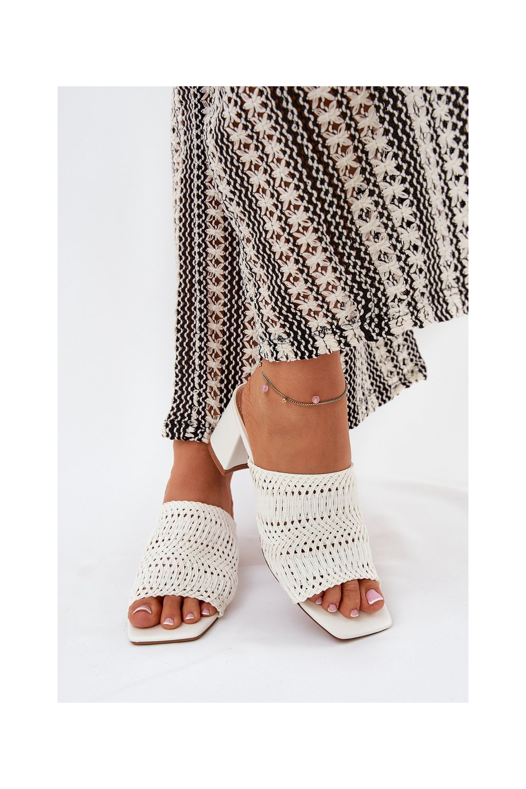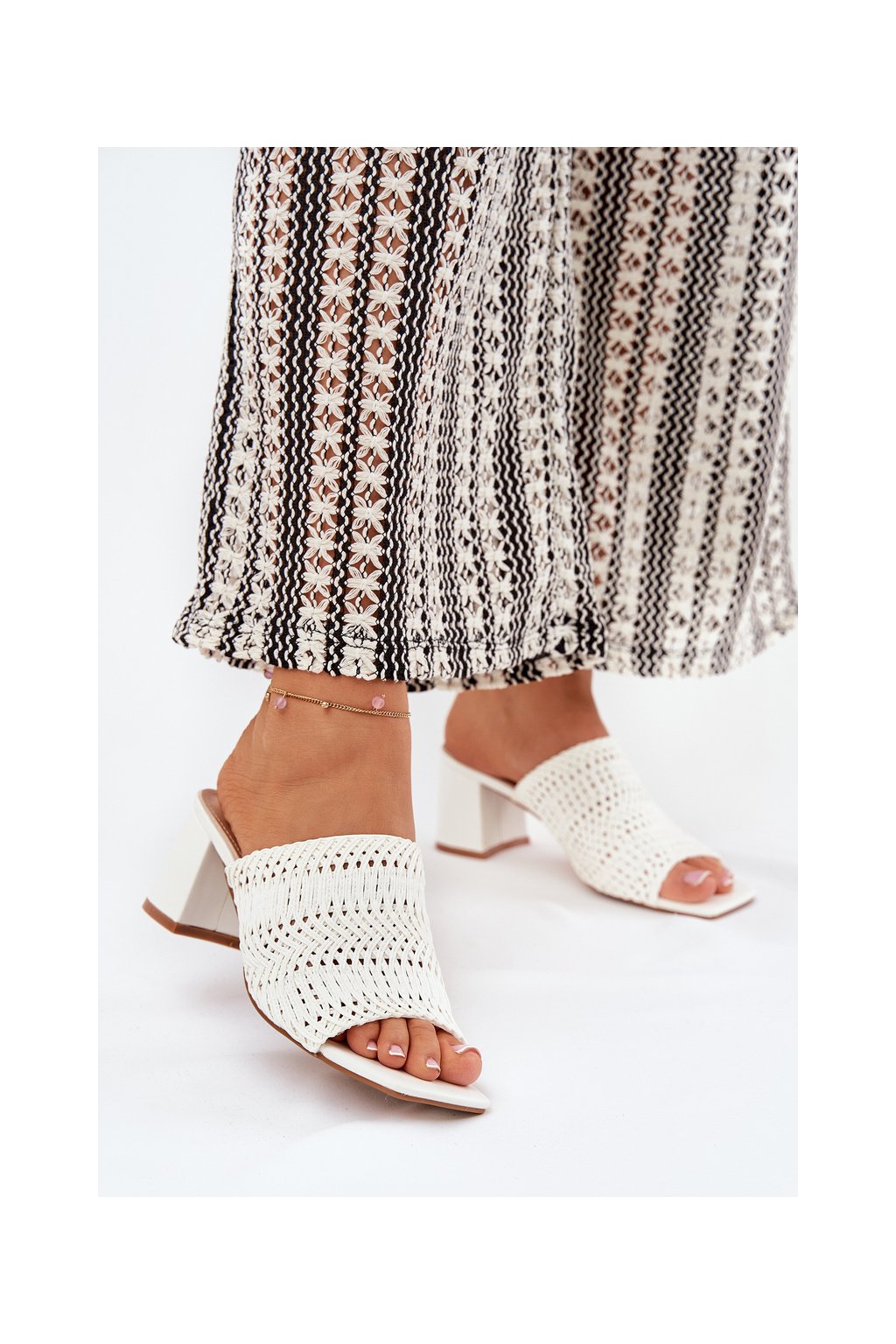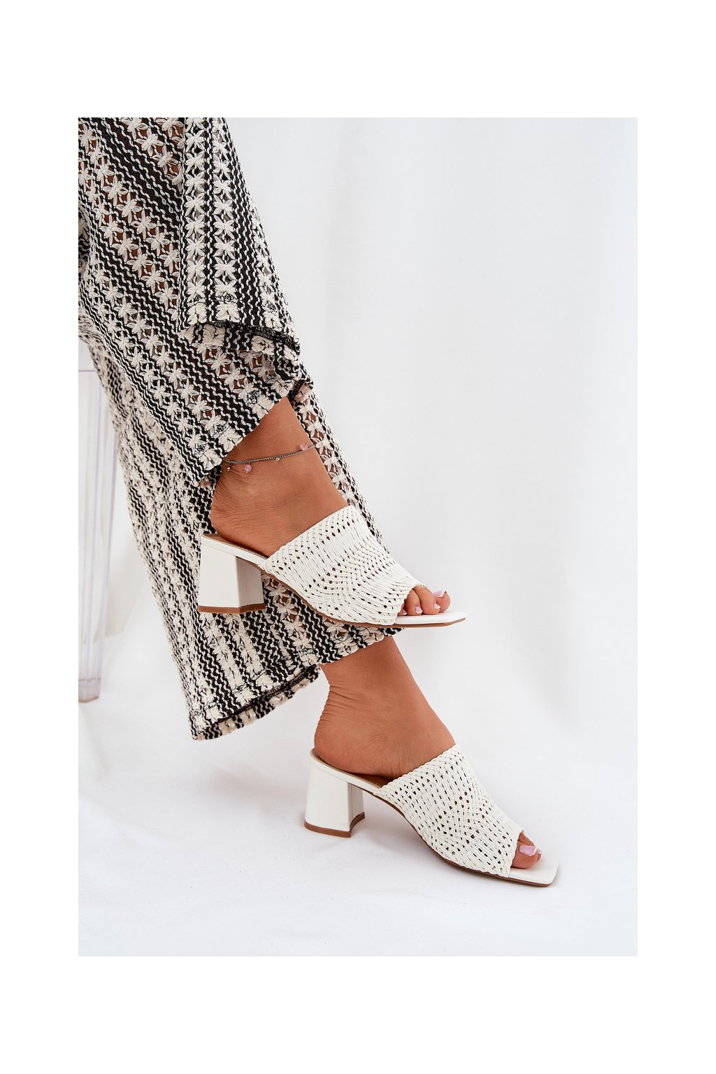 Biele dámske papuče s vyšívaným vzorom na stĺpovom podpätku FY35-6 WHITE