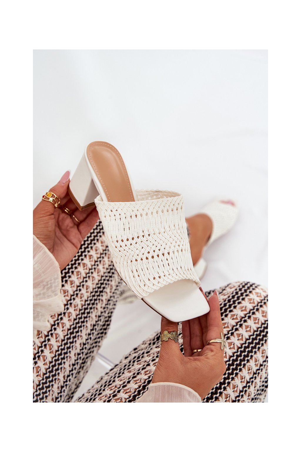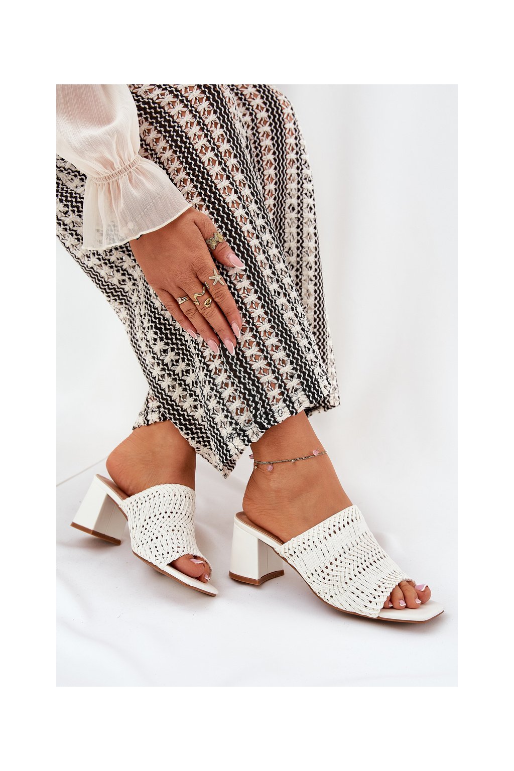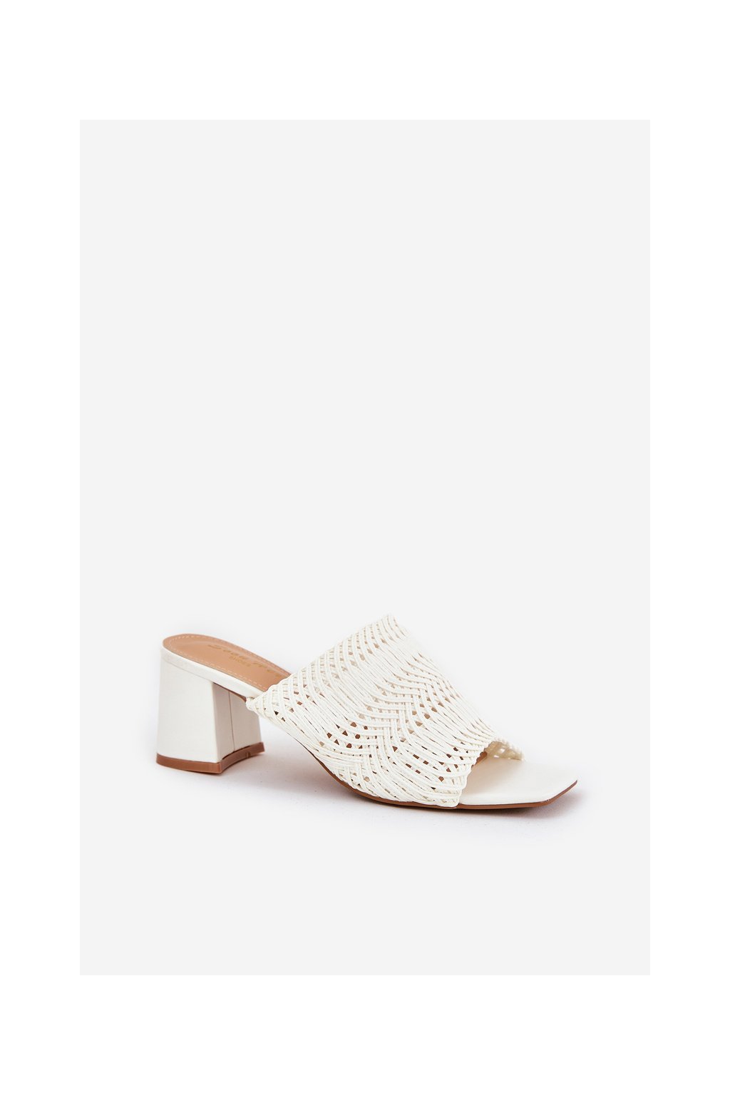 Biele dámske papuče s vyšívaným vzorom na stĺpovom podpätku FY35-6 WHITE