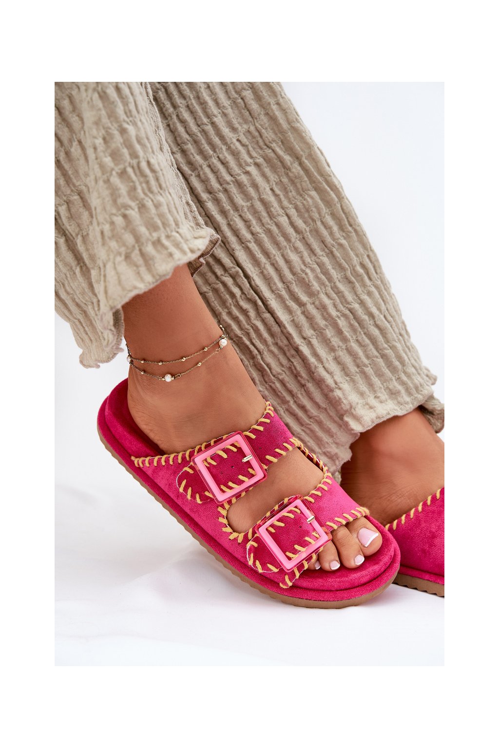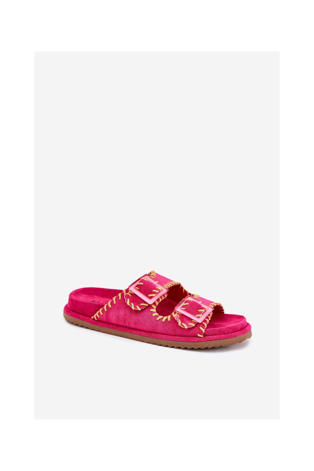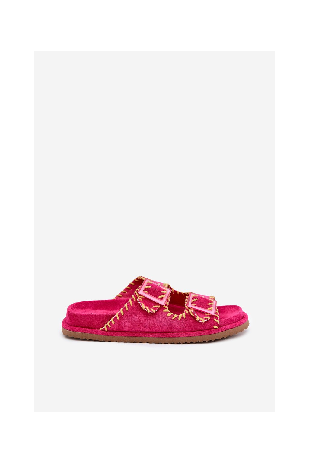 Ružové dámske šľapky z eko semišu s vyšívaným vzorom a sponami G474 FUCHSIA
