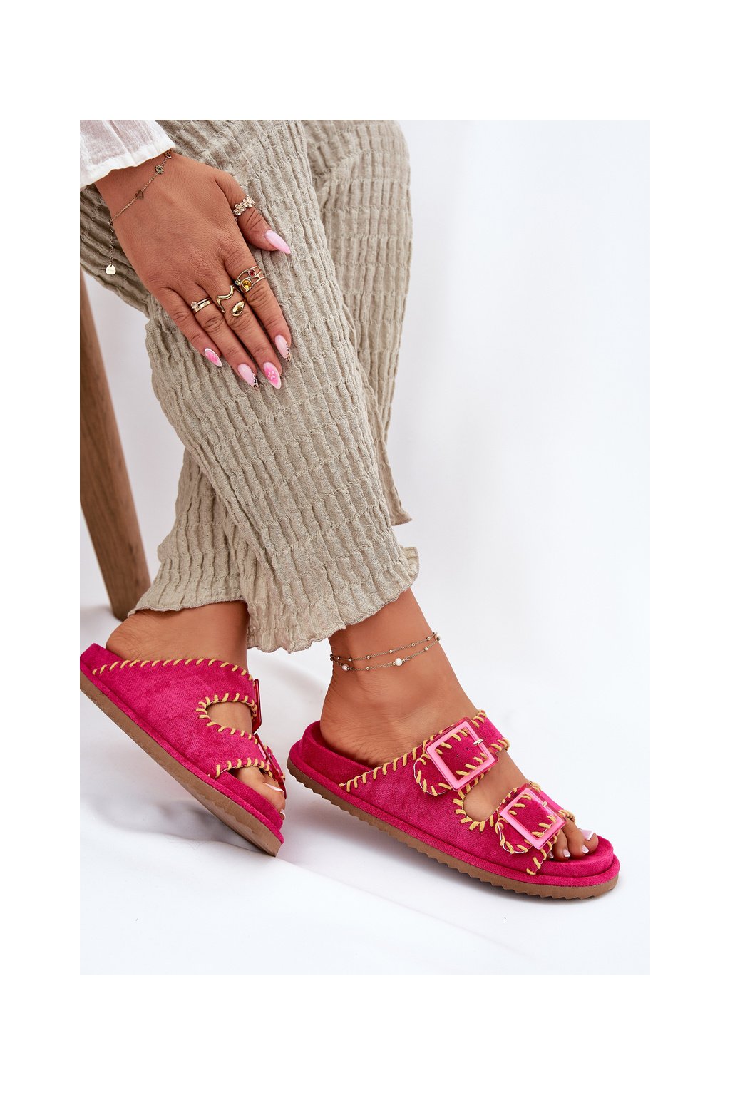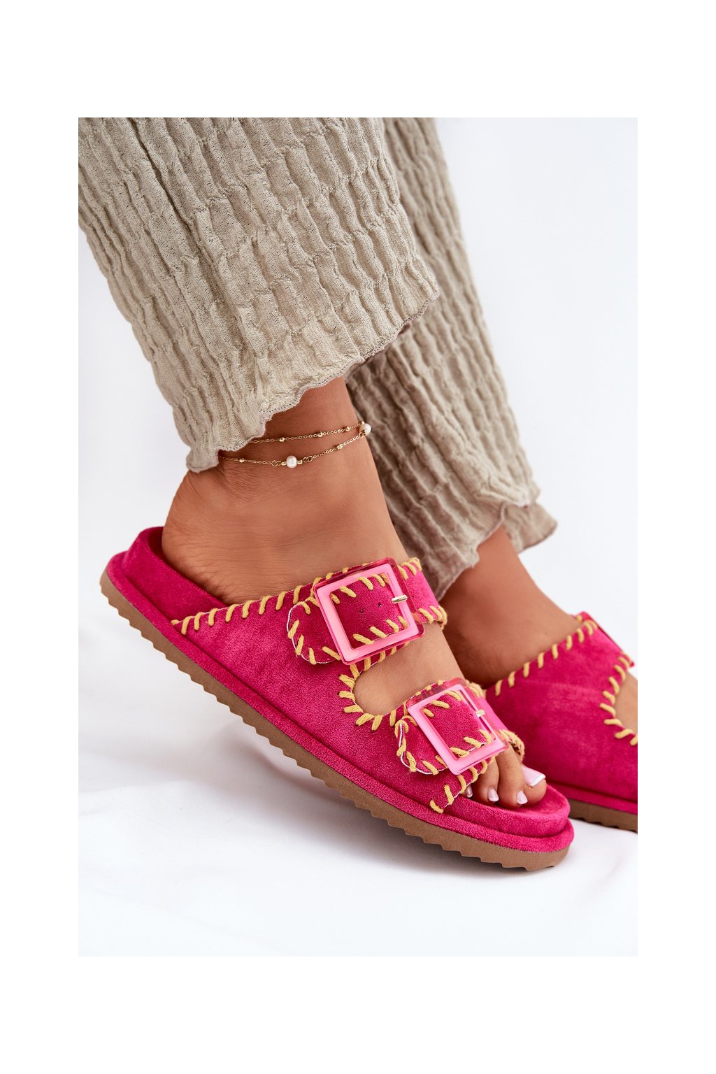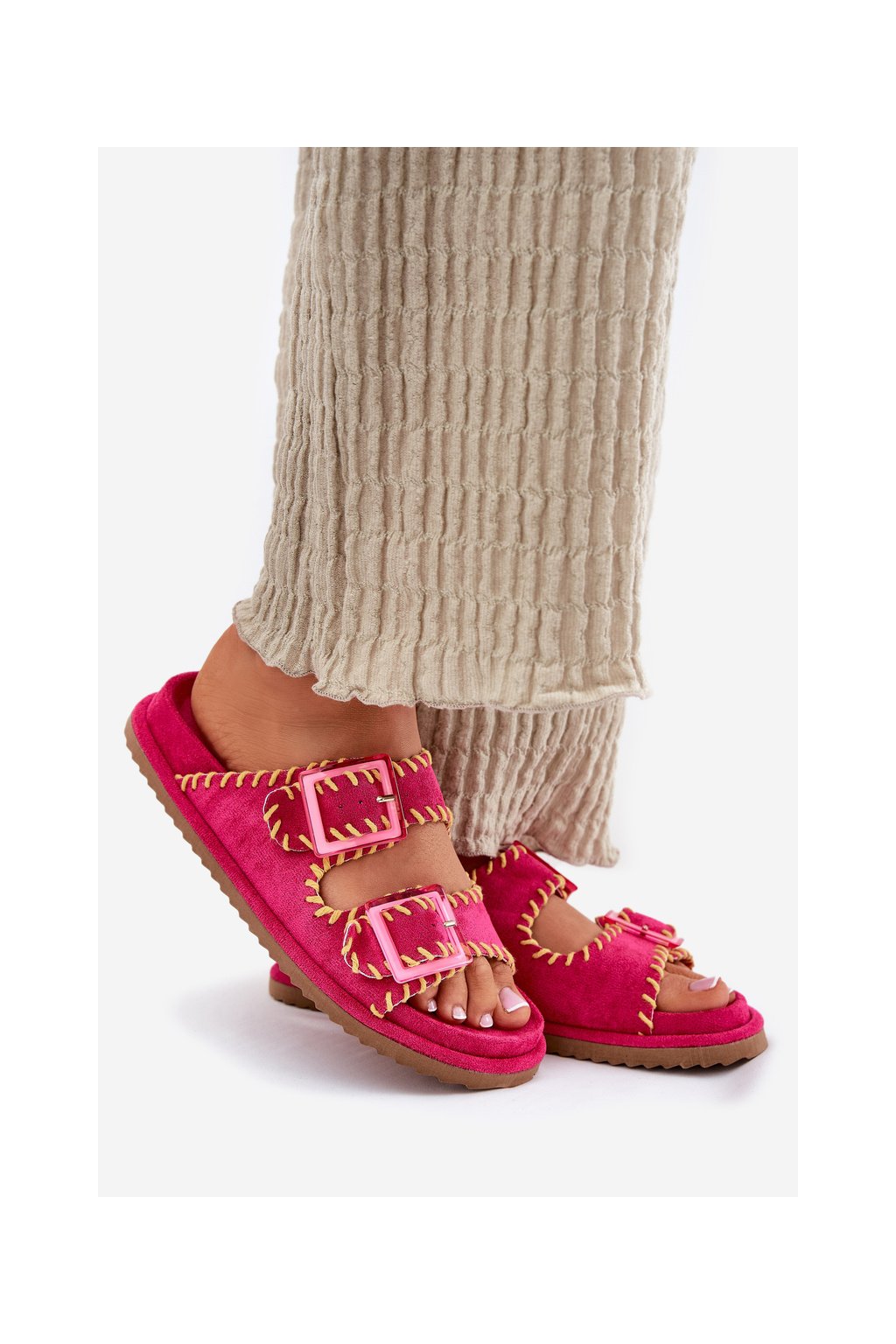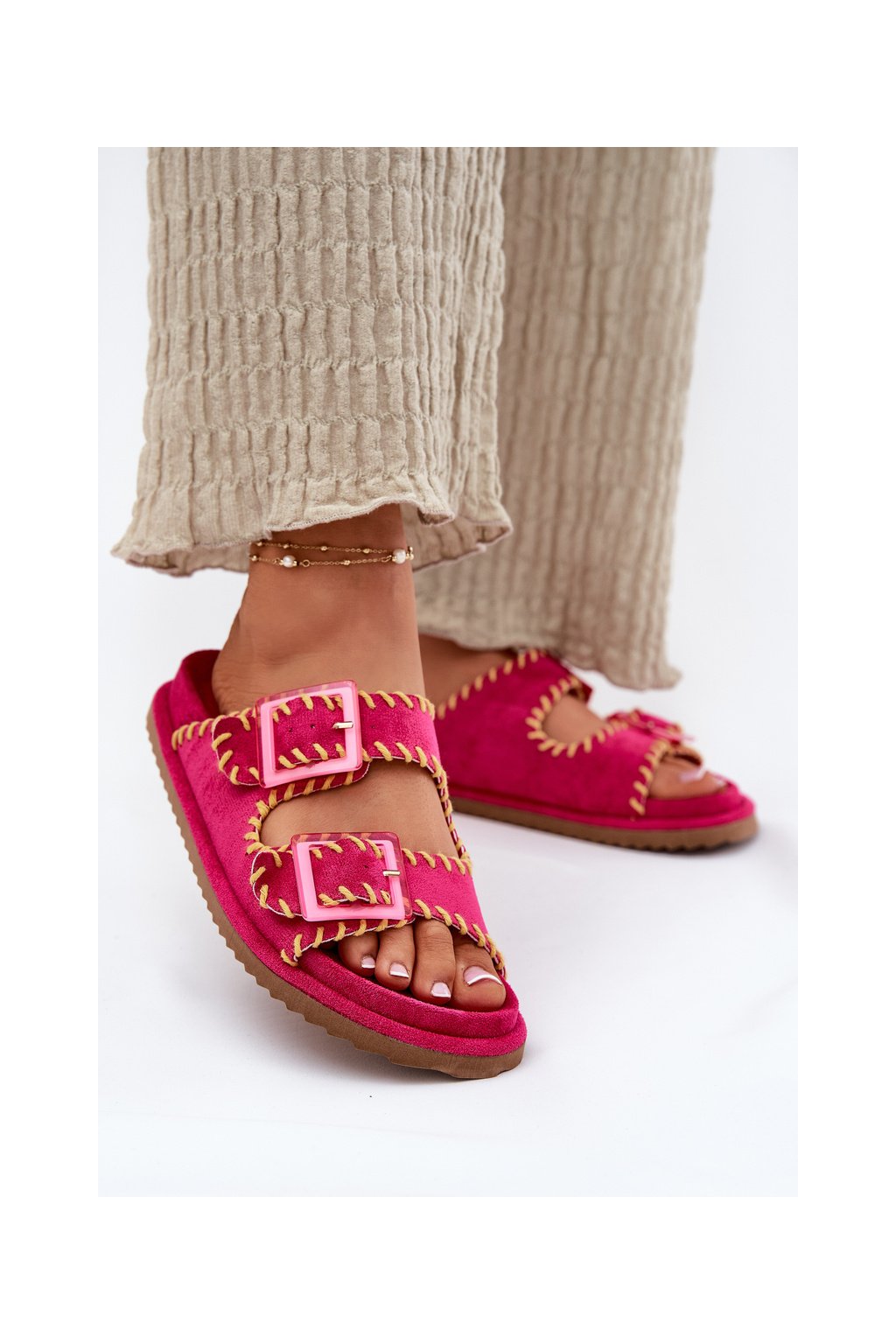 Ružové dámske šľapky z eko semišu s vyšívaným vzorom a sponami G474 FUCHSIA