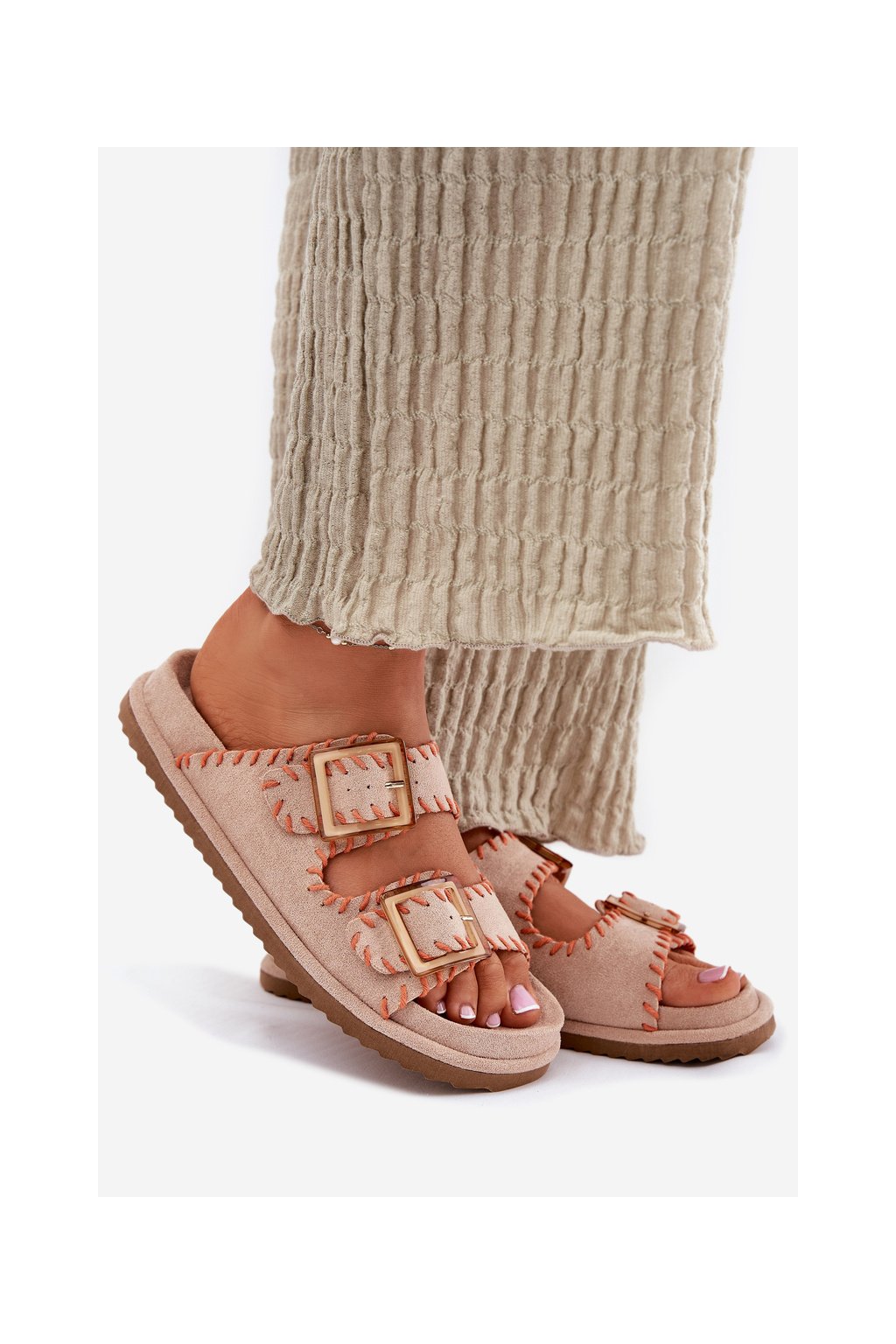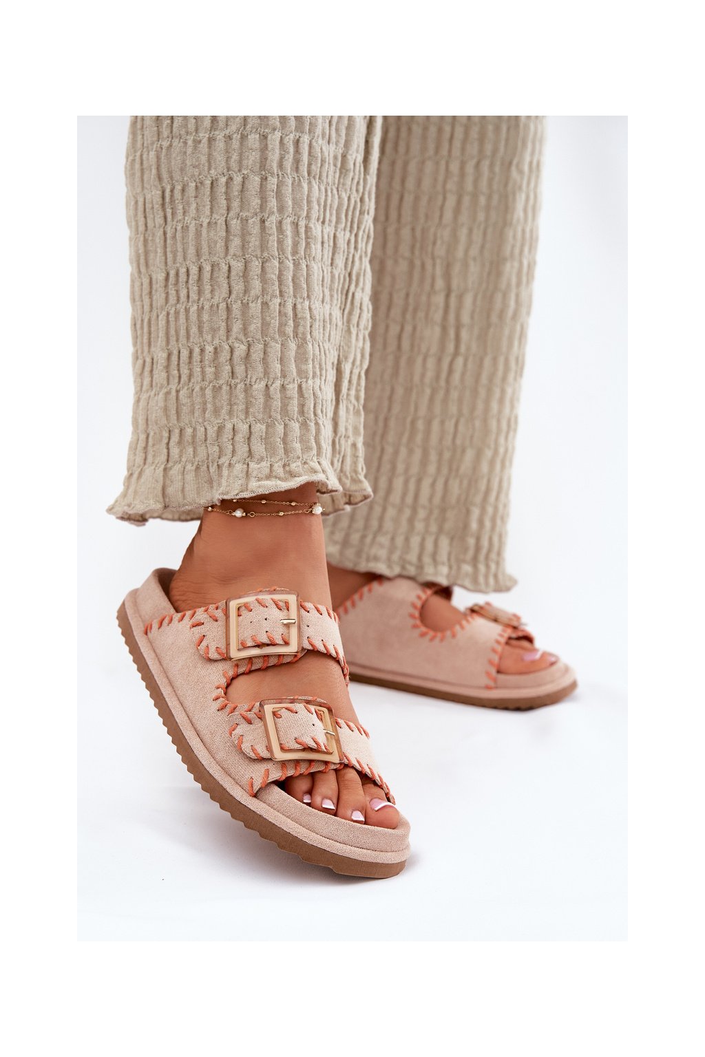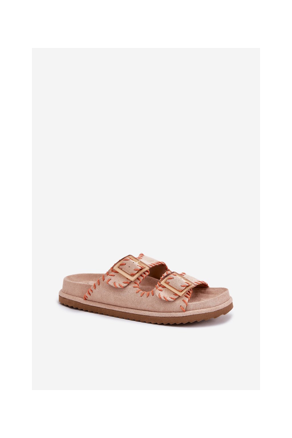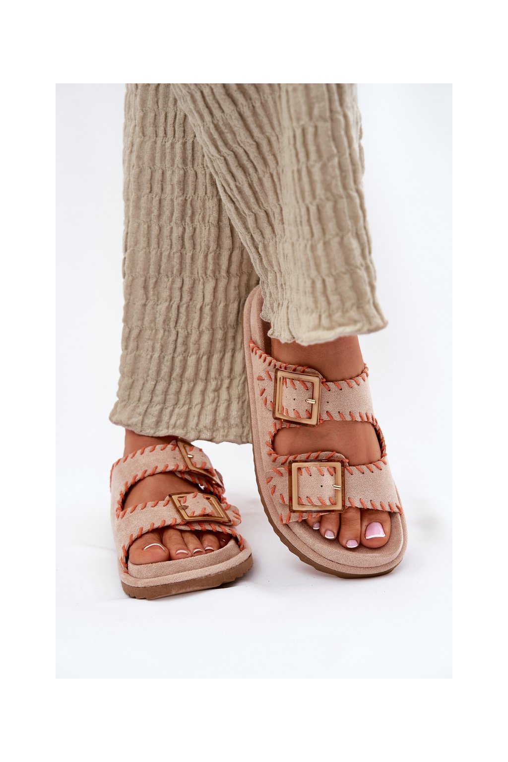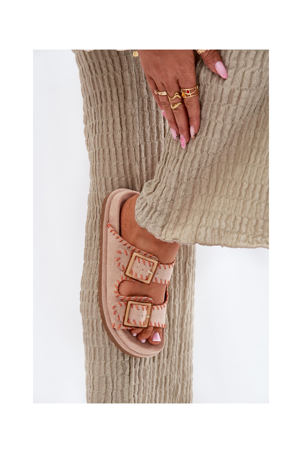 Dámske béžové šľapky z eko semišu s ozdobným prešívaním a prešívaným vzorom, kód produktu G474 KHAKI