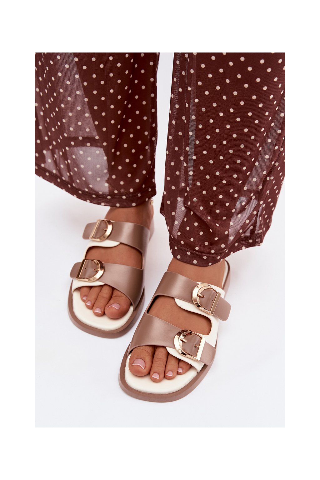 Dámske papuče s zlatými sponami béžove danelle / 78-196 KHAKI/OFF WHT