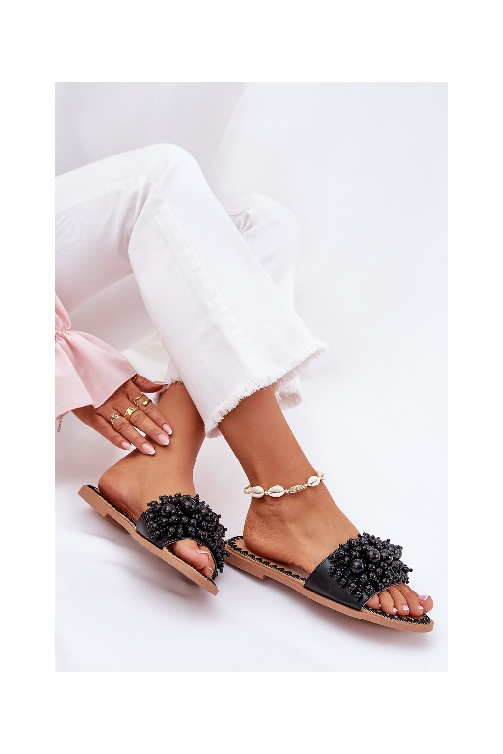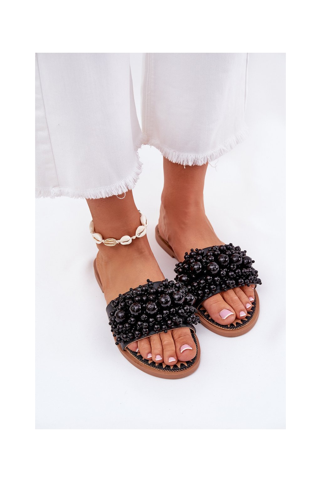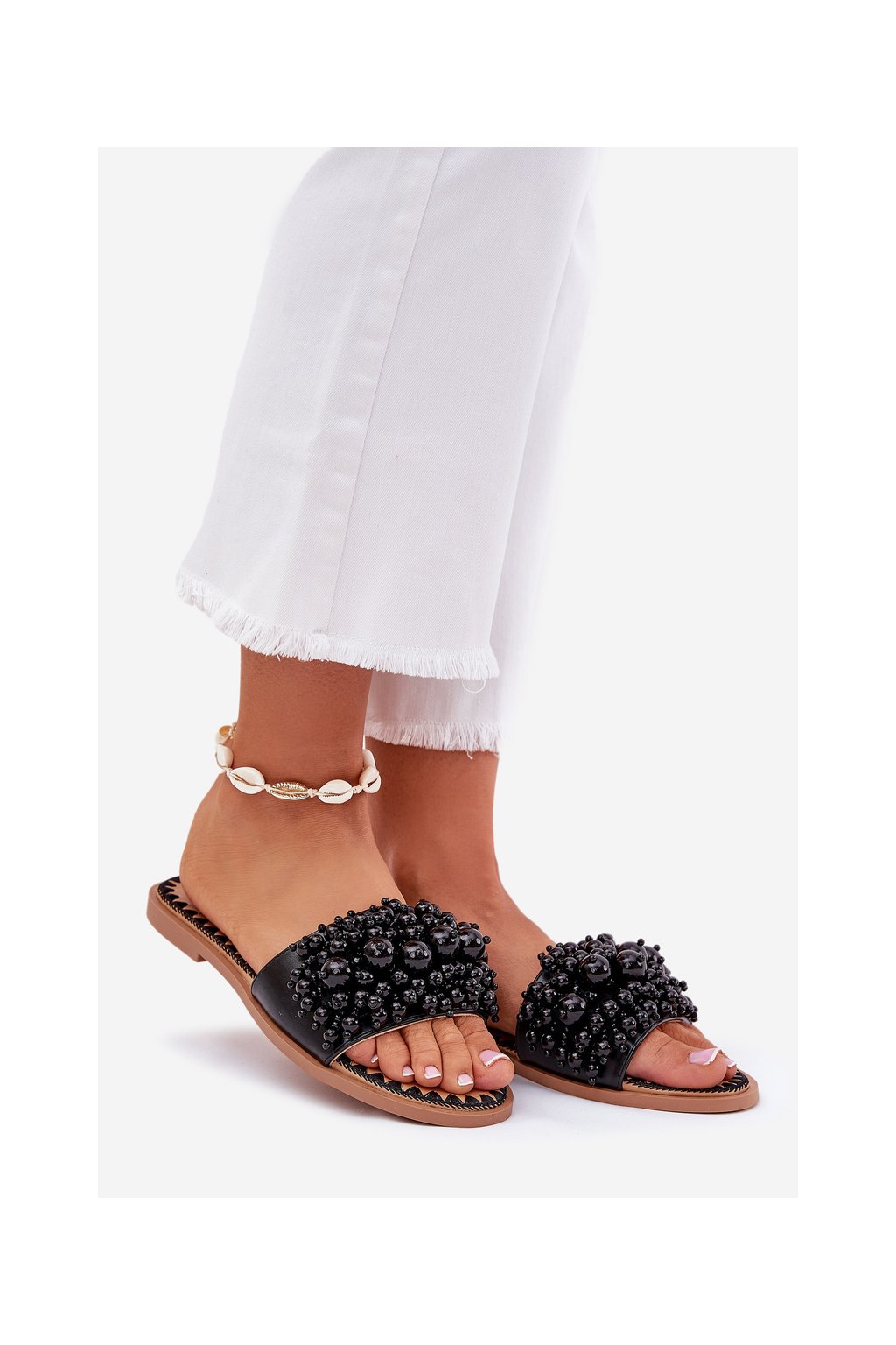 Čierne dámske šľapky z eko kože s perlami, QQ-224 BLACK