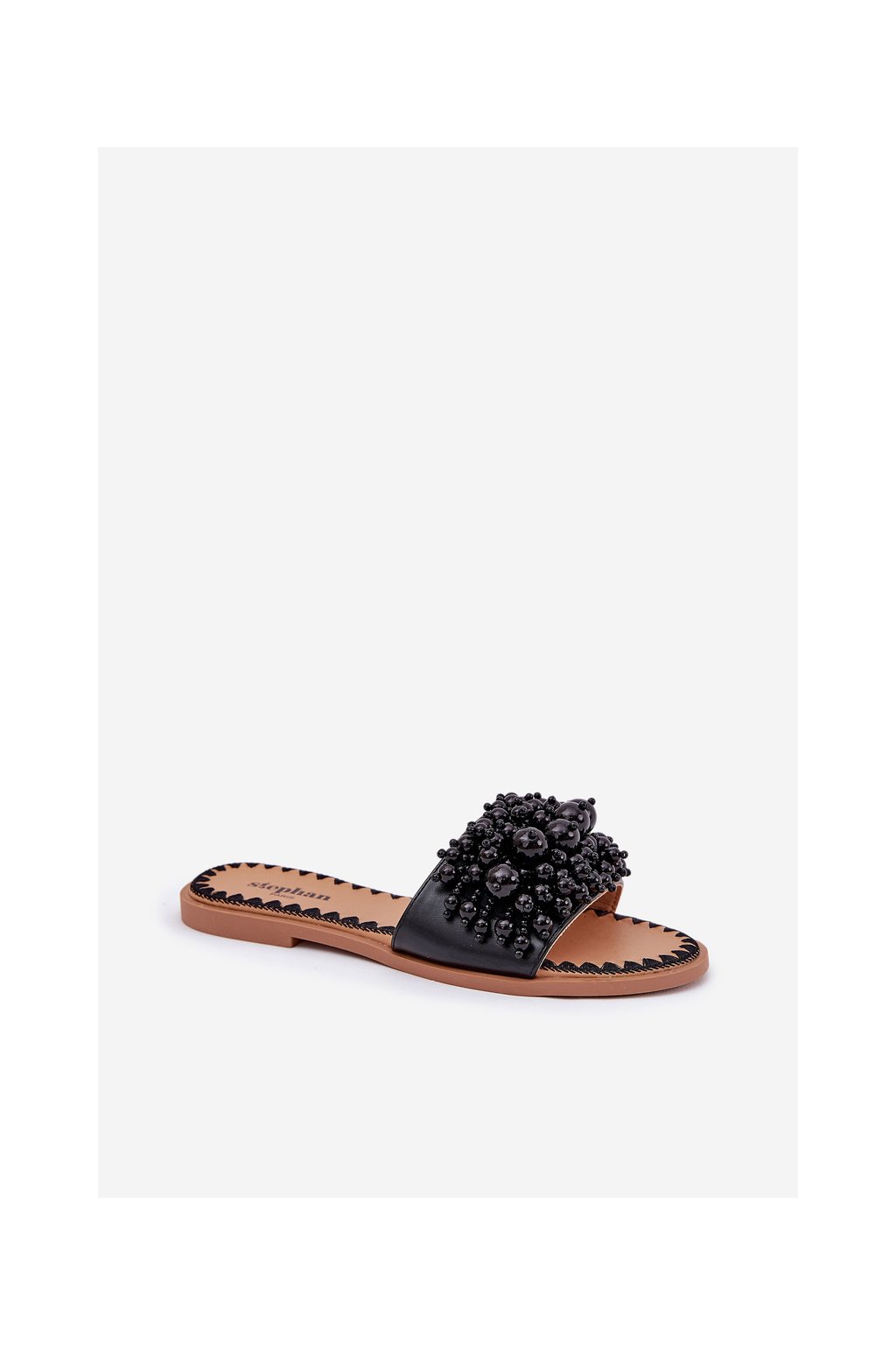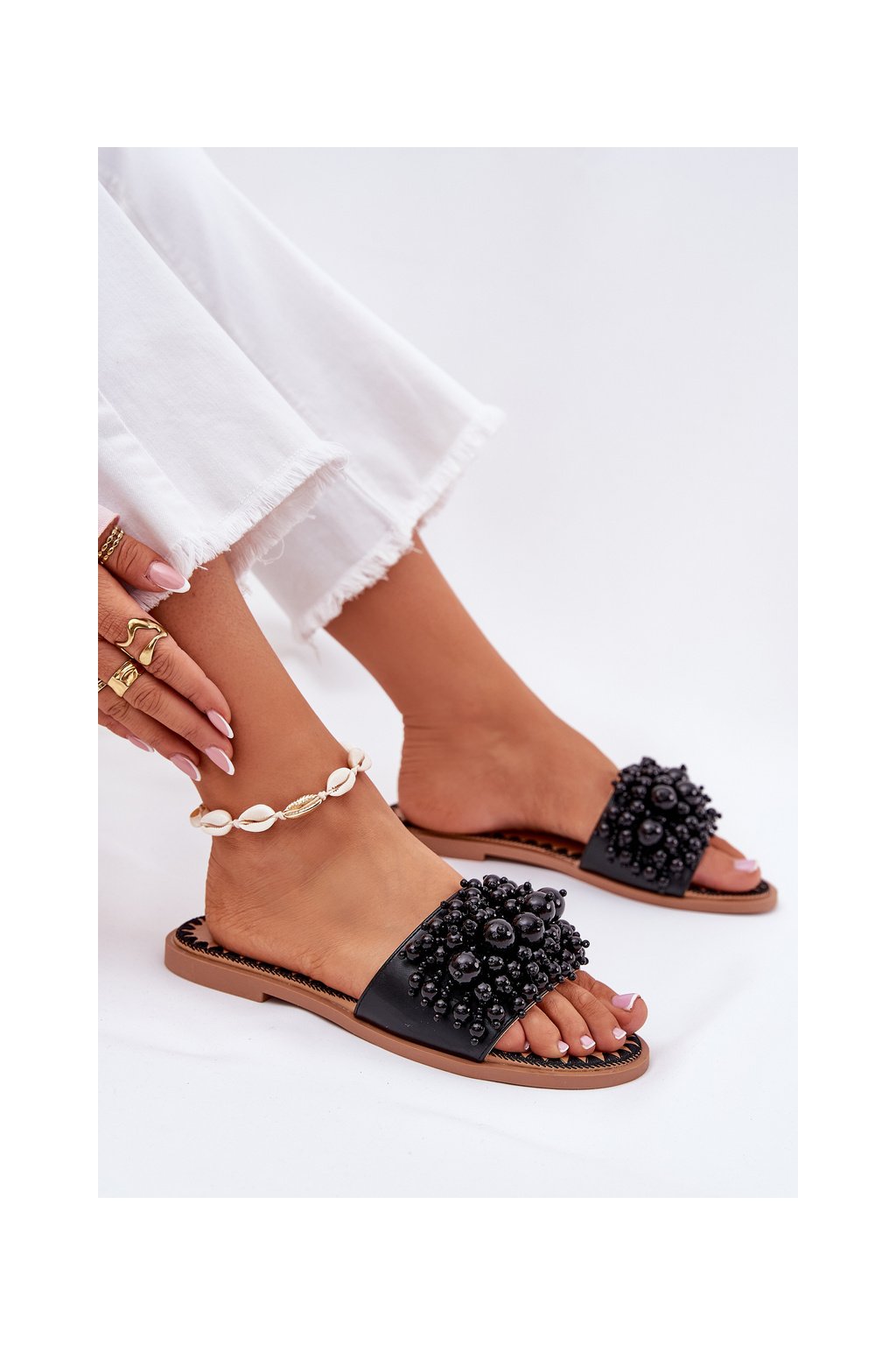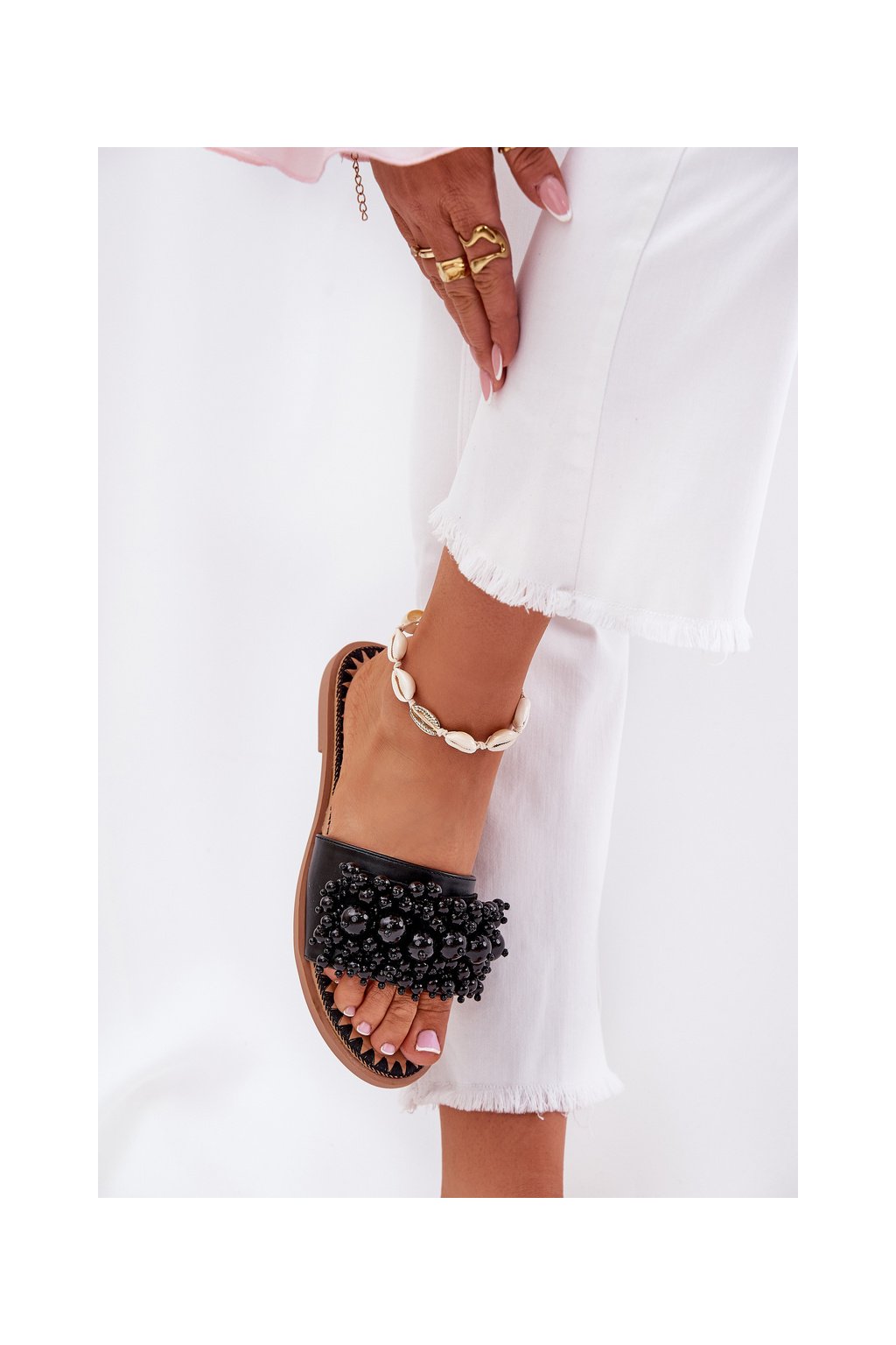 Čierne dámske šľapky z eko kože s perlami, QQ-224 BLACK