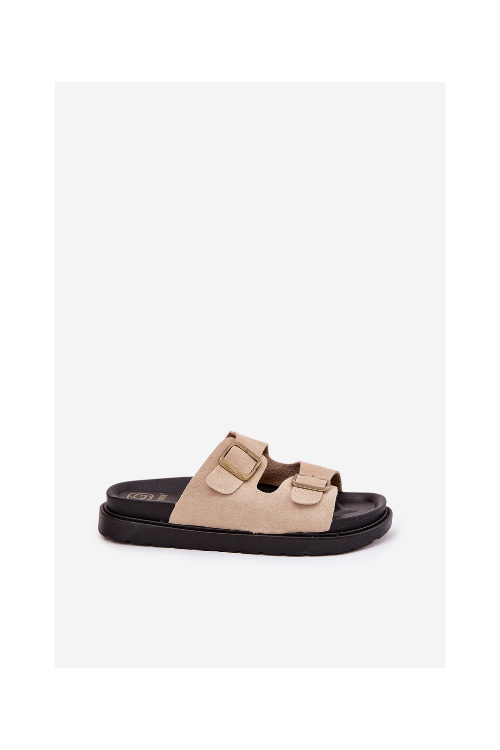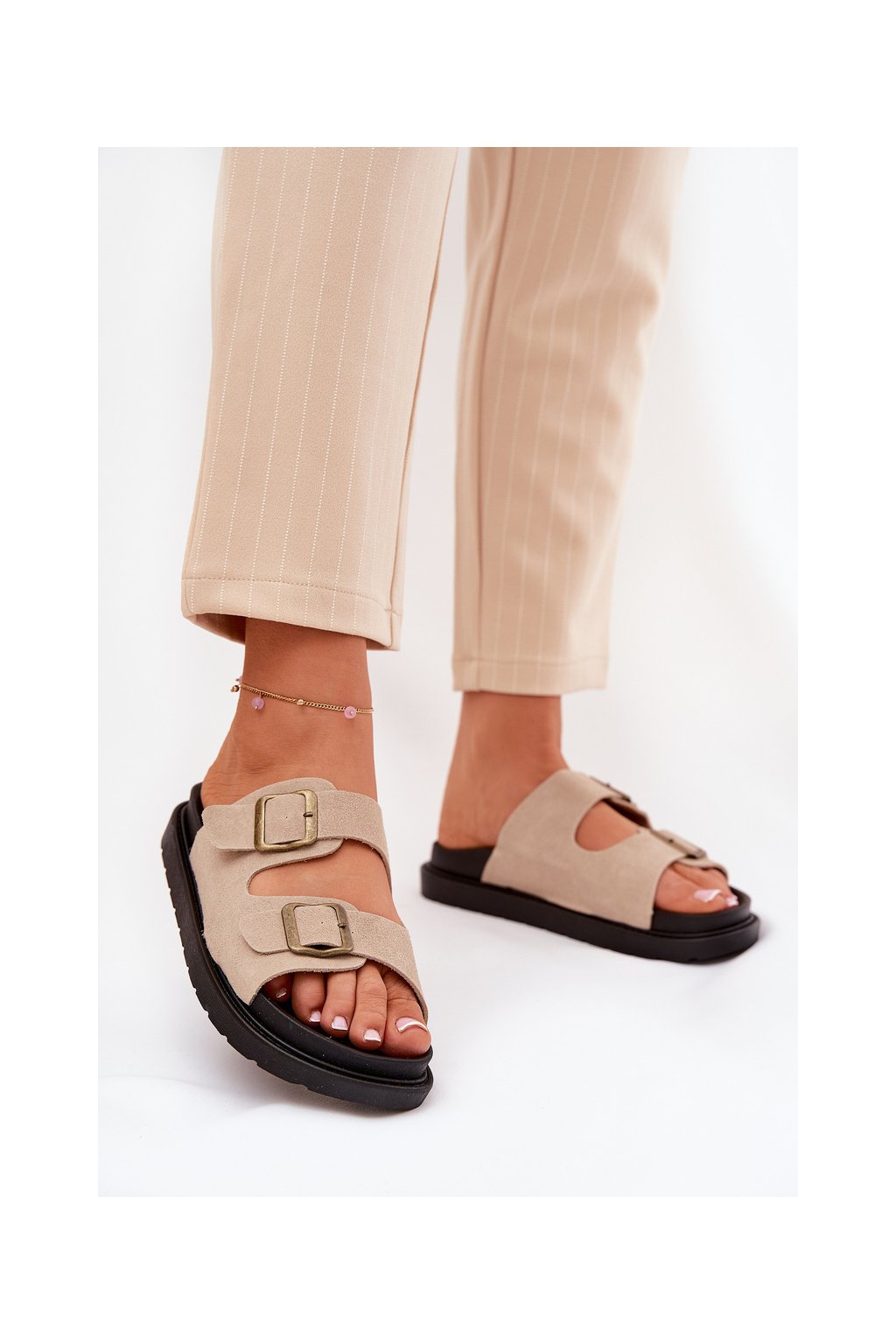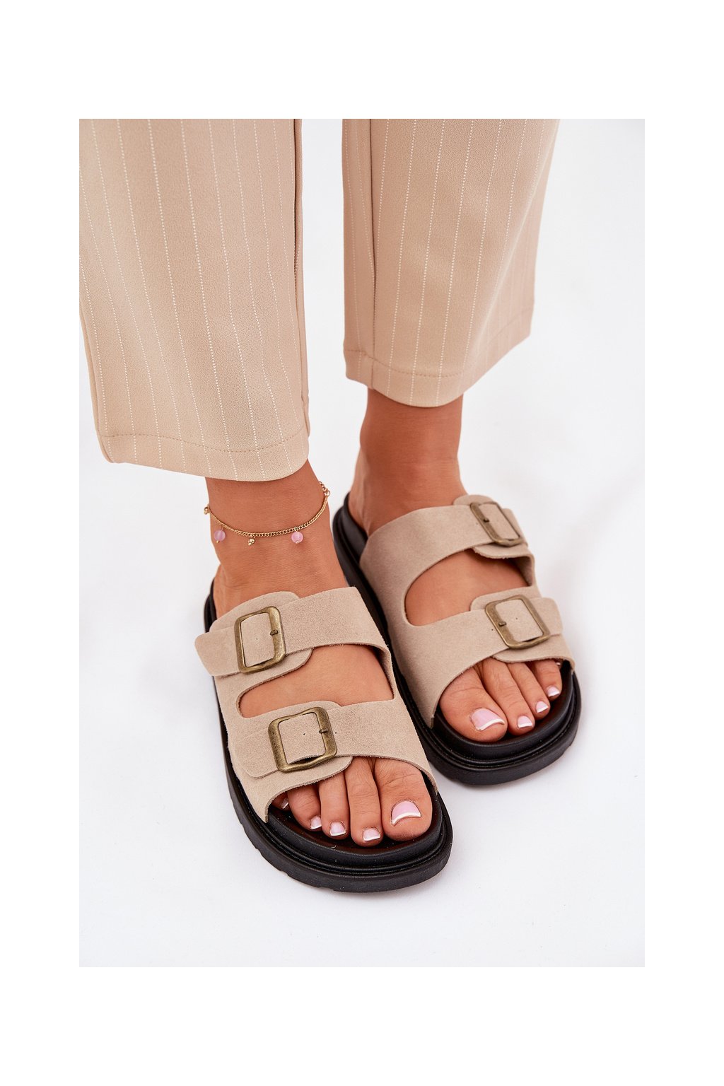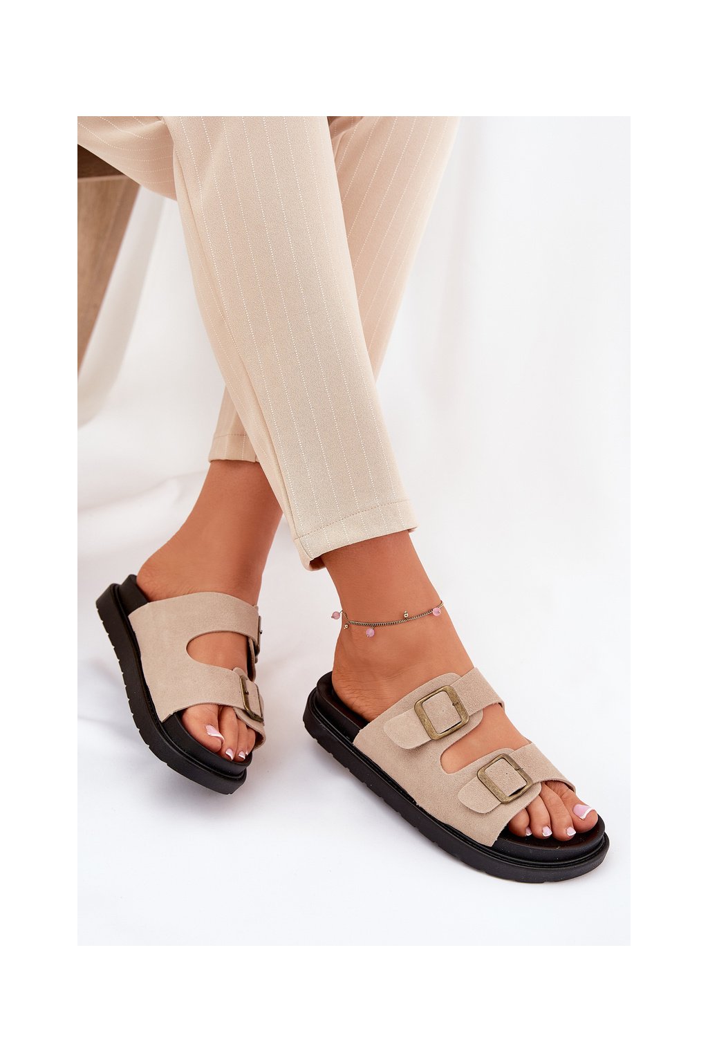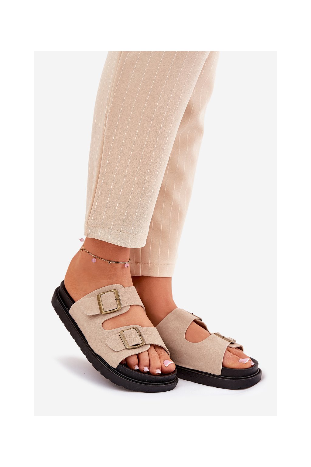 Dámske béžové papuče z eko semišu na plošej platforme, kód M35 KHAKI