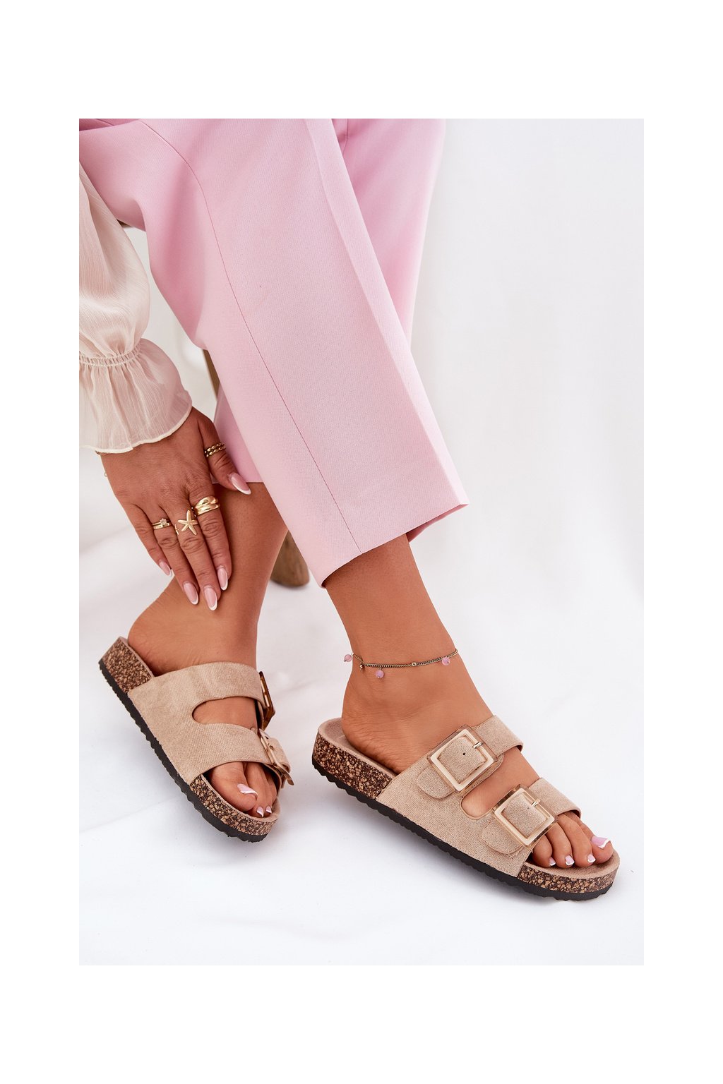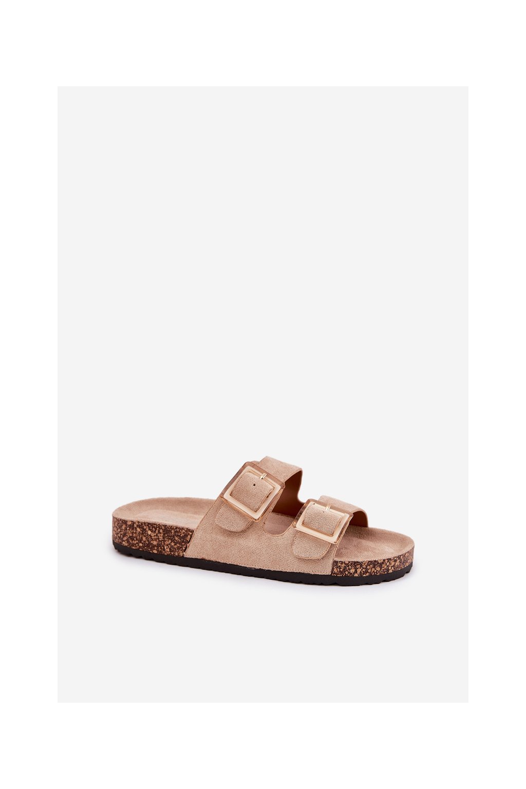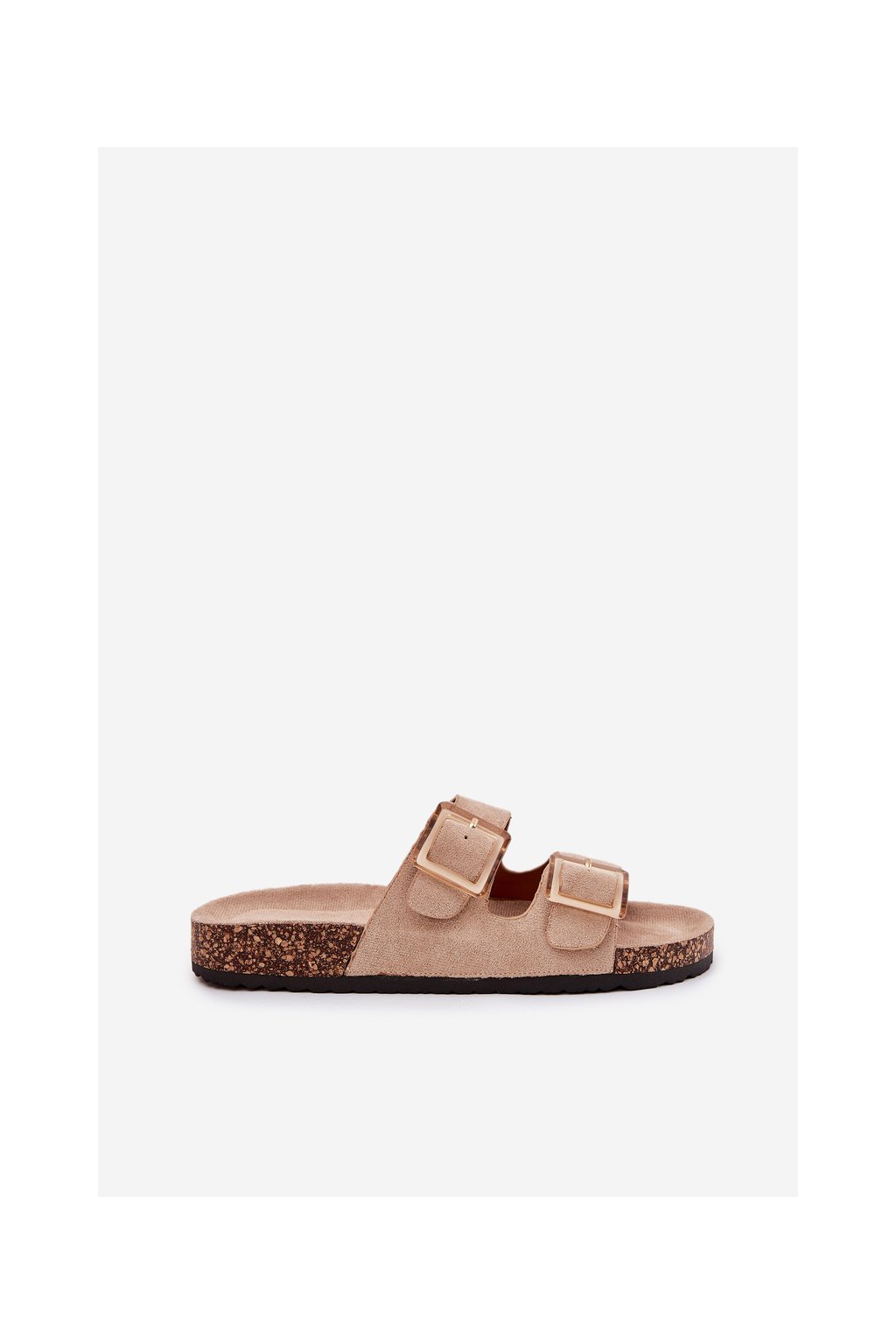 Béžové dámske papuče z eko semišu na korkovej podrážke s remienkami a zapínaním Slip-on, kód produktu THS-141 KHAKI