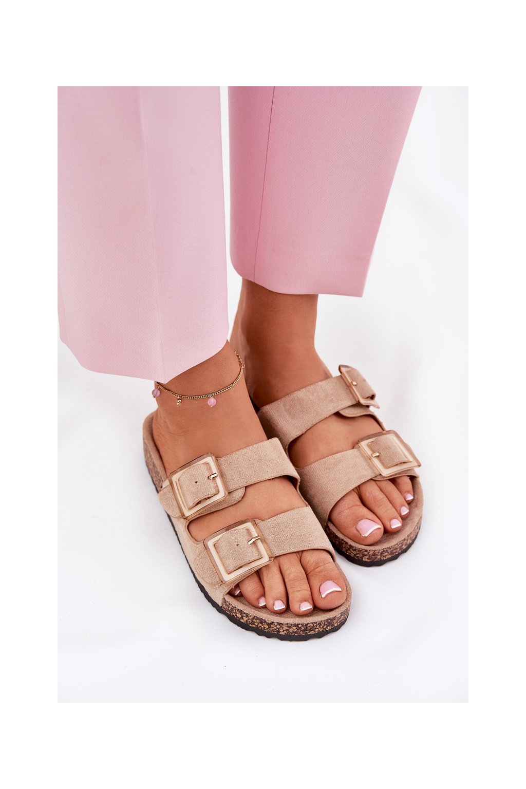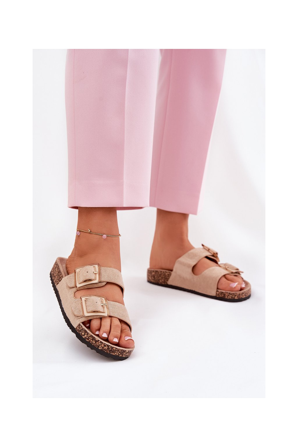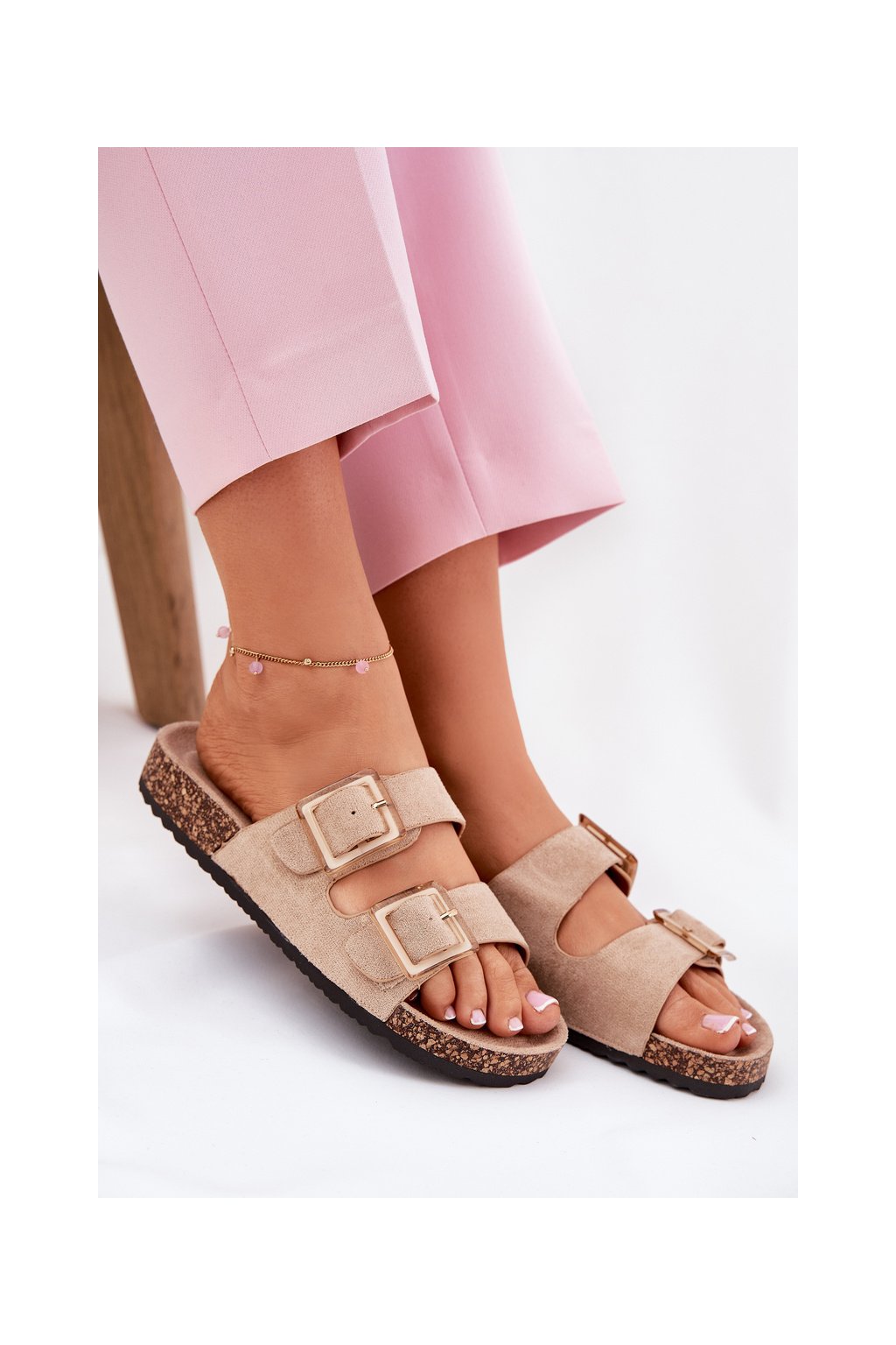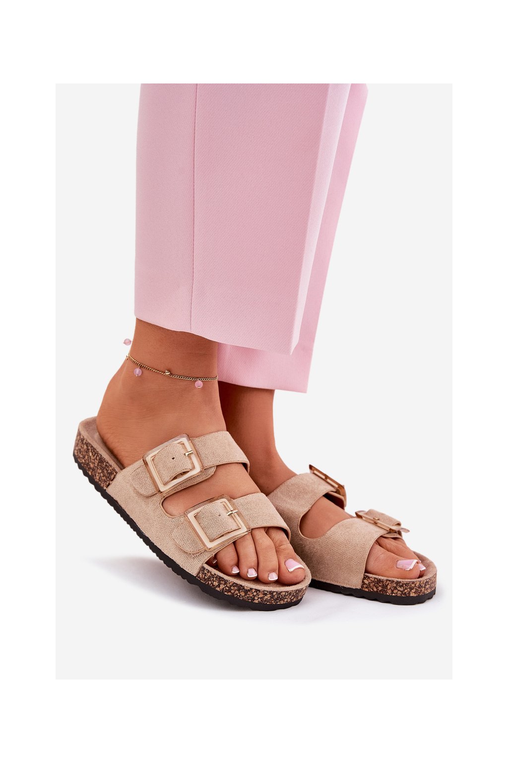 Béžové dámske papuče z eko semišu na korkovej podrážke s remienkami a zapínaním Slip-on, kód produktu THS-141 KHAKI