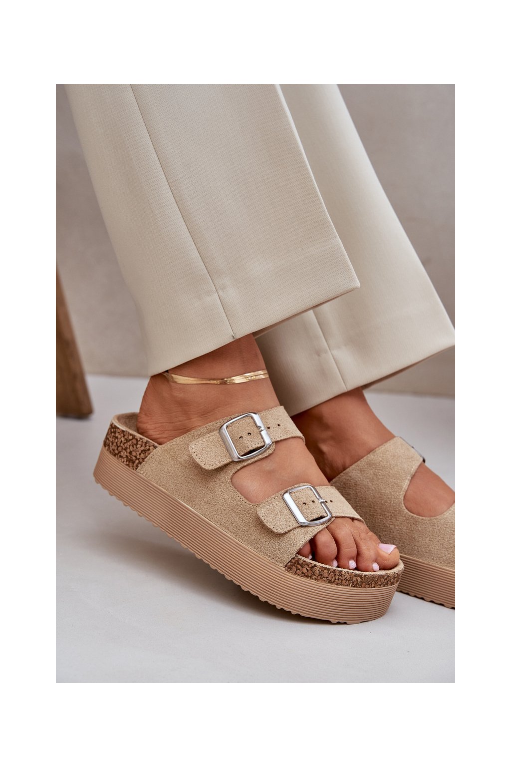 Dámske šľapky EKO semiš béžové na plošom podpätku, 24SD21-7310 BEIGE