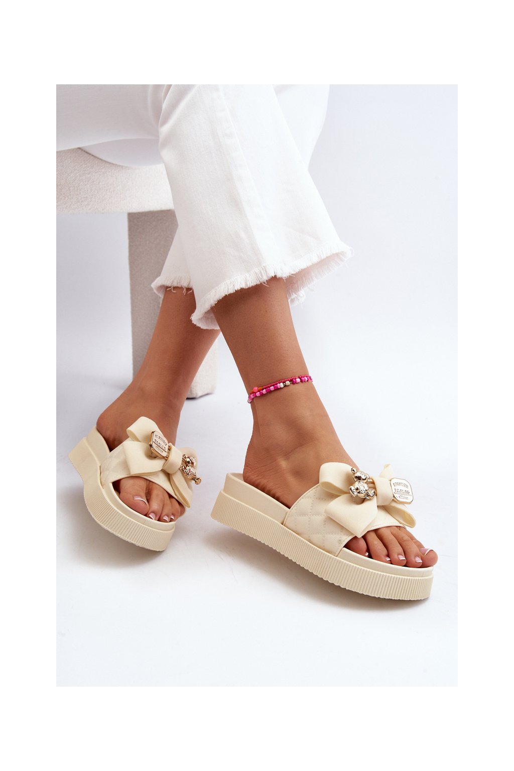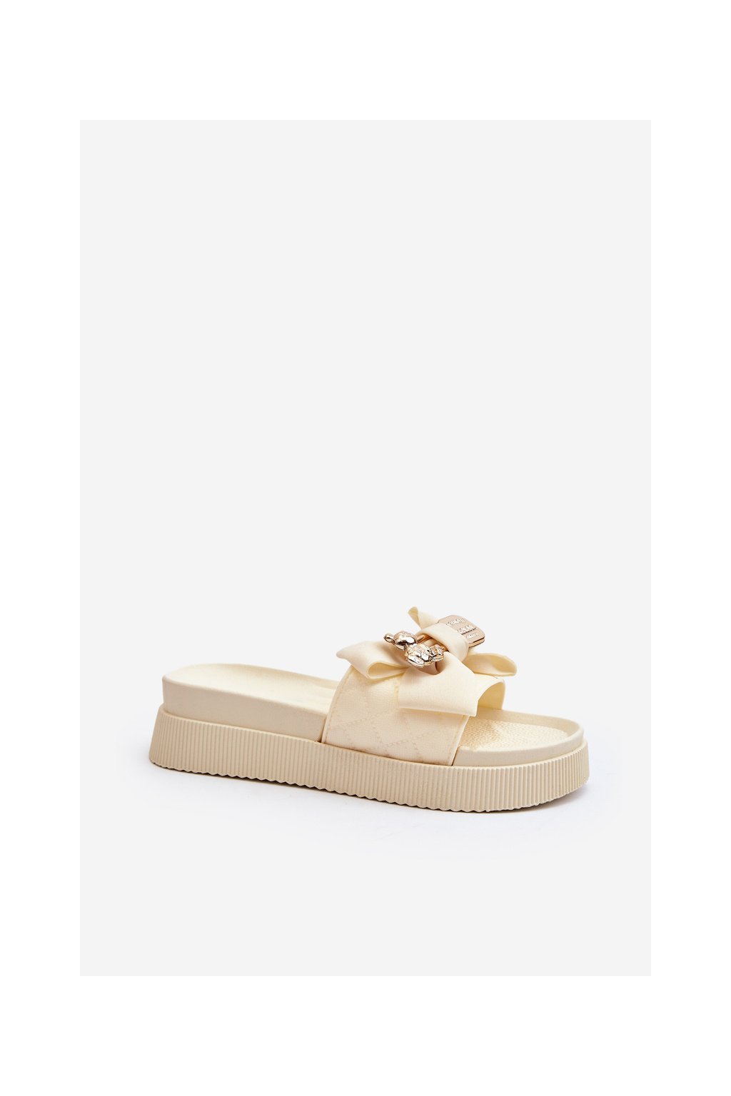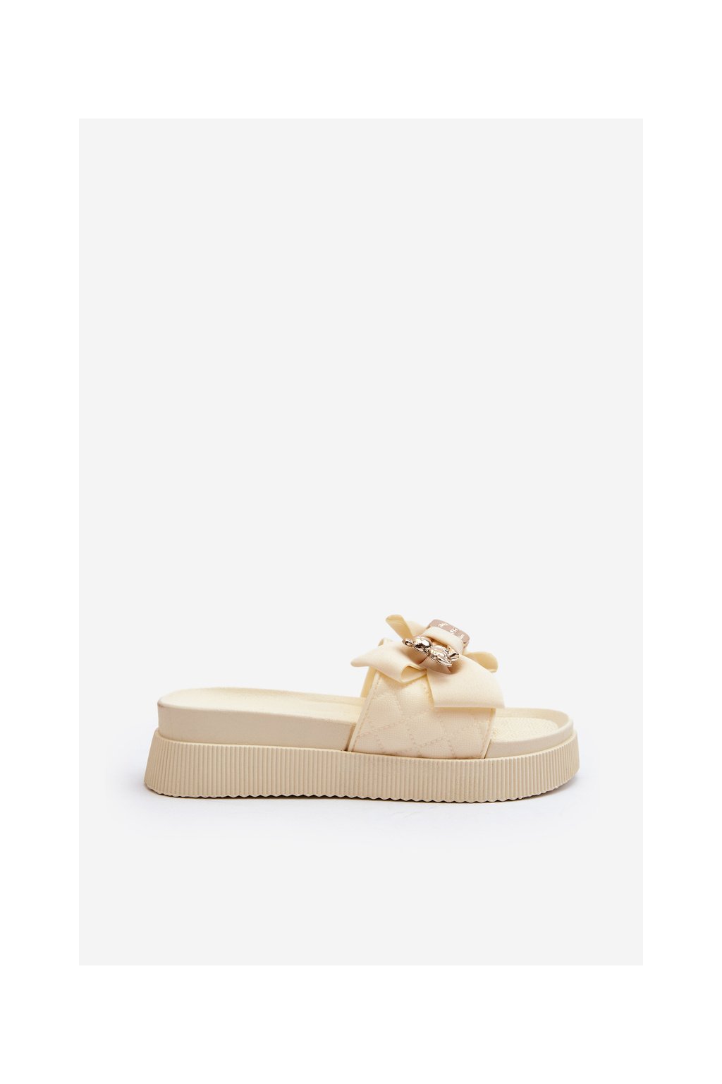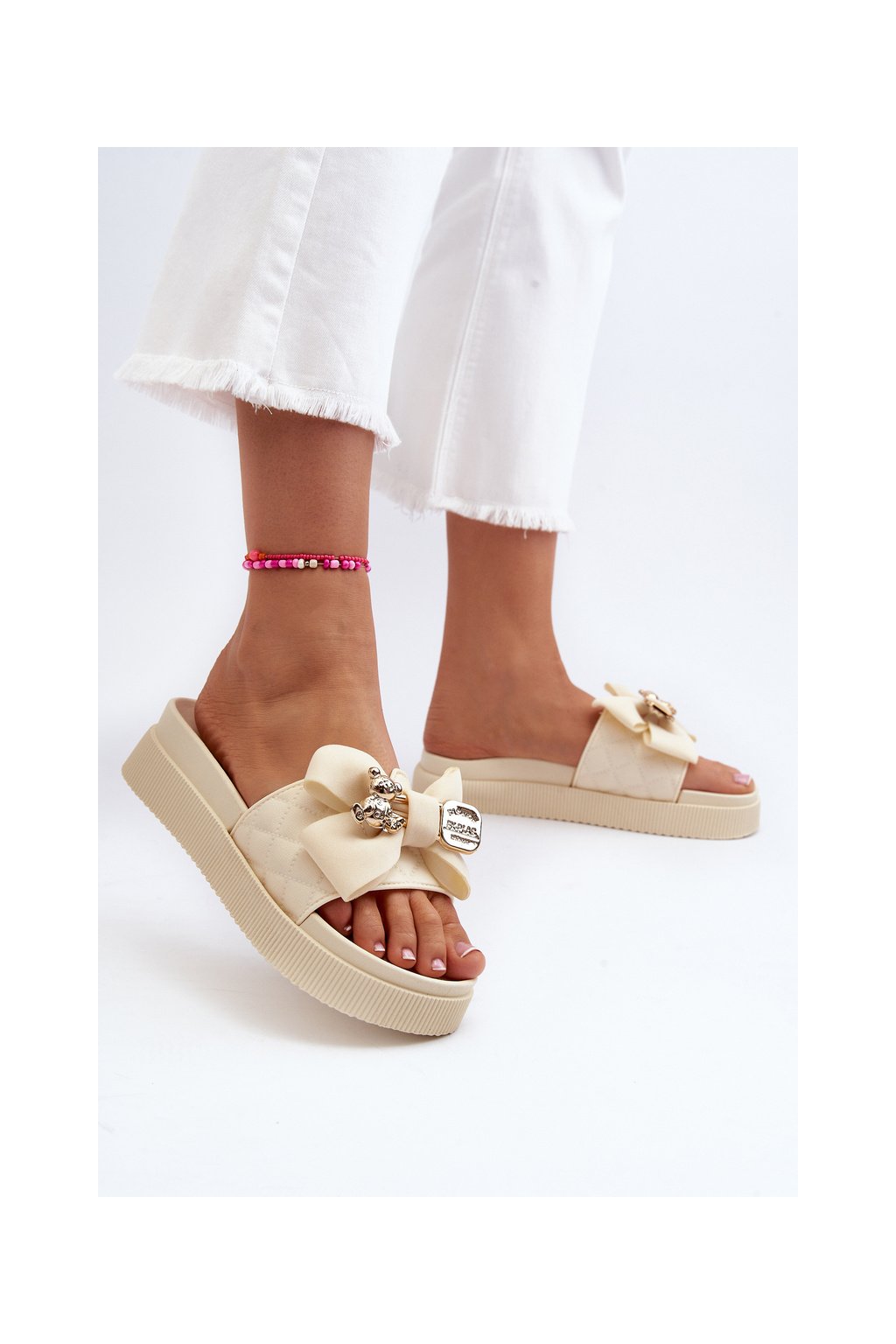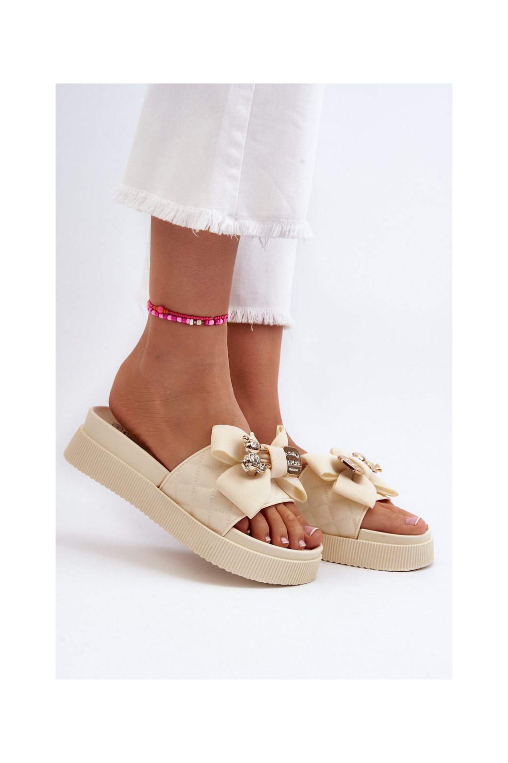 Béžové dámske šľapky z eko kože s mašľou a dekoratívnymi aplikáciami, kód produktu BG146P BEIGE