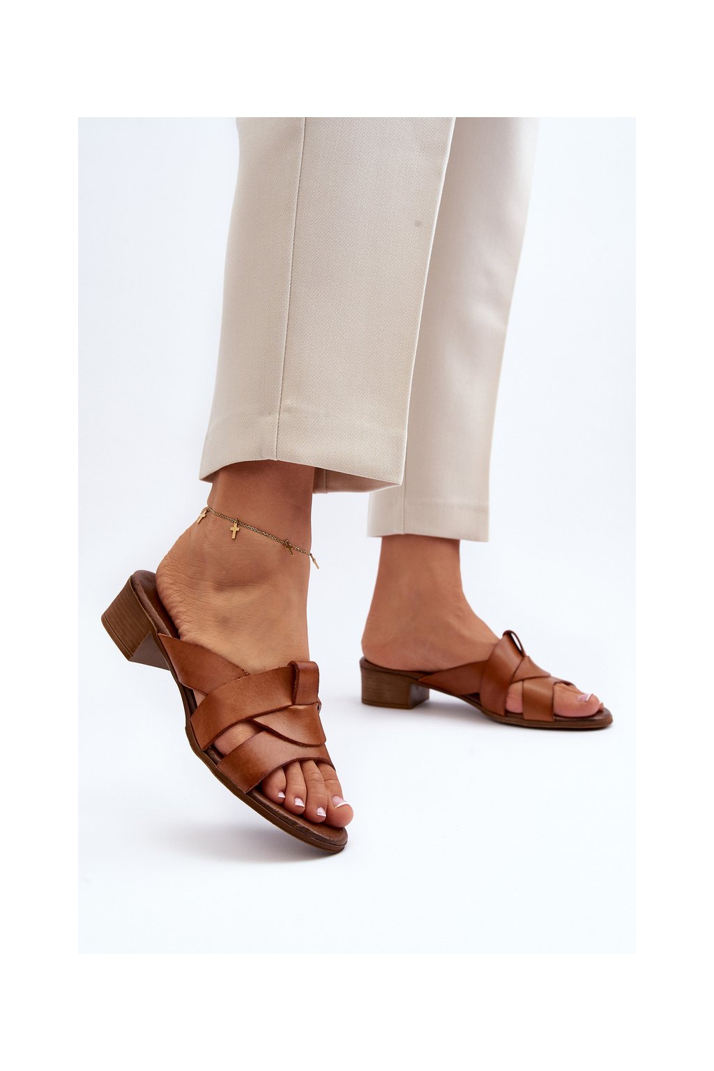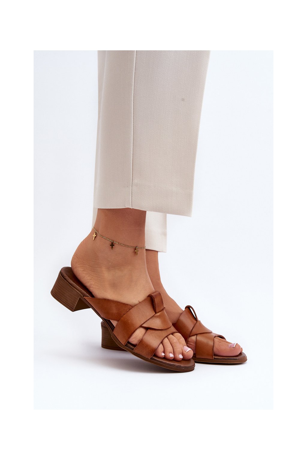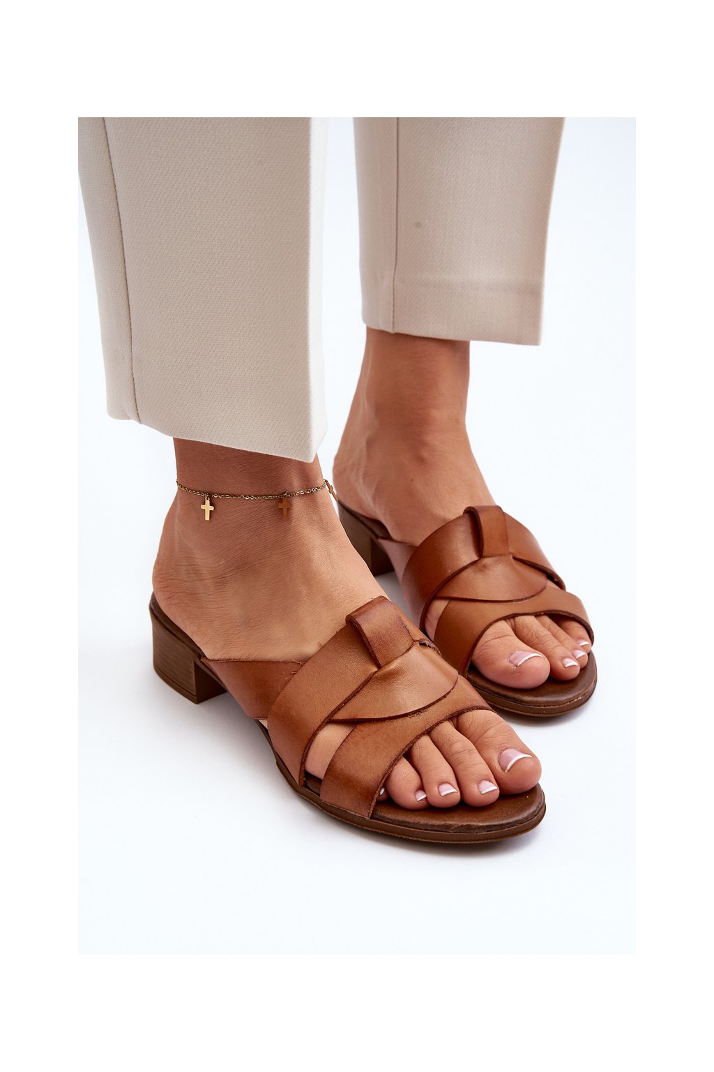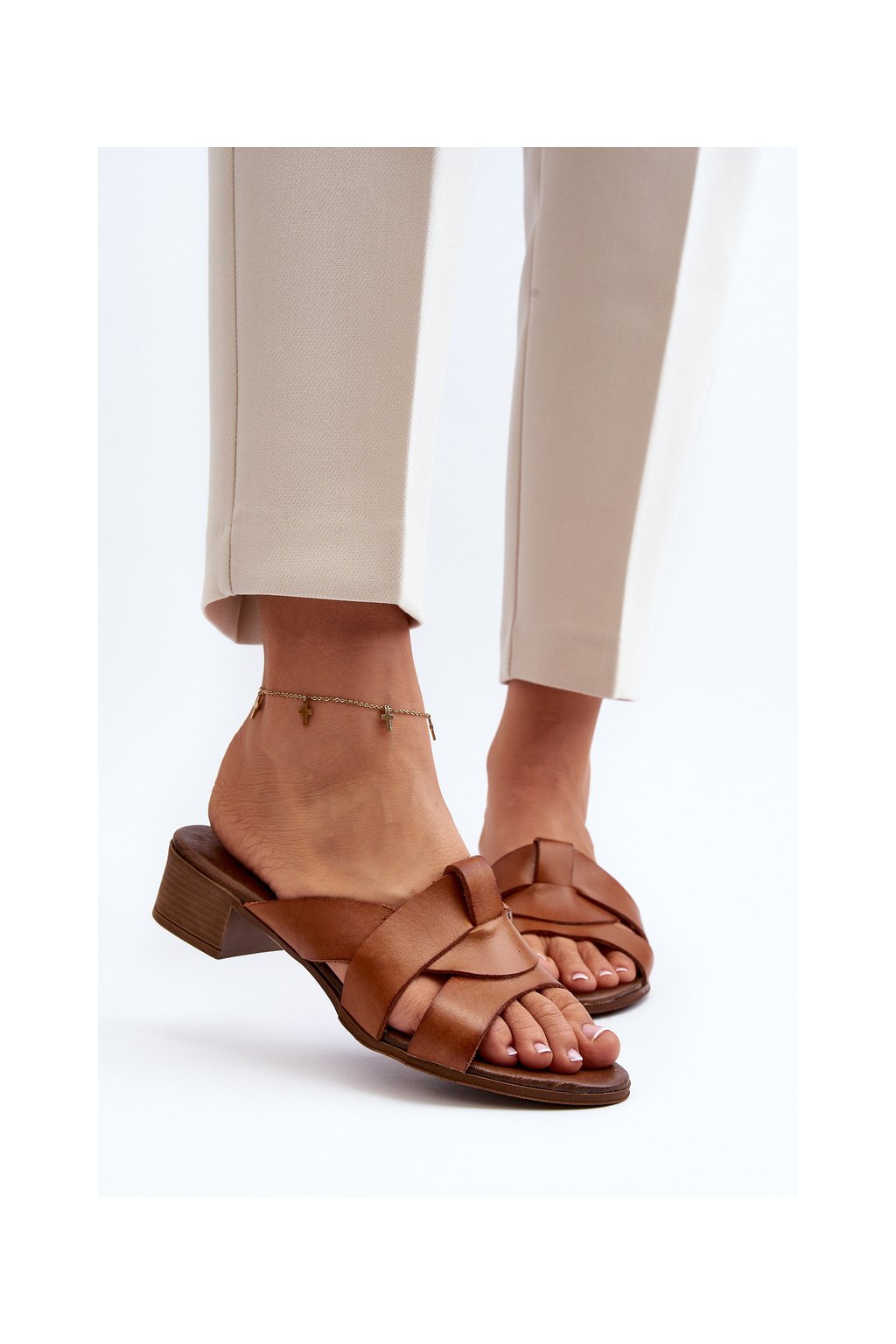 Hnedé dámske kožené šľapky na nízkom podpätku s prírodnou koženou stielkou, kód produktu 40236 BF.BRĄZ