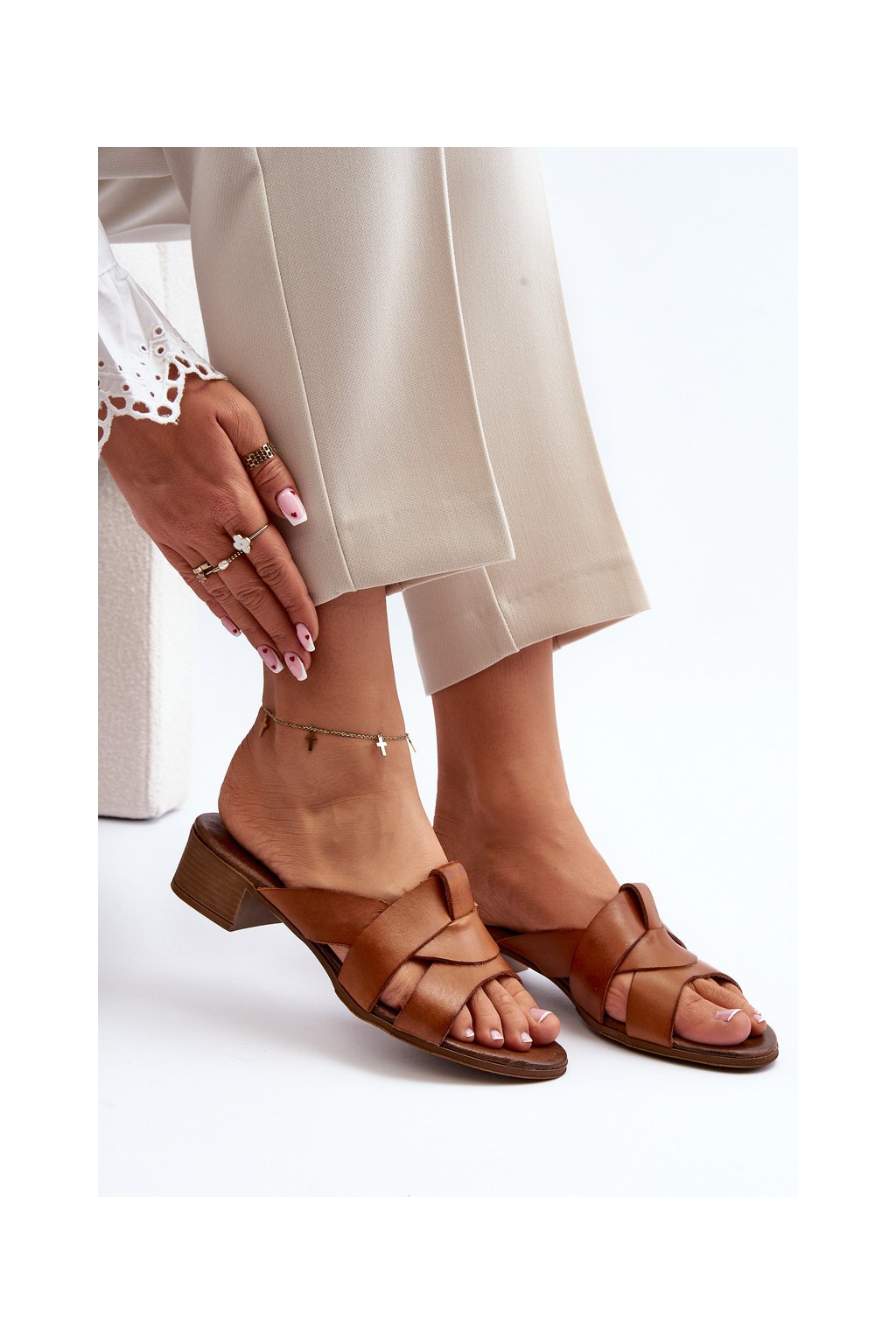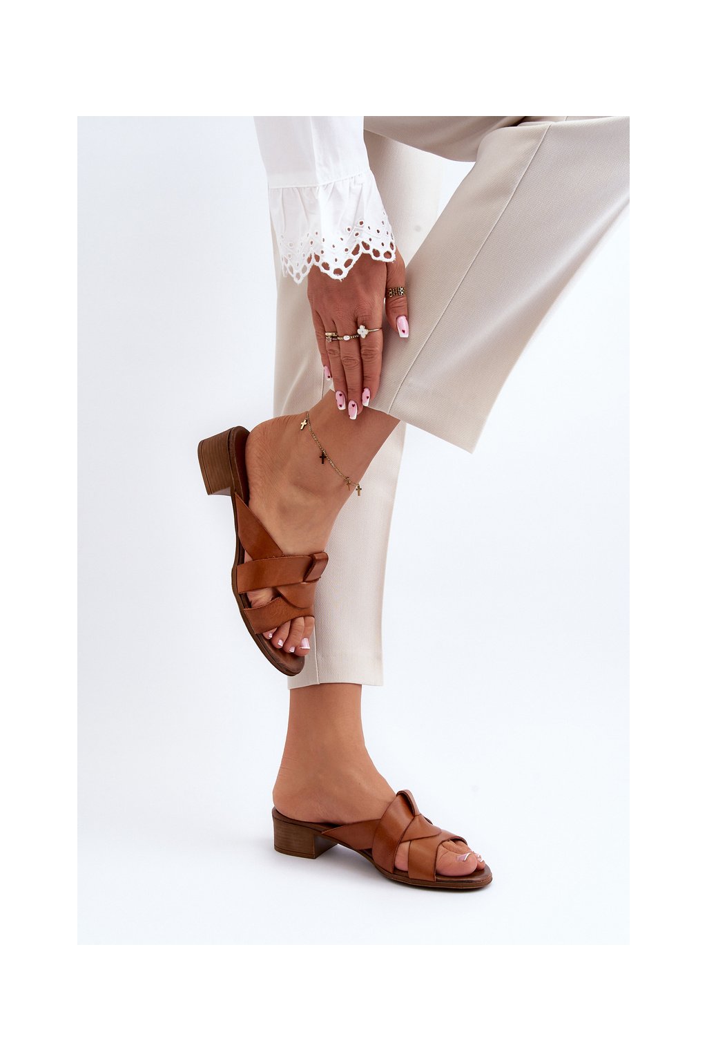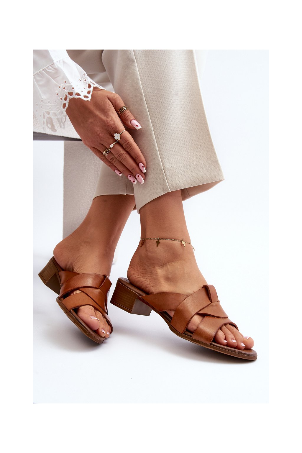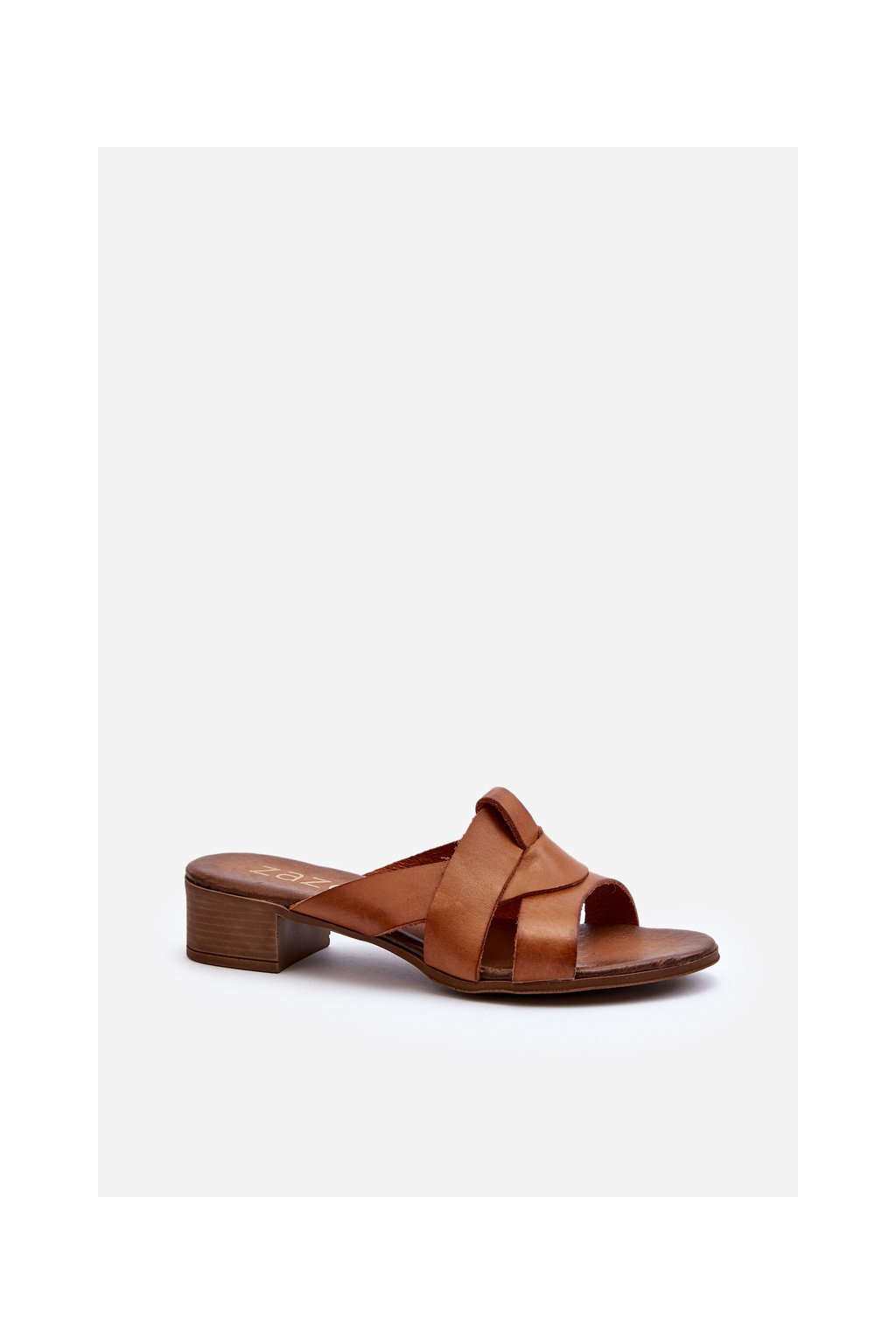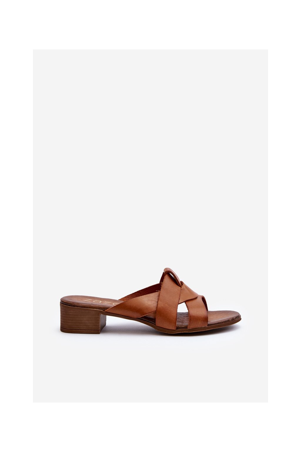 Hnedé dámske kožené šľapky na nízkom podpätku s prírodnou koženou stielkou, kód produktu 40236 BF.BRĄZ