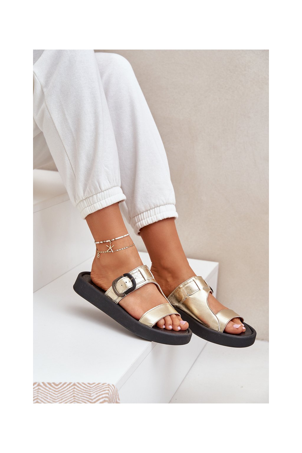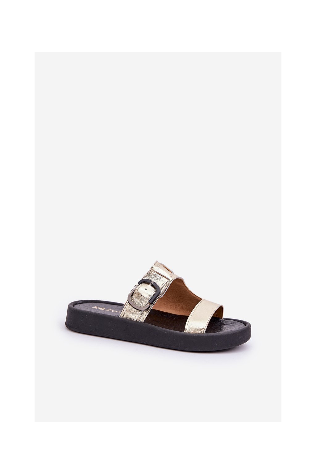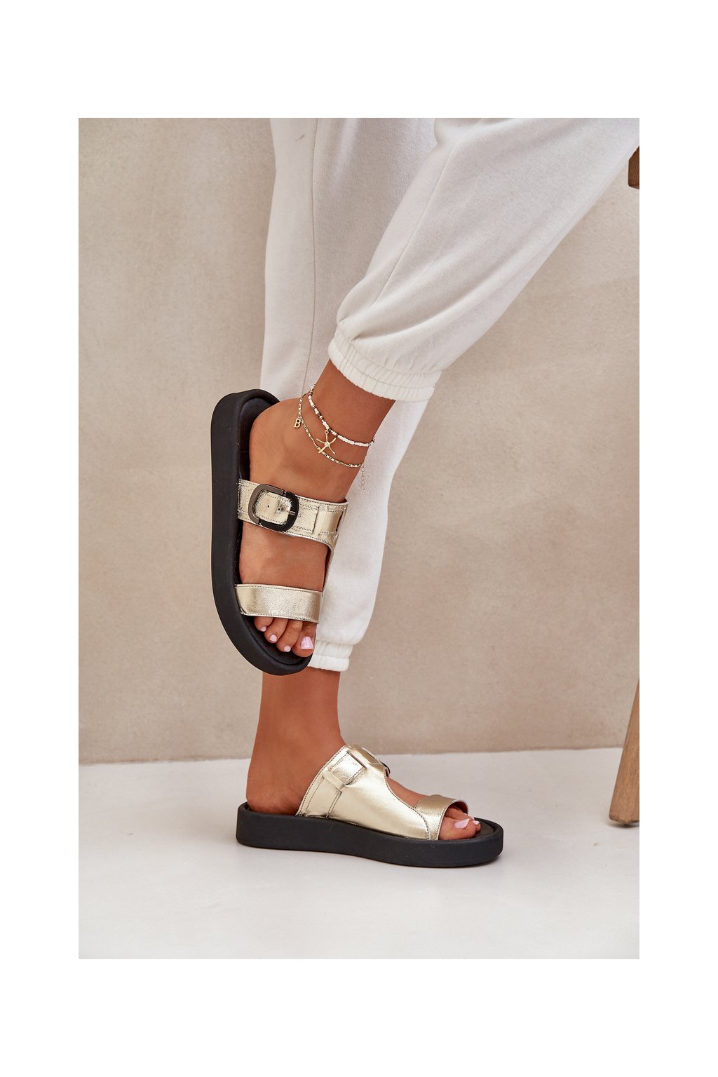 Dámske zlaté šľapky z prírodnej kože na rovnej podrážke, pohodlné sandále na leto, kód produktu 3024/007