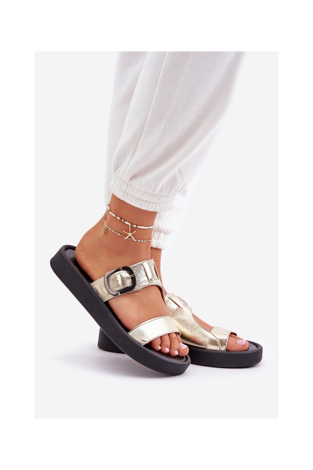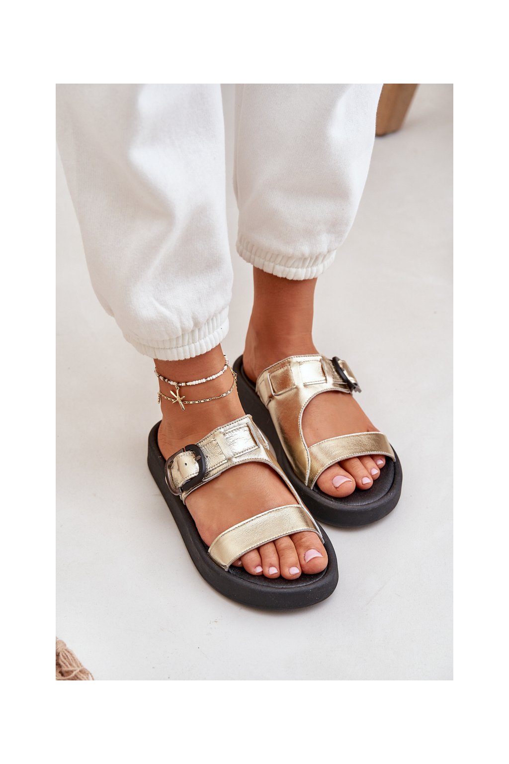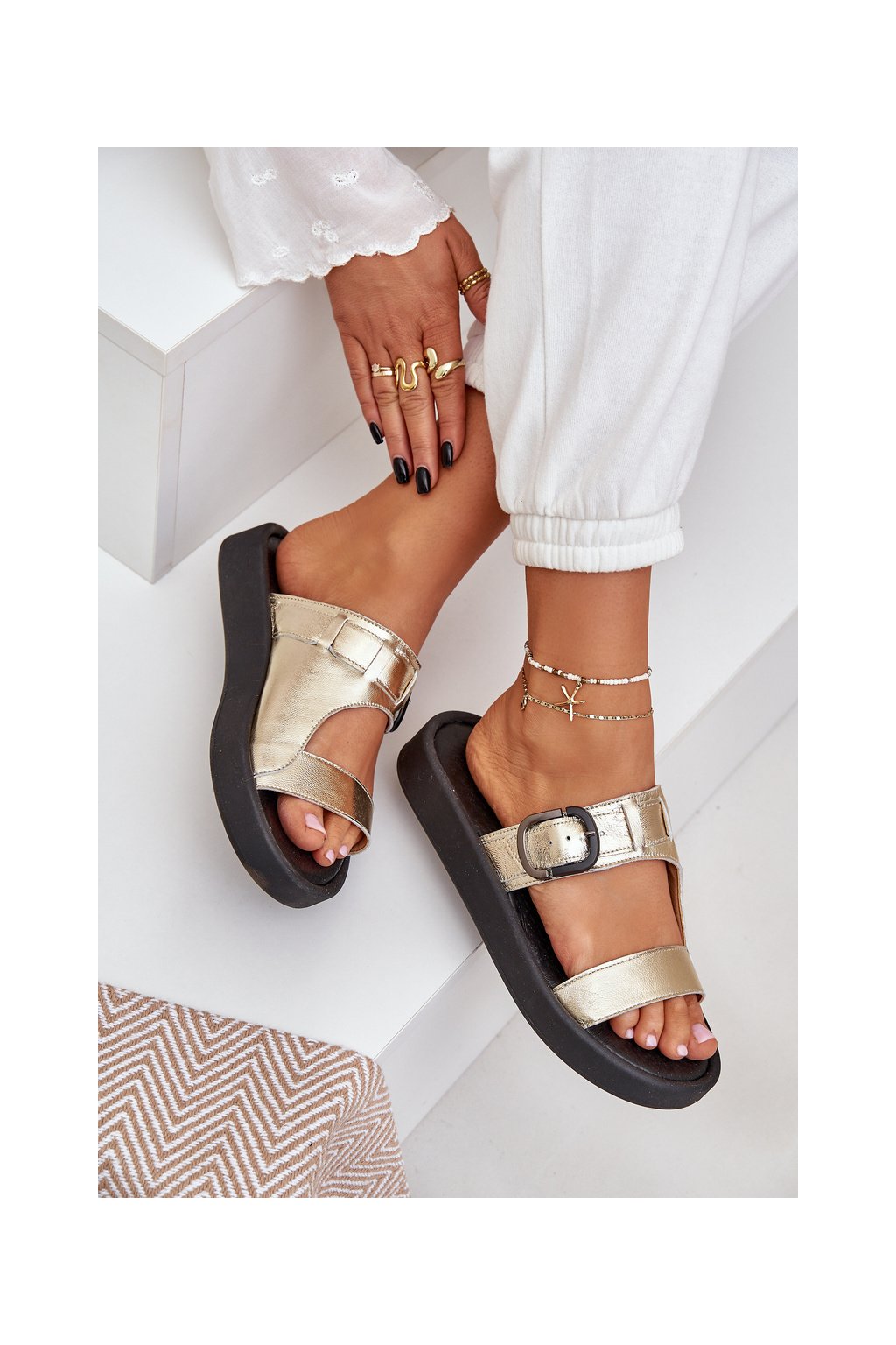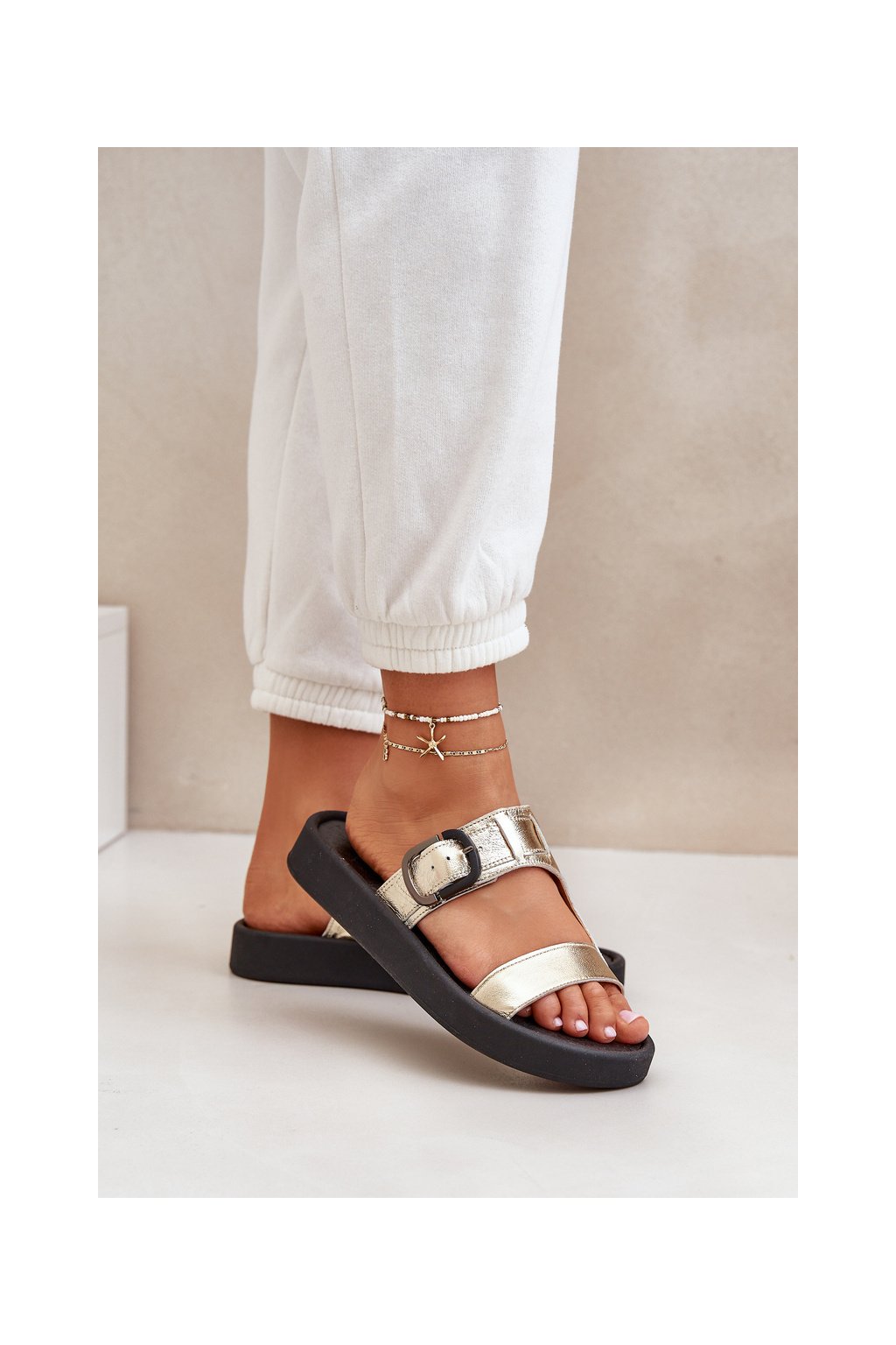 Dámske zlaté šľapky z prírodnej kože na rovnej podrážke, pohodlné sandále na leto, kód produktu 3024/007