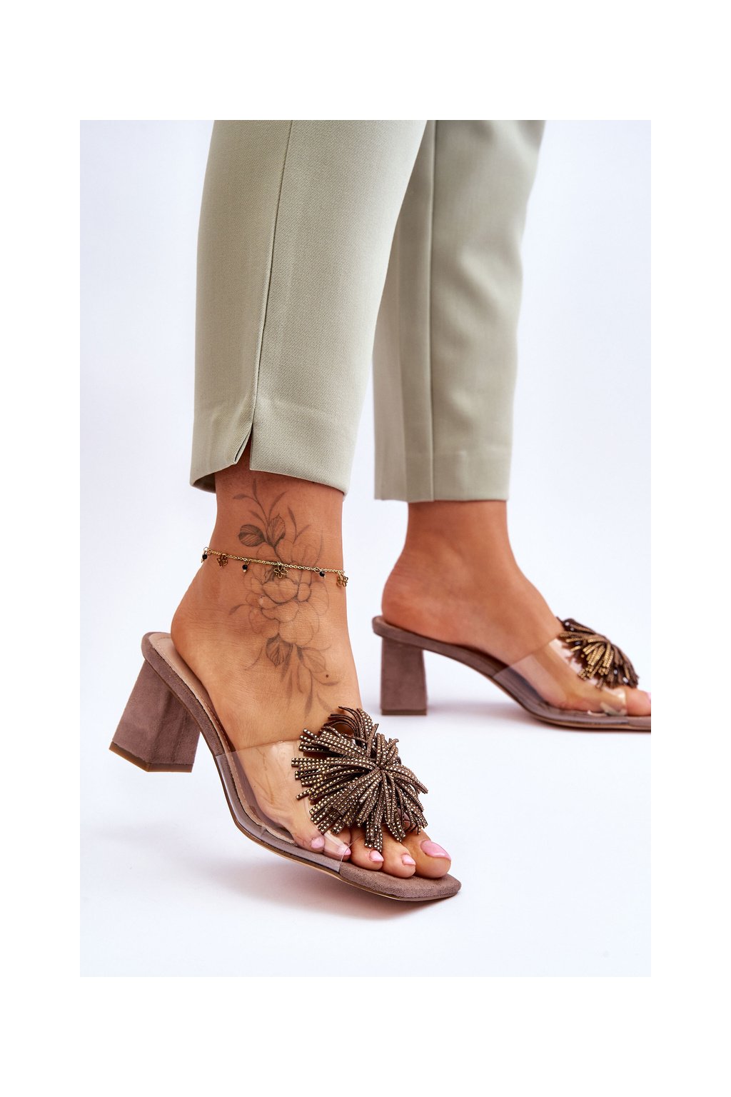 Hnedé dámske šľapky s nízkym podpätkom a bambuľkou KV-AP658-1 TAUPE