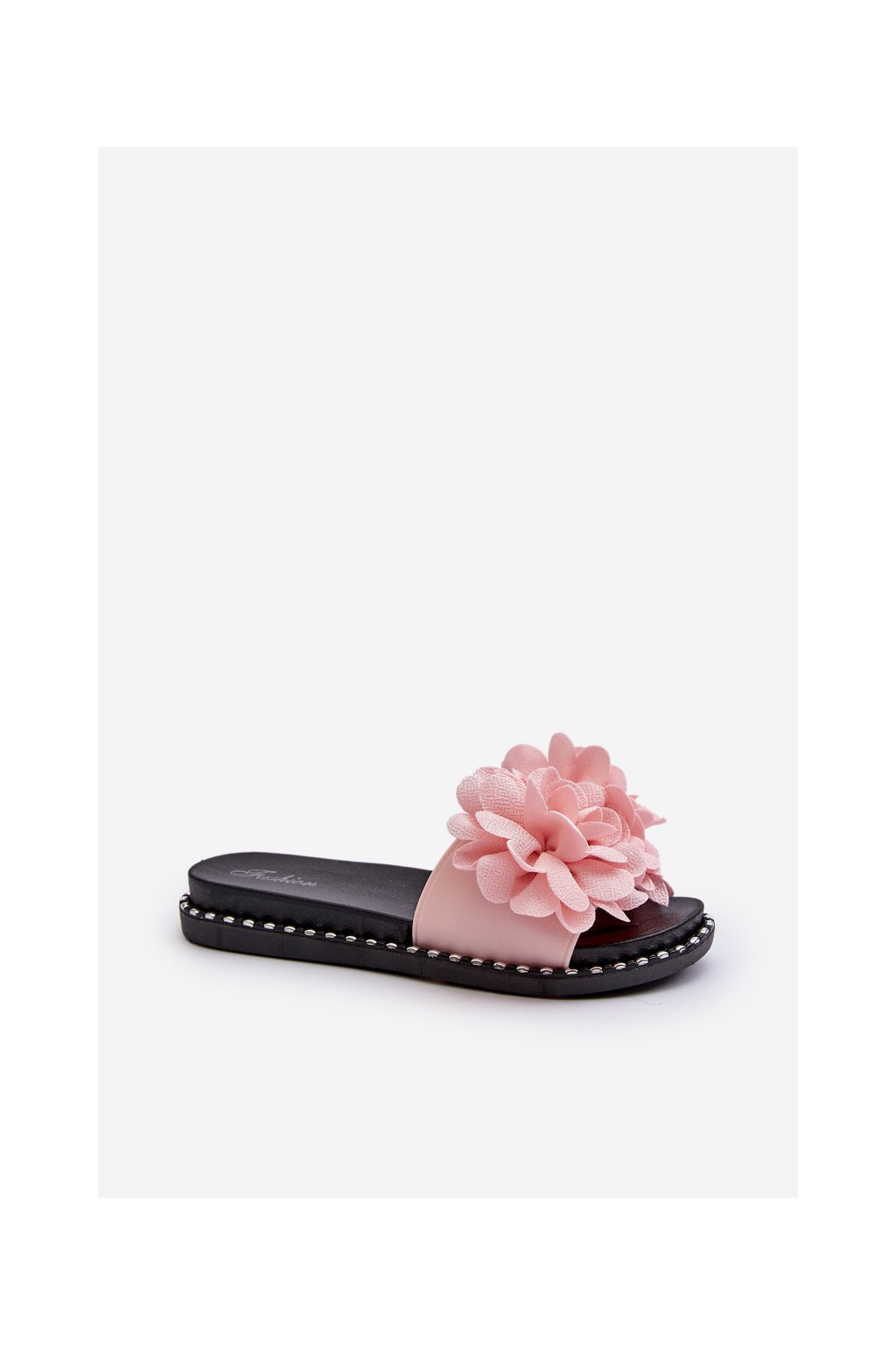 Ružové dámske textilné šľapky s kvetinovým zdobením na rovnej podrážke, kód produktu M360 PINK