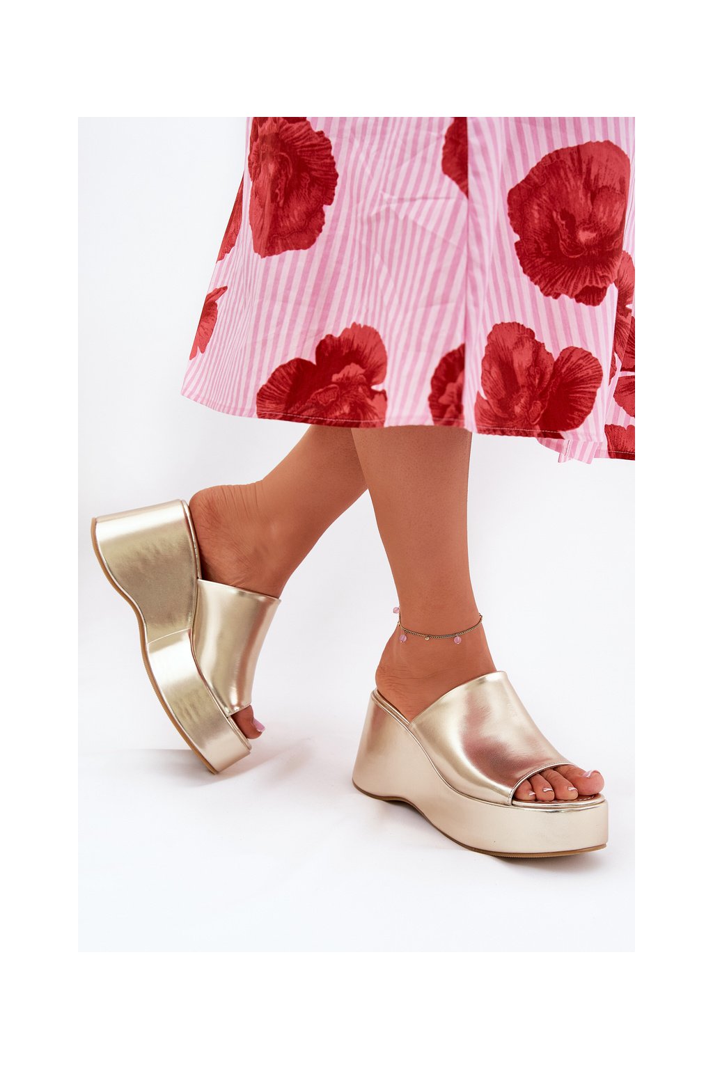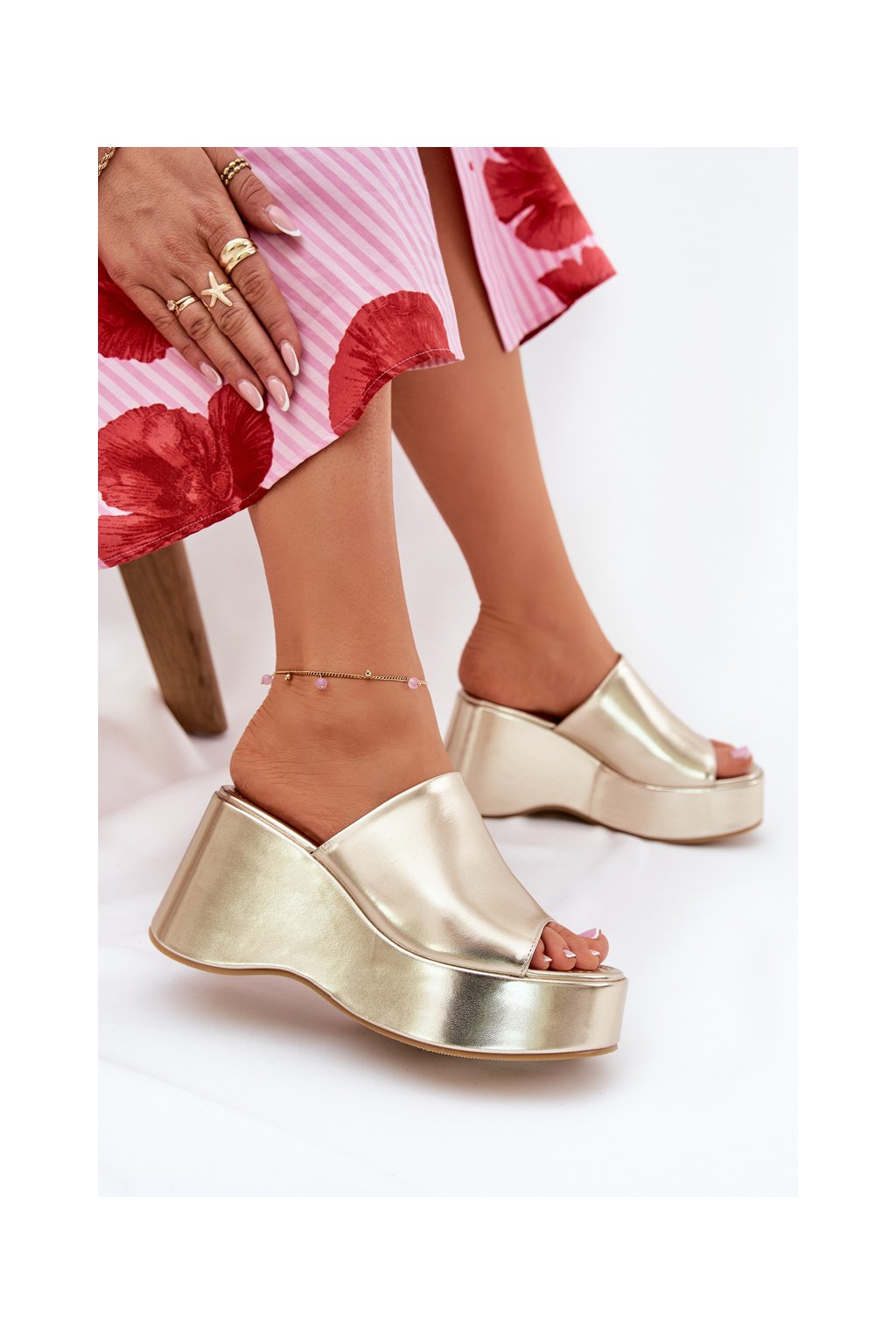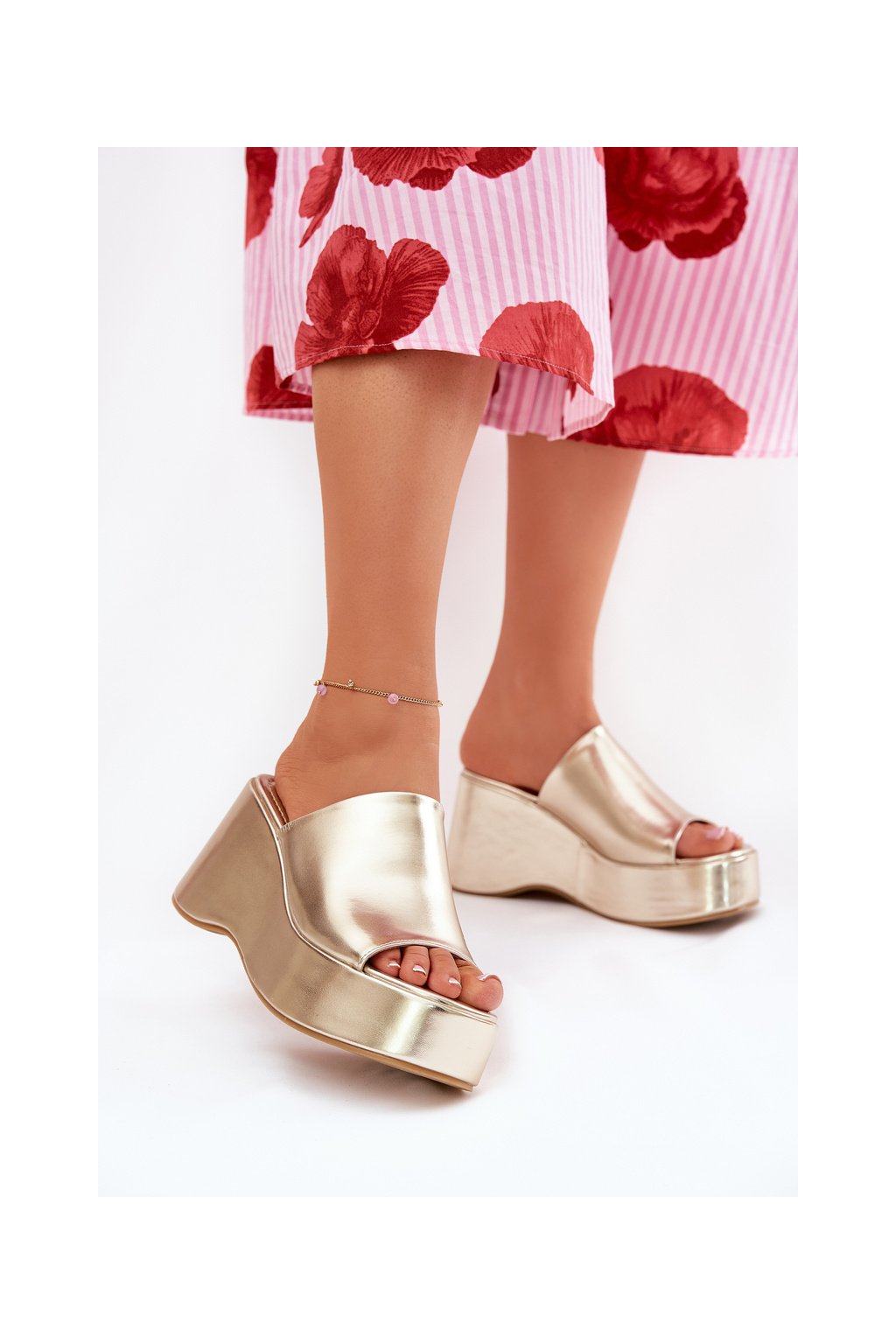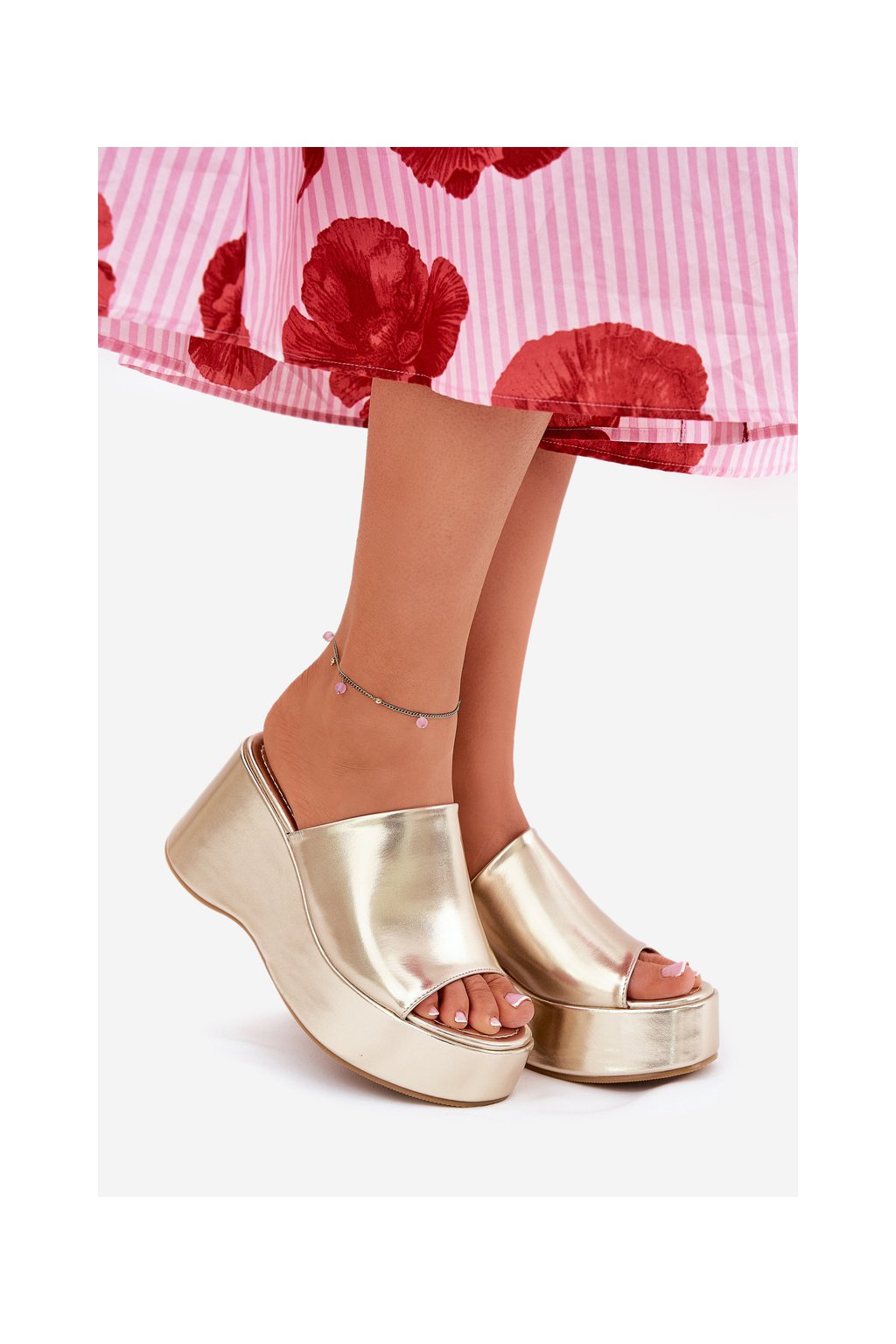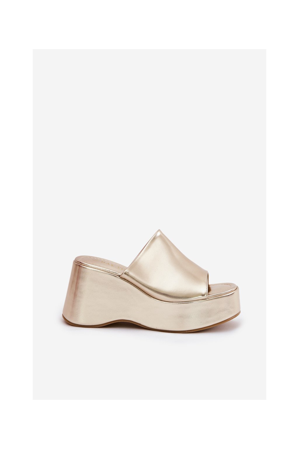 Zlaté dámske papuče z eko kože na platforme a klinovom podpätku, kód produktu 8338-305 GOLD