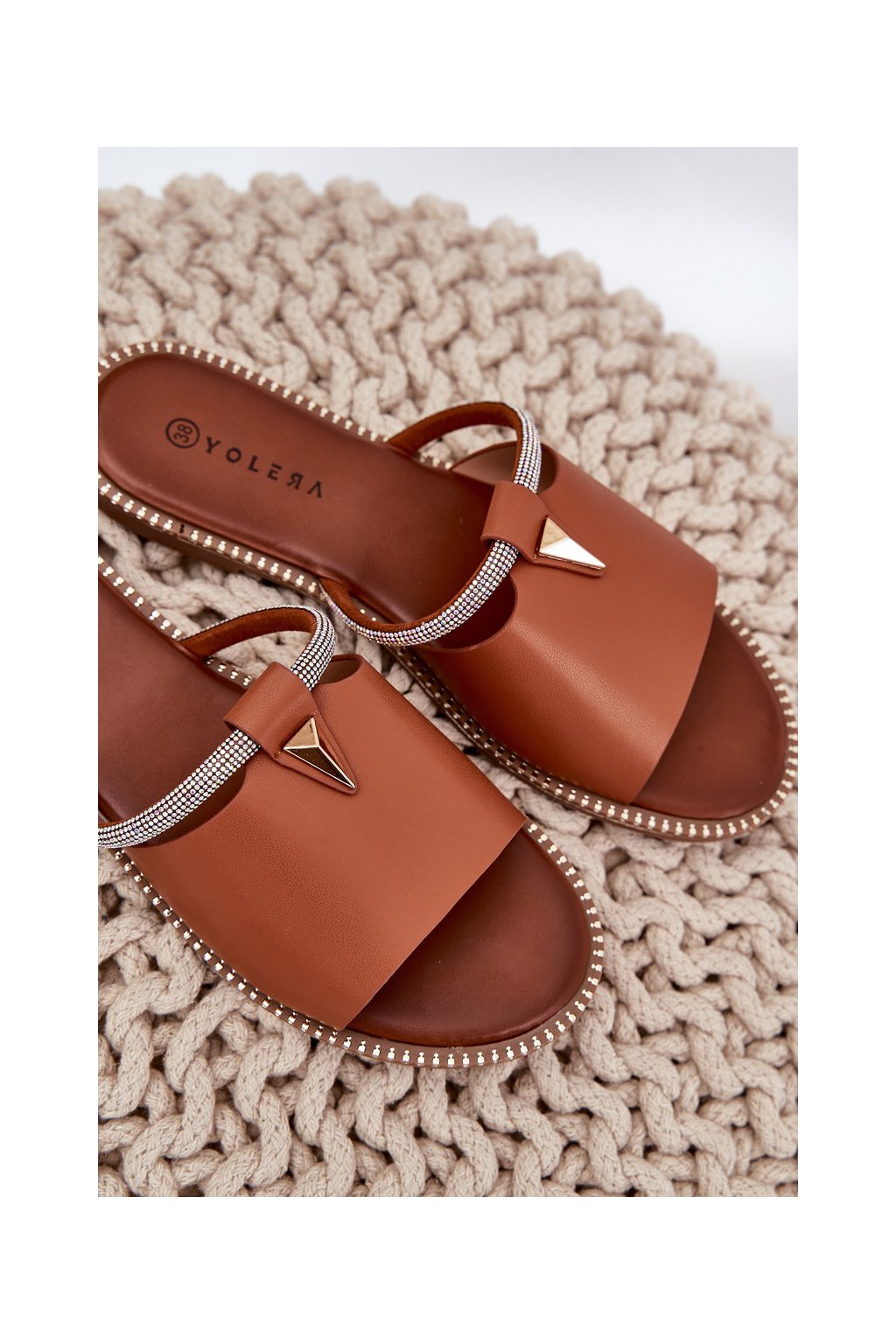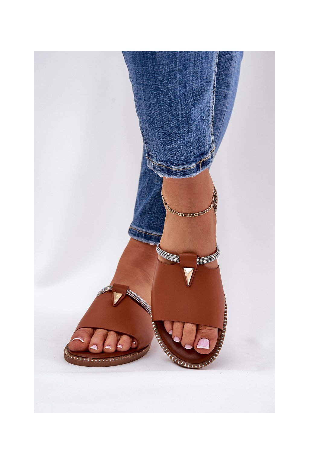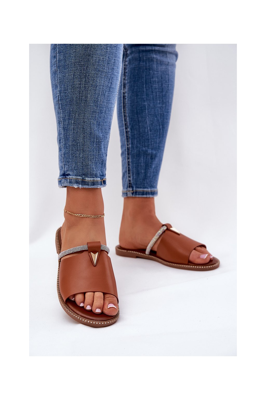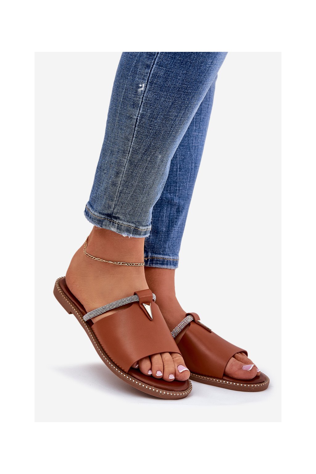 Hnedé dámske papuče z ekokože na rovnej podrážke s kryštálovým remienkom CAMEL GH5169-4