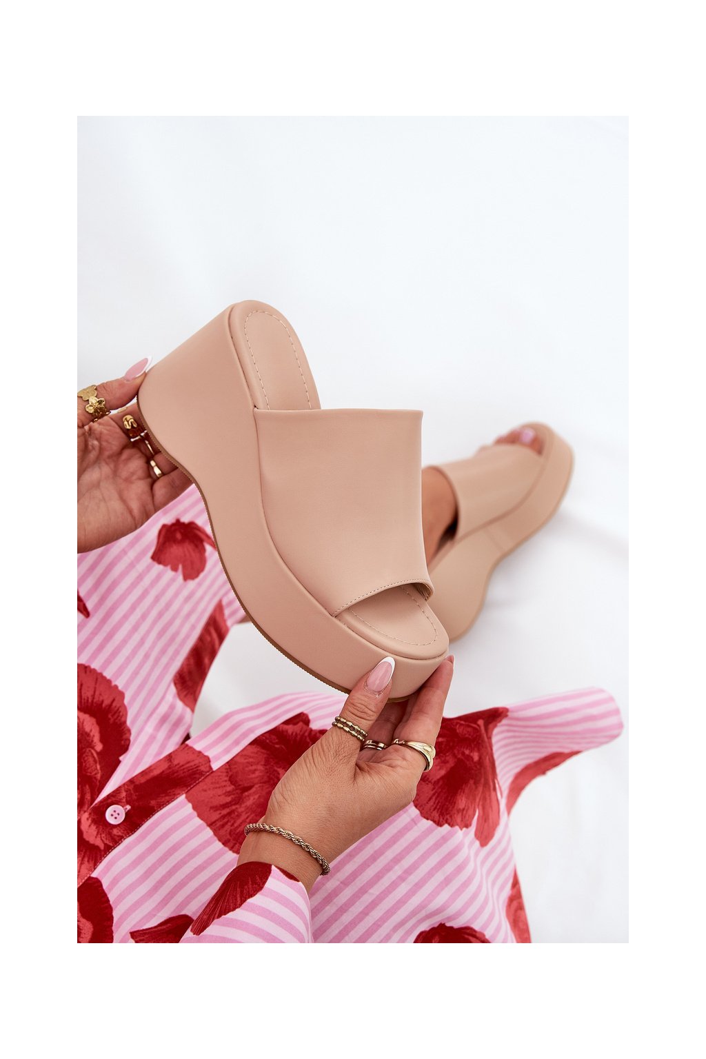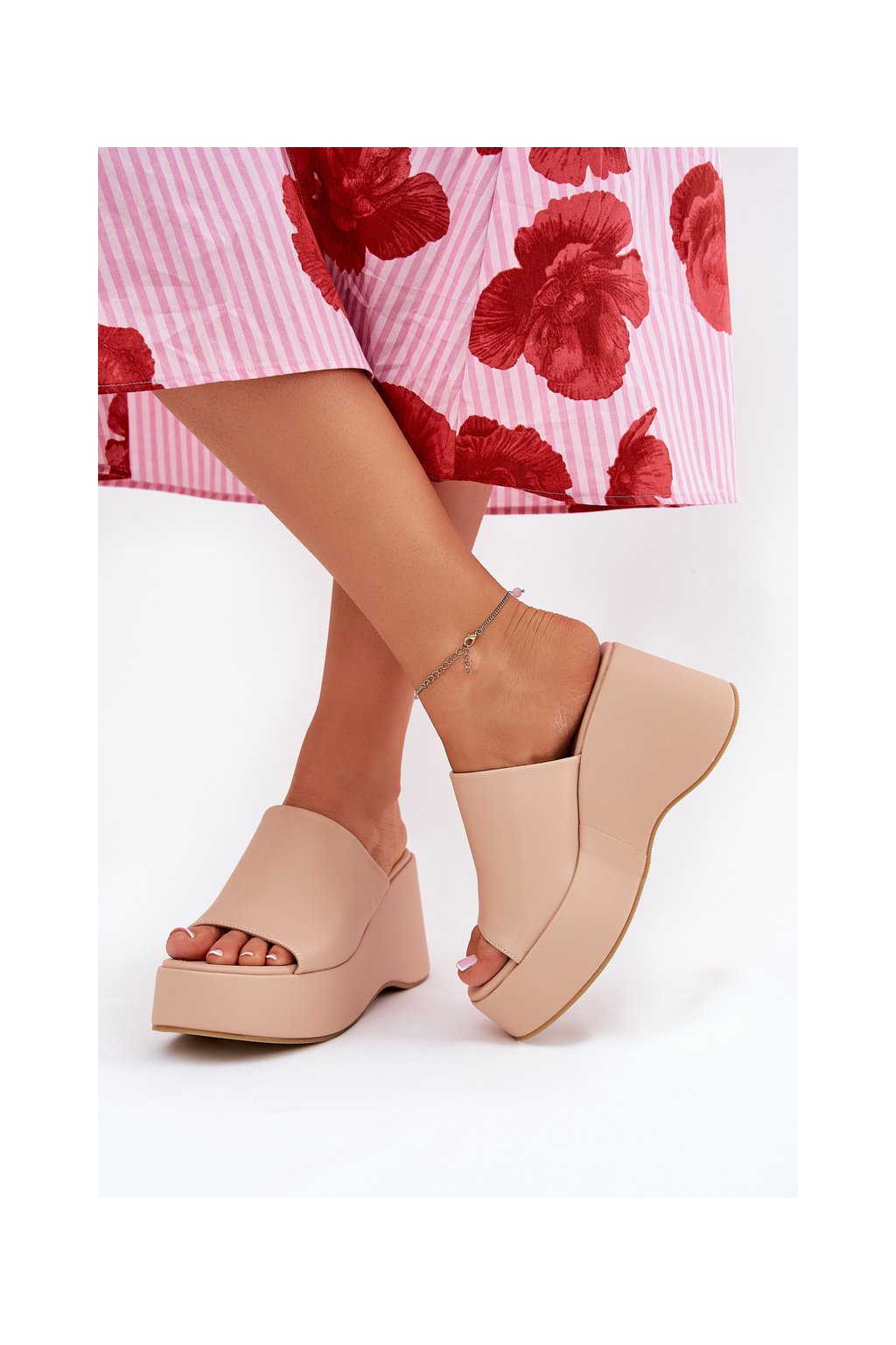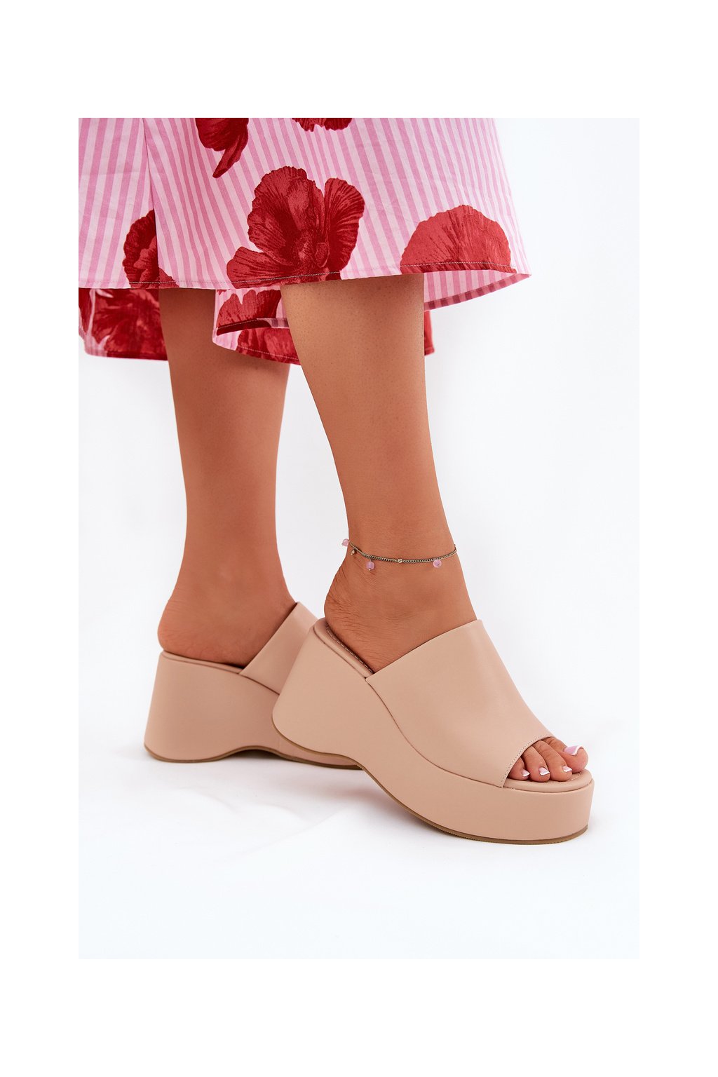 Sú osadené na platforme a klinčeku, poskytujú stabilitu a pohodlie počas celého dňa a zároveň opticky predlžujú nohy a zvýrazňujú siluetu. Mäkká stielka zaručuje pohodlné nosenie, poskytuje dostatočné odpruženie a pohodlie pri chôdzi. Tieto papuče sa skvele hodia na každodenné štylizácie, ideálne sú k letným šatám, sukniam alebo nohaviciam. Pri výbere veľkosti sa riaďte tabuľkou veľkostí.