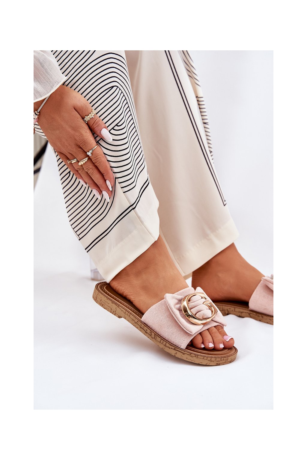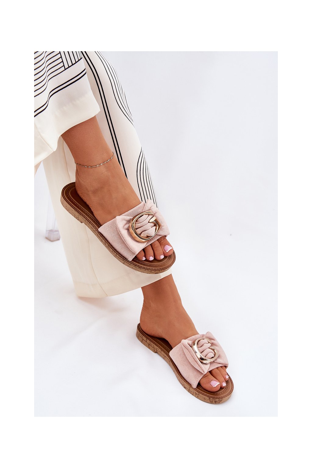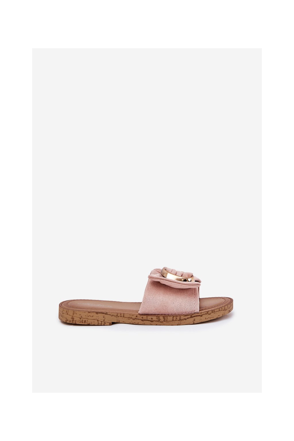 Ružové dámske sandále z eko semišu s ozdobnými zlatými detailmi na rovnej podrážke, kód produktu M578 PINK