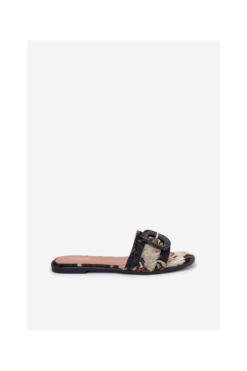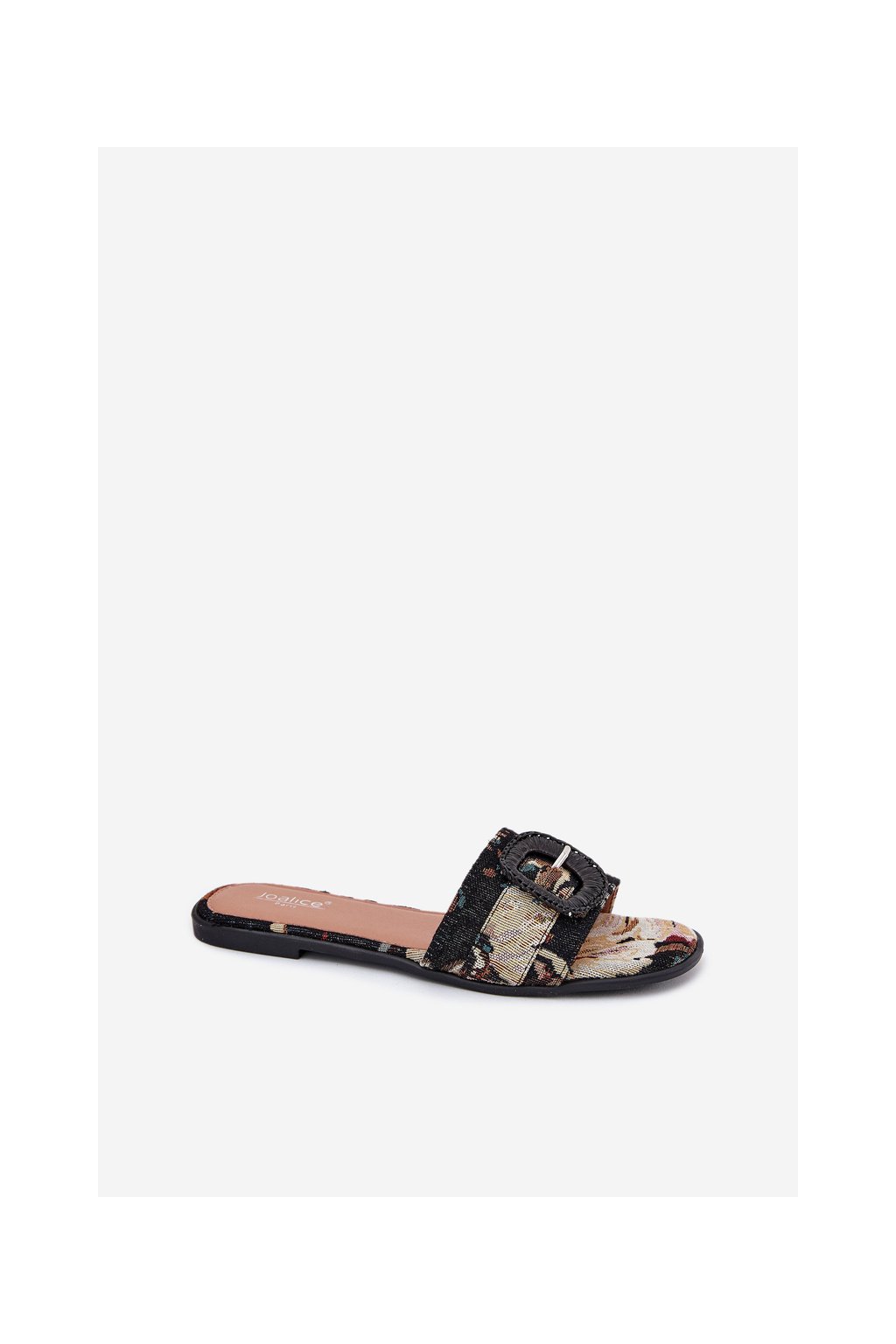 Čierne dámske textilné šľapky na rovnej podrážke s dekoratívnou sponou, kód produktu G469 BLACK