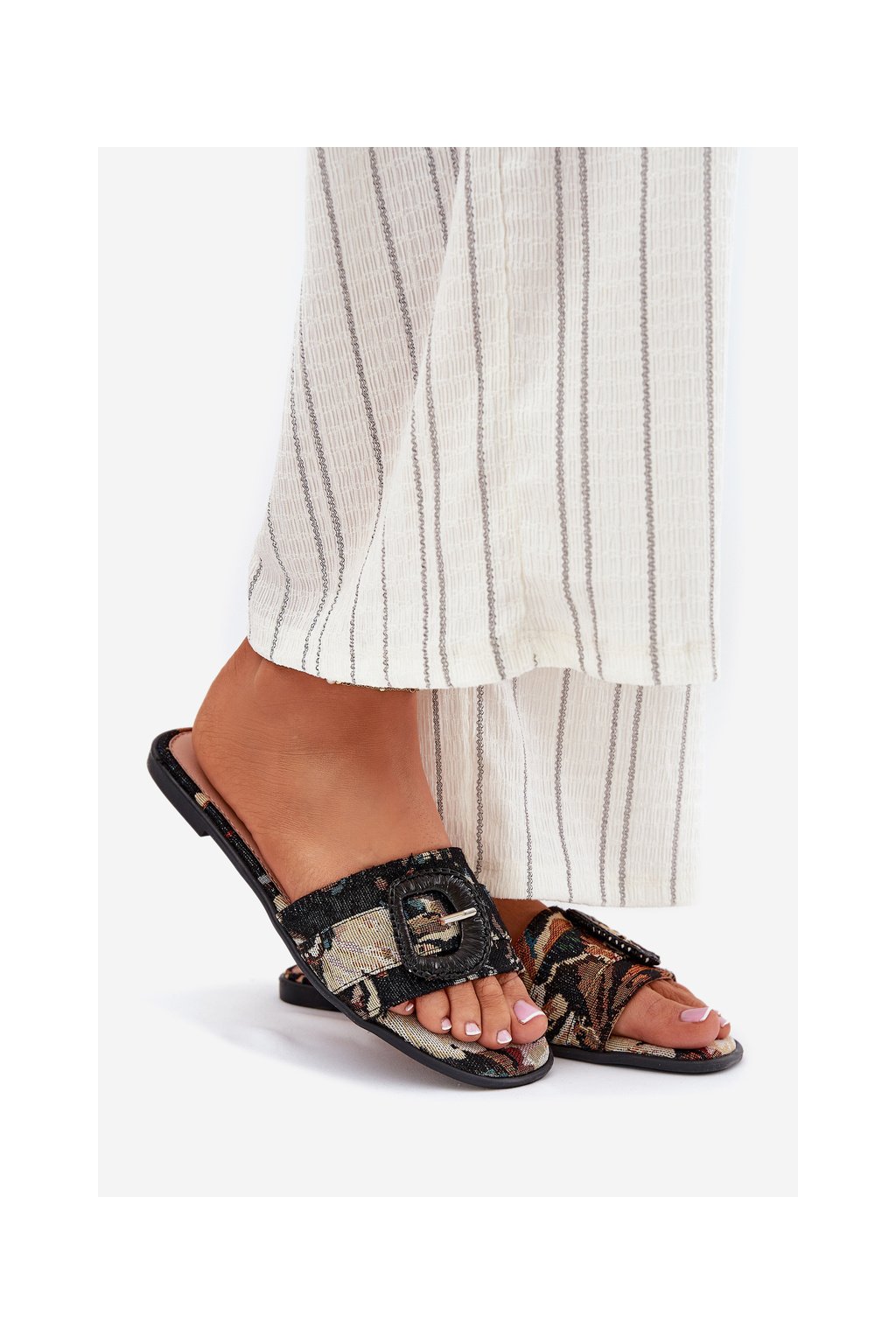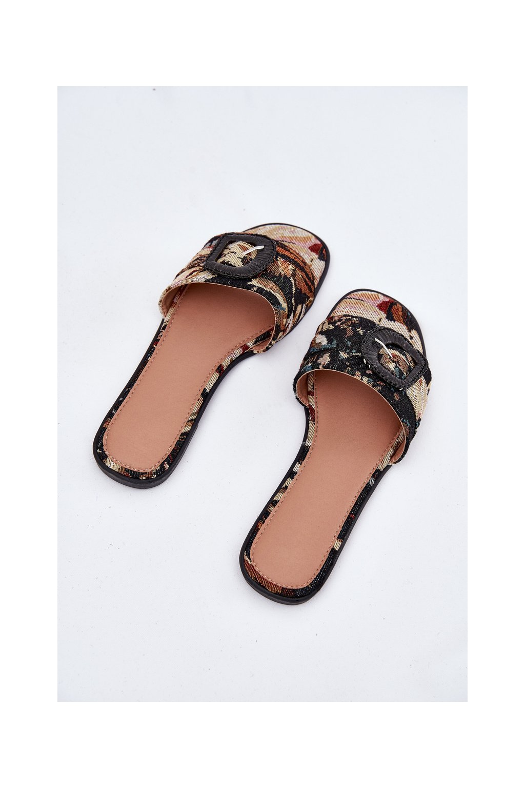 Dámske papuče na plochom podpätku z textilného materiálu.