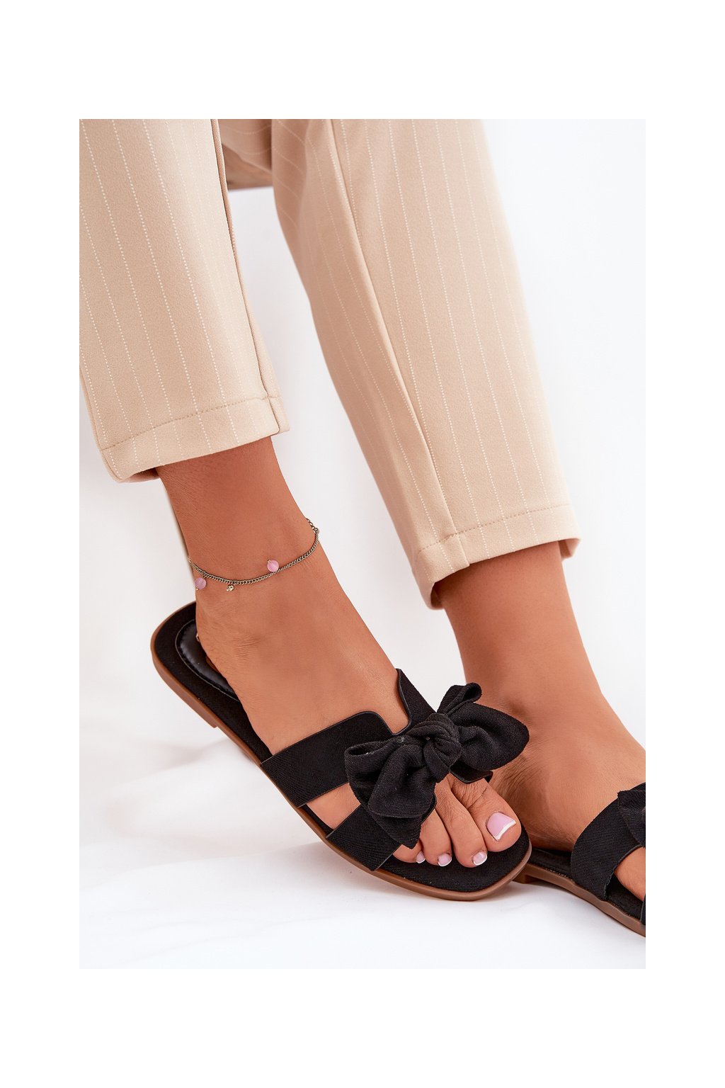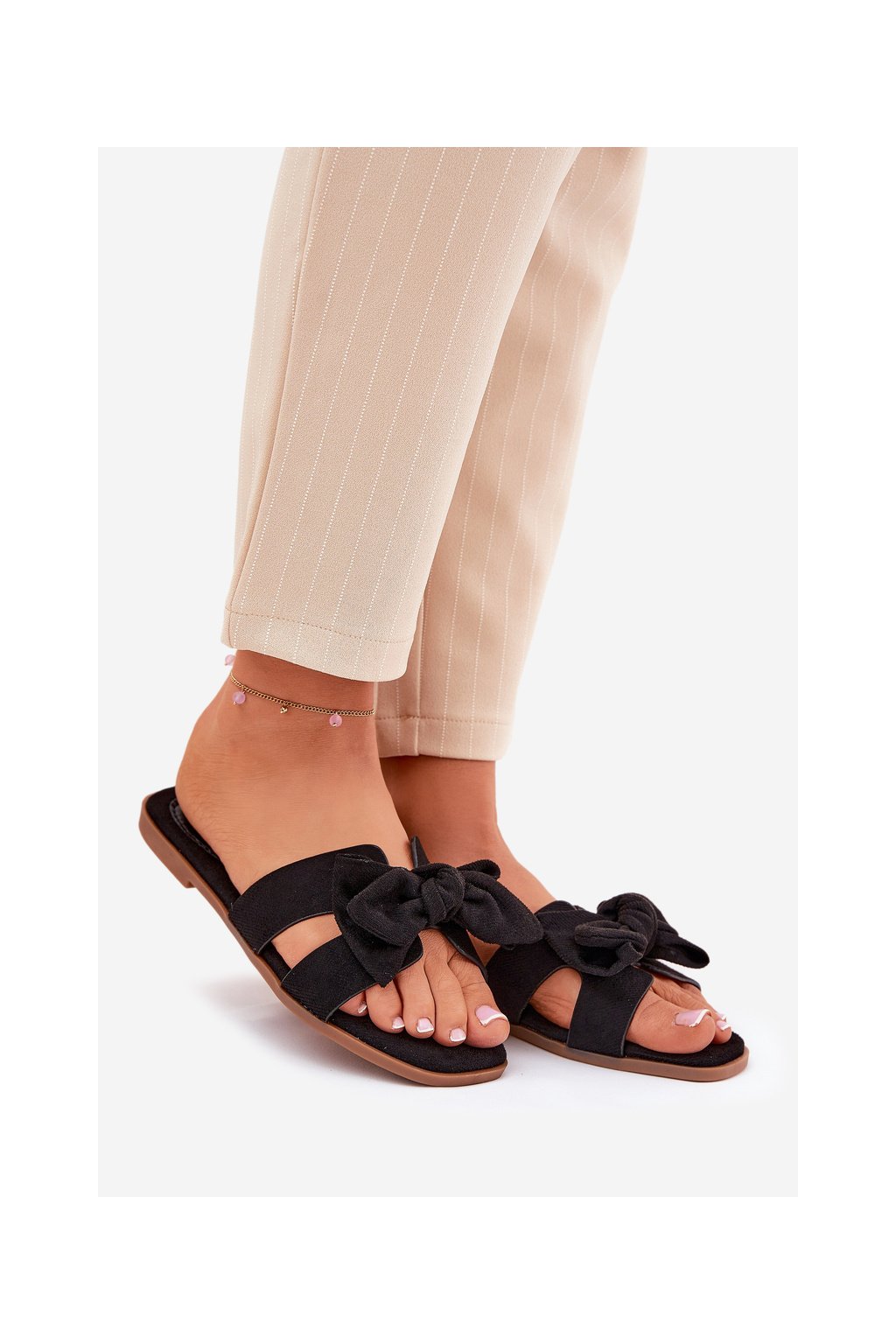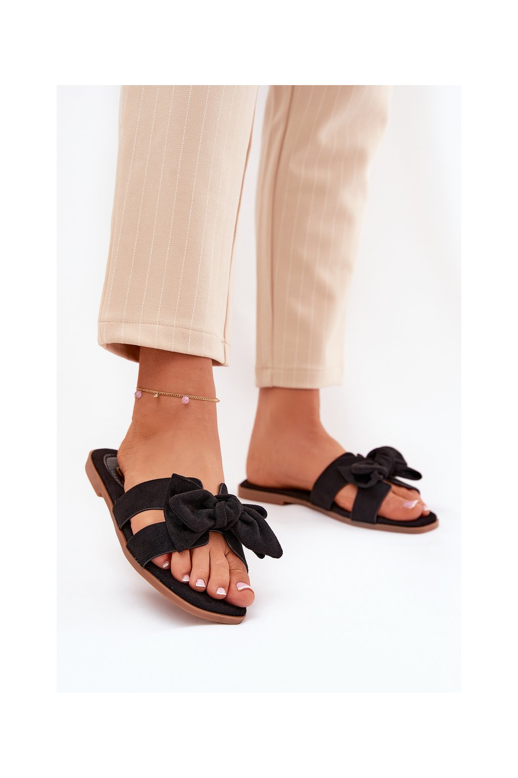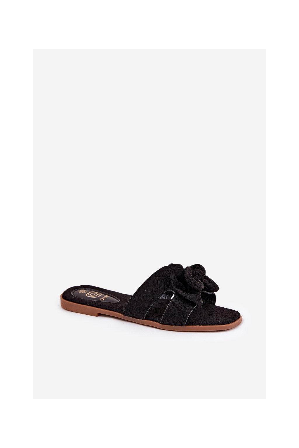 Čierne dámske papuče z ekologického semišu s mašľou na rovnej podrážke, kód produktu LX9614 BLACK