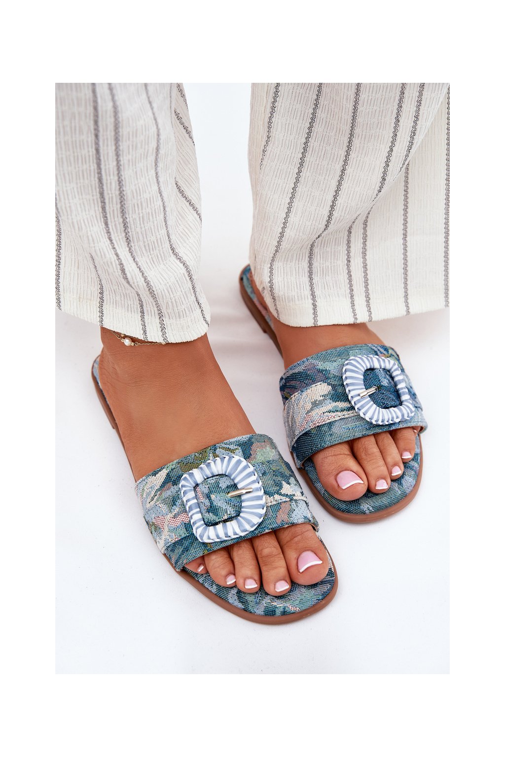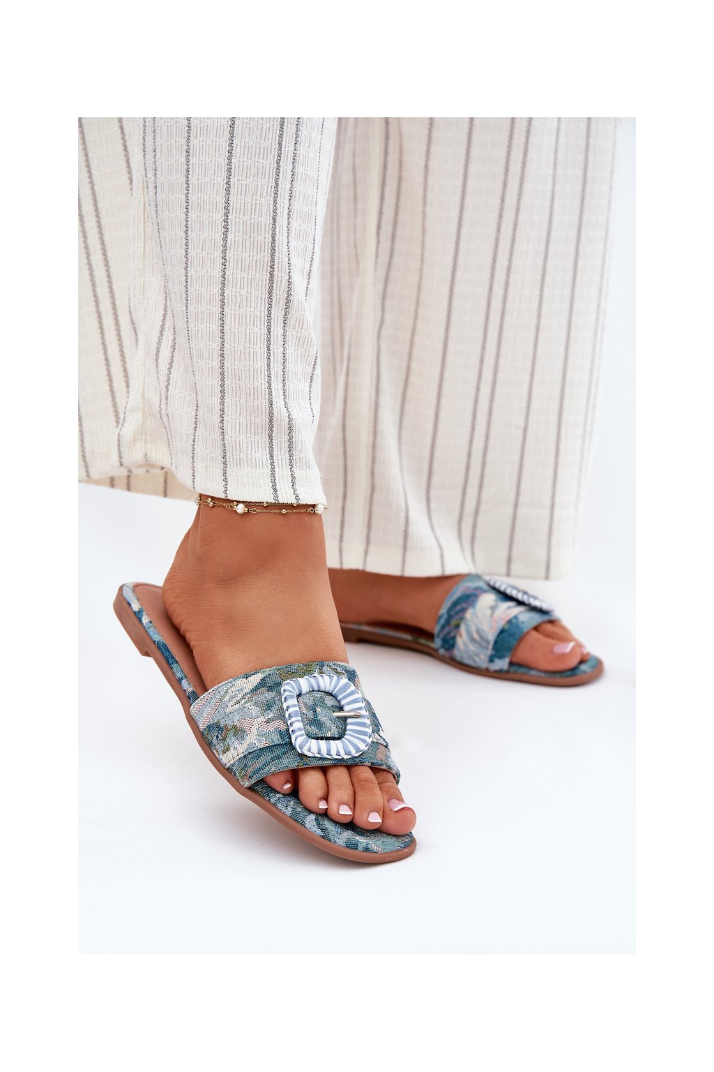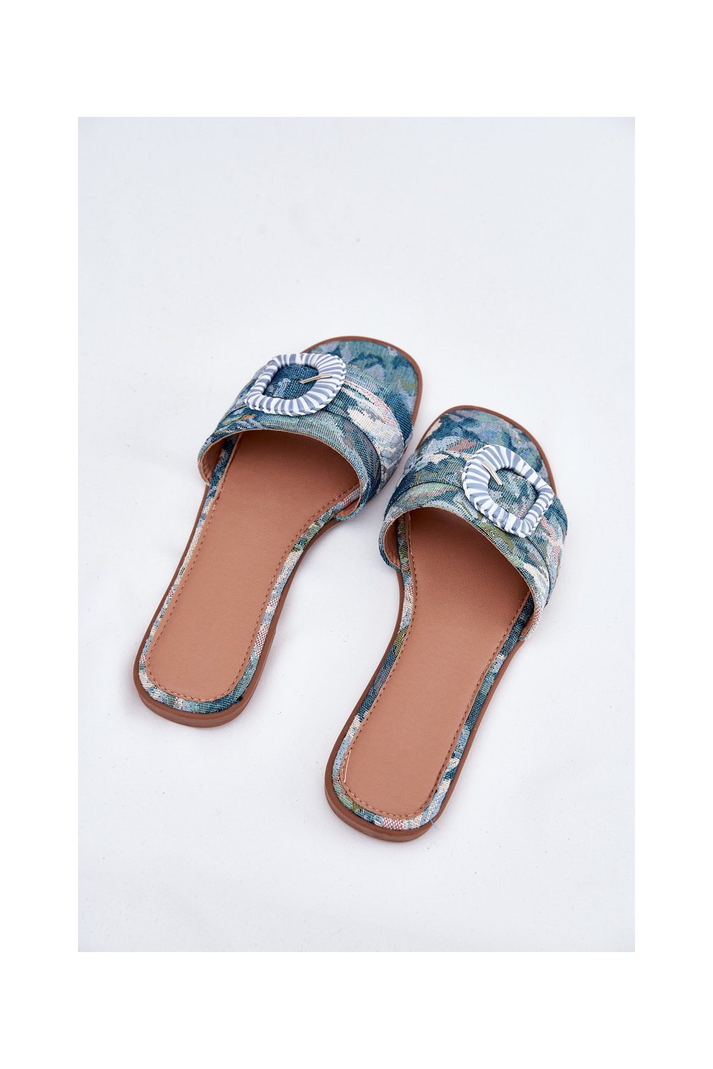 Modré dámske šľapky s rovnou podrážkou a ozdobnou sponou, textil, G469 BLUE