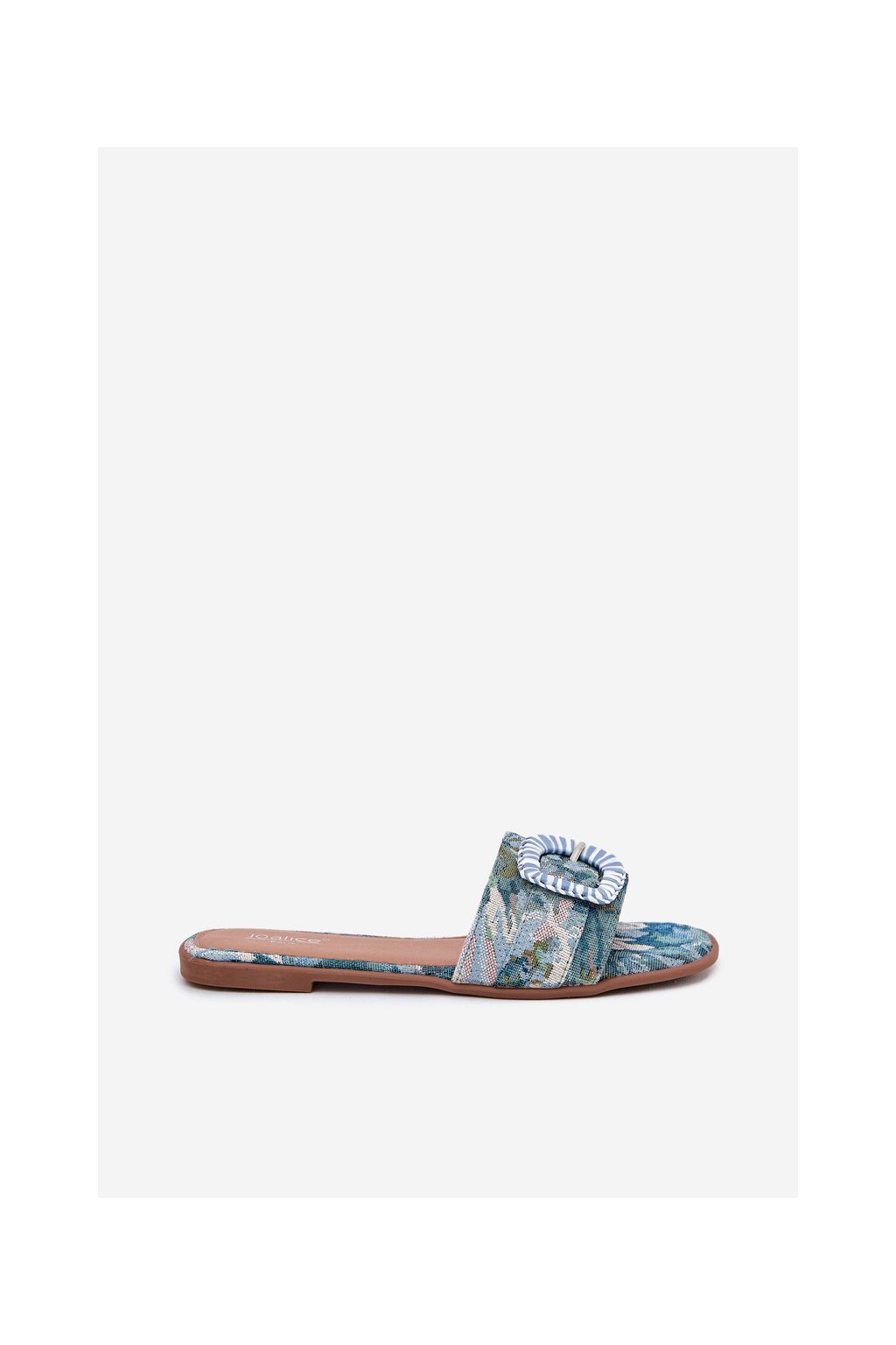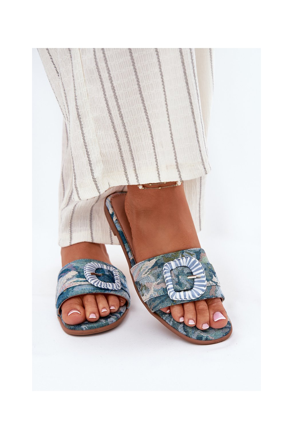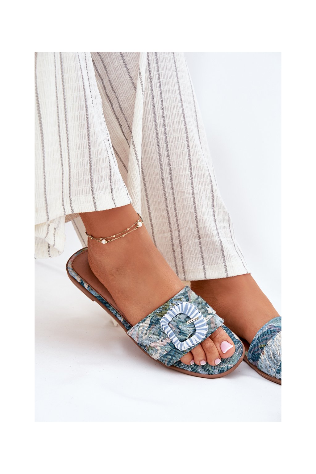 Modré dámske šľapky s rovnou podrážkou a ozdobnou sponou, textil, G469 BLUE
