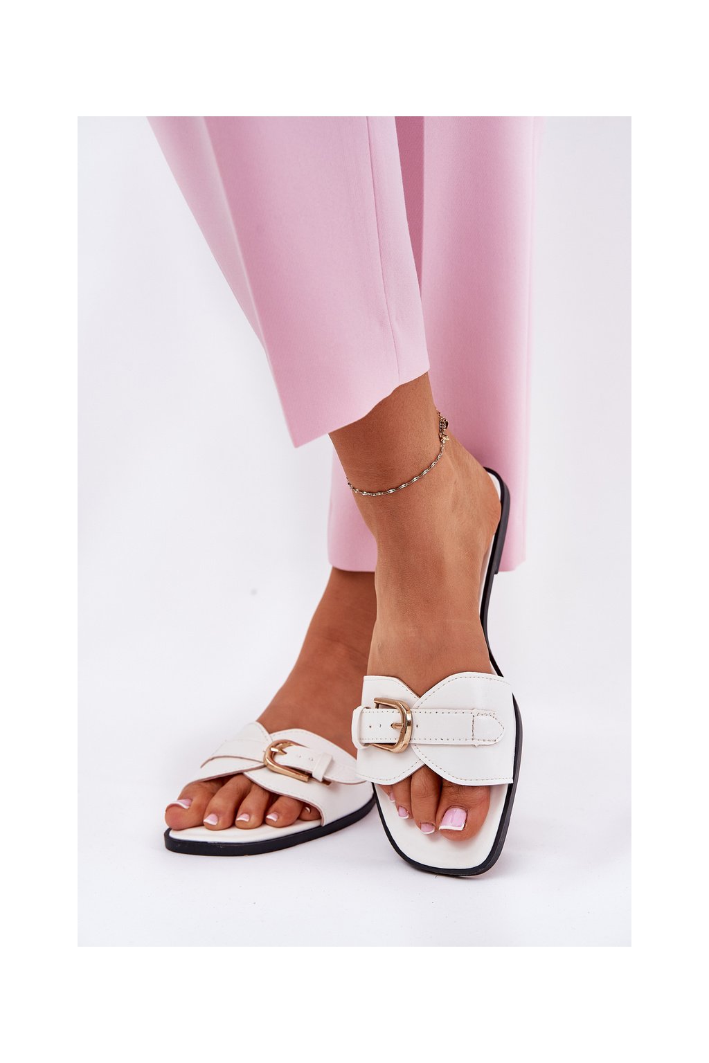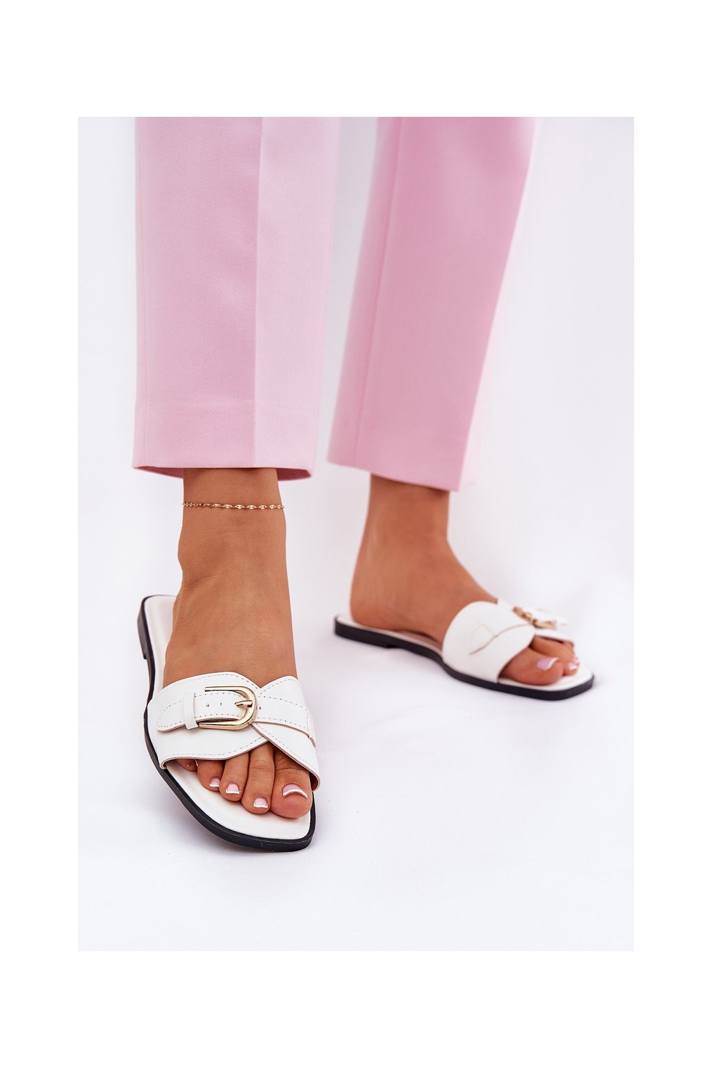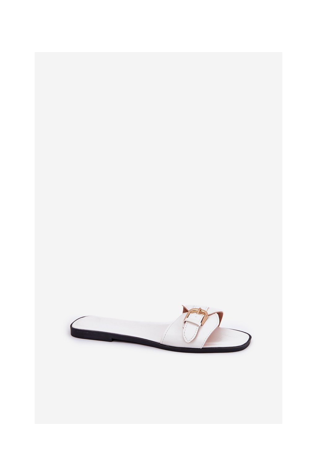 Biele dámske šľapky z eko kože s<0xC2><0xA0>zlatou sponou na rovnej podrážke, kód produktu N75-62 WHITE