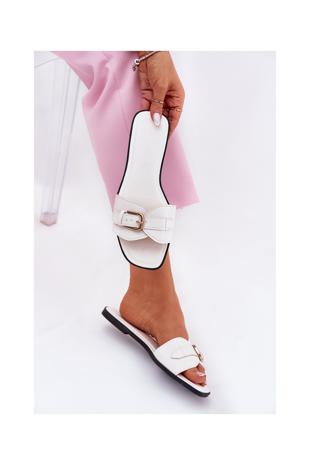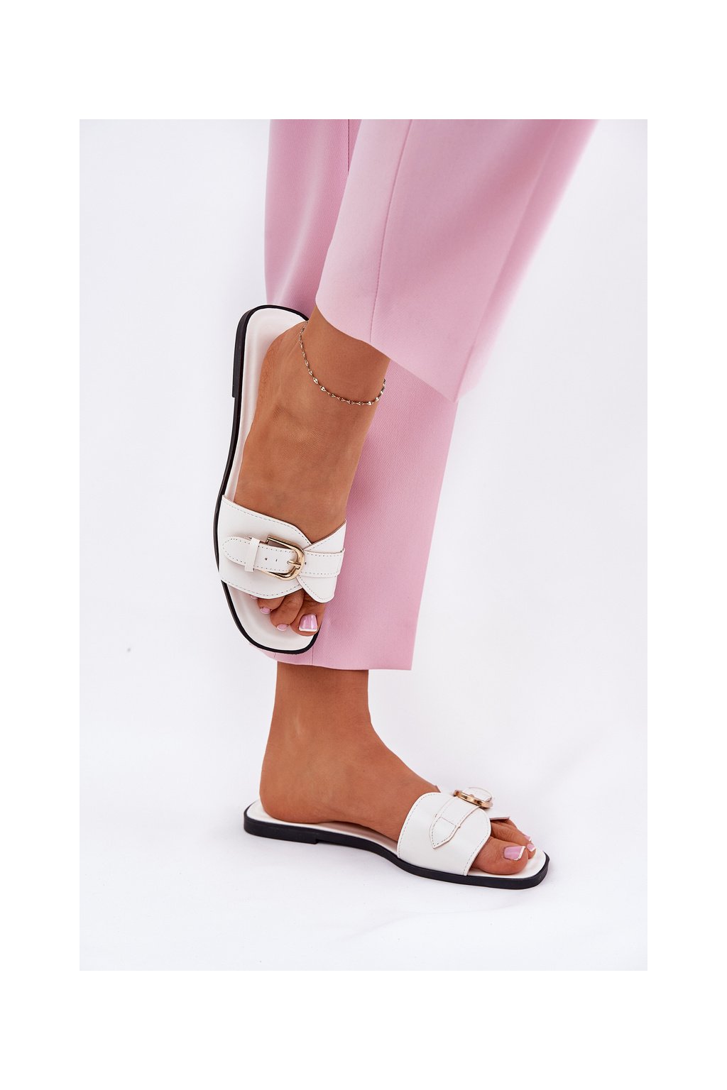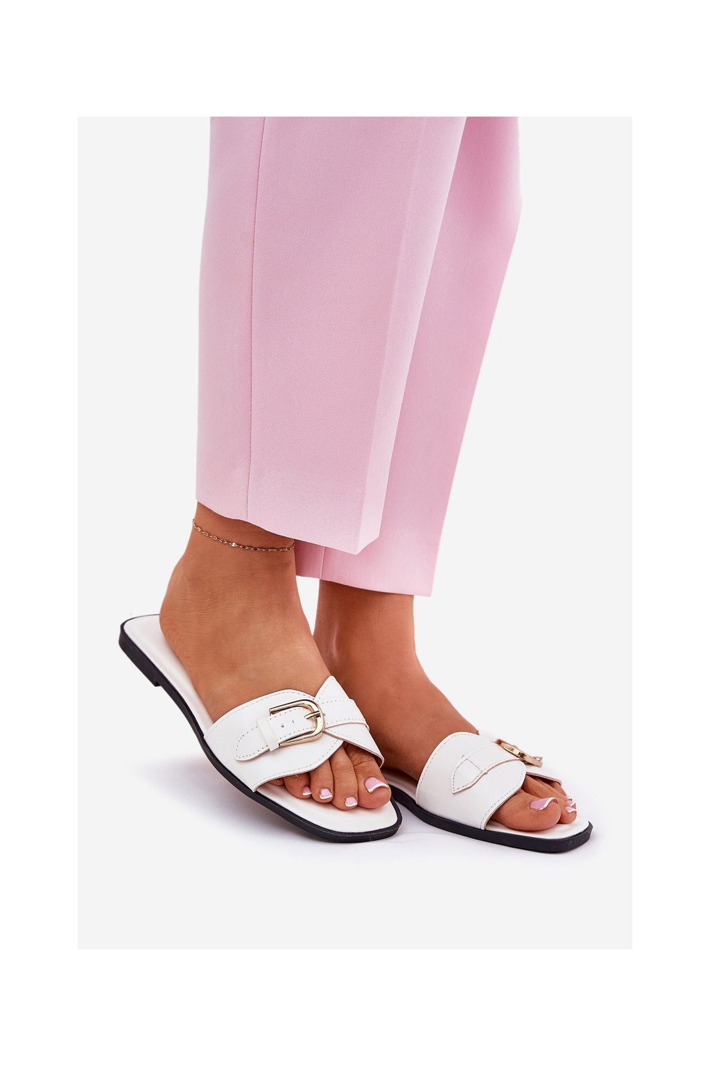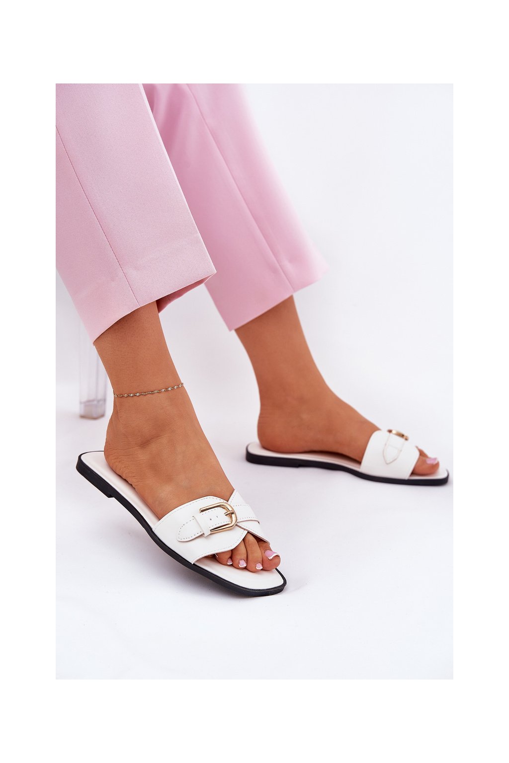 Biele dámske šľapky z eko kože s<0xC2><0xA0>zlatou sponou na rovnej podrážke, kód produktu N75-62 WHITE