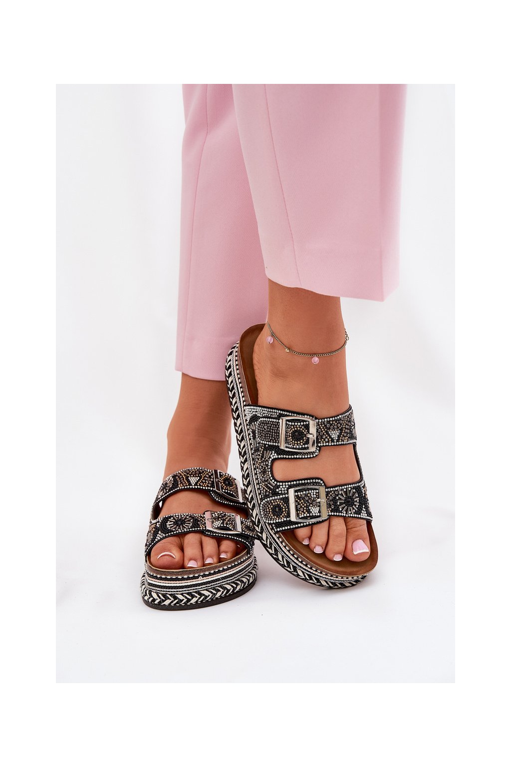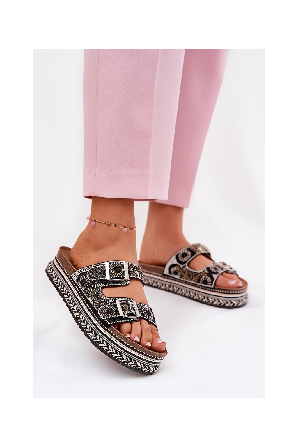 Štýlové dámske papuče na platforme, ktoré sa vyznačujú atraktívnym zdobením.