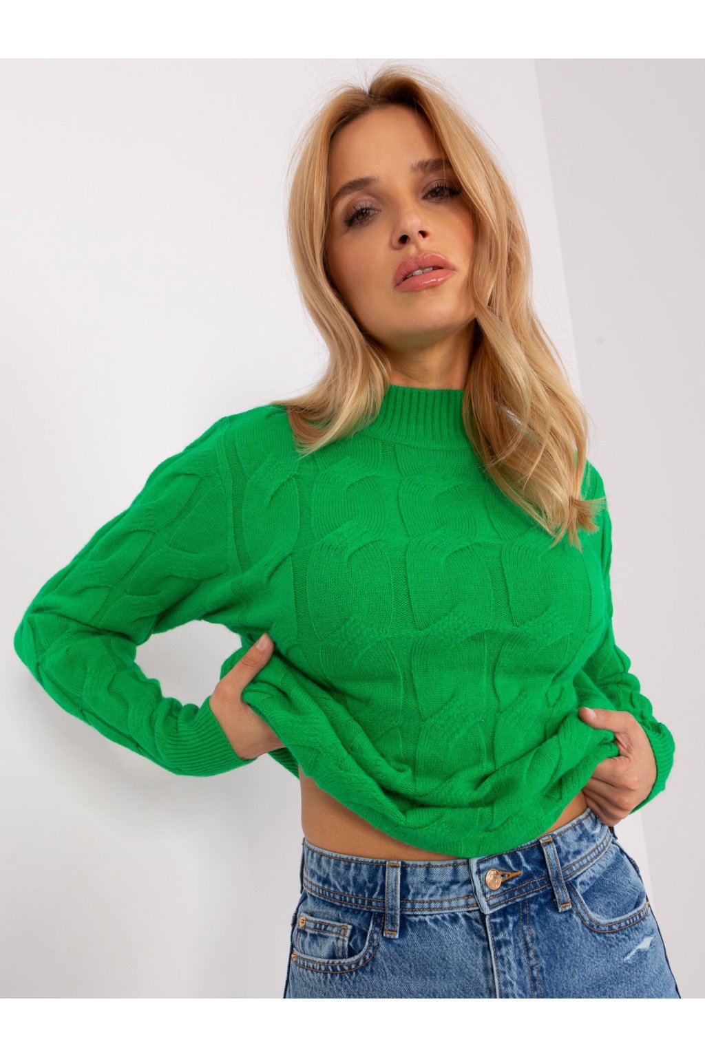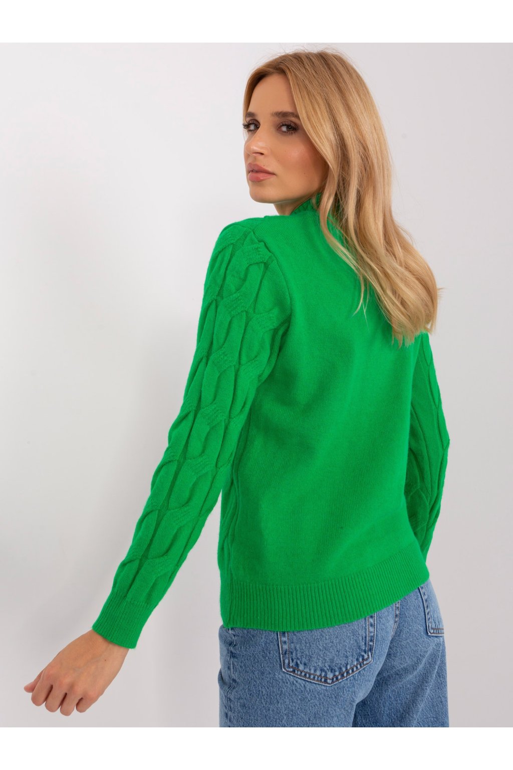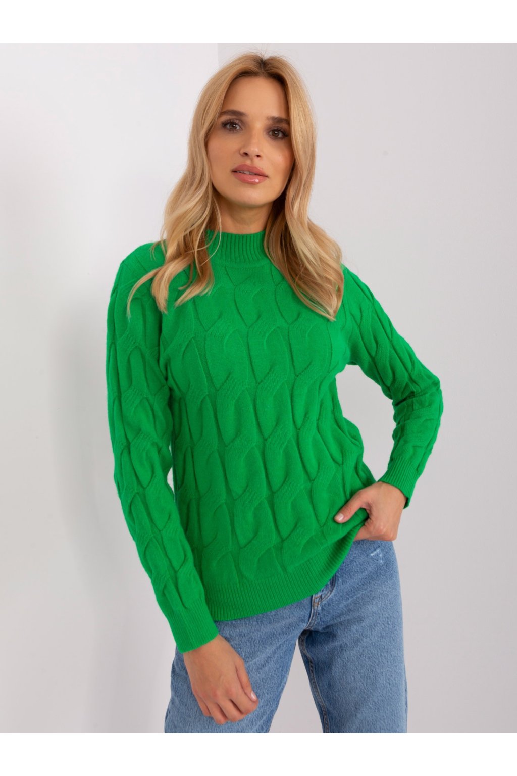 Zelený voľný pletený sveter.