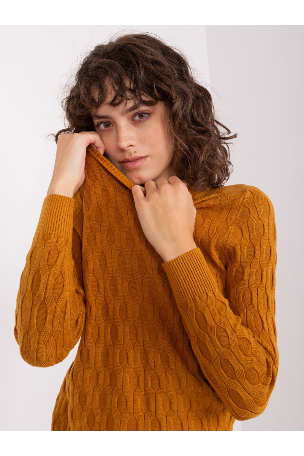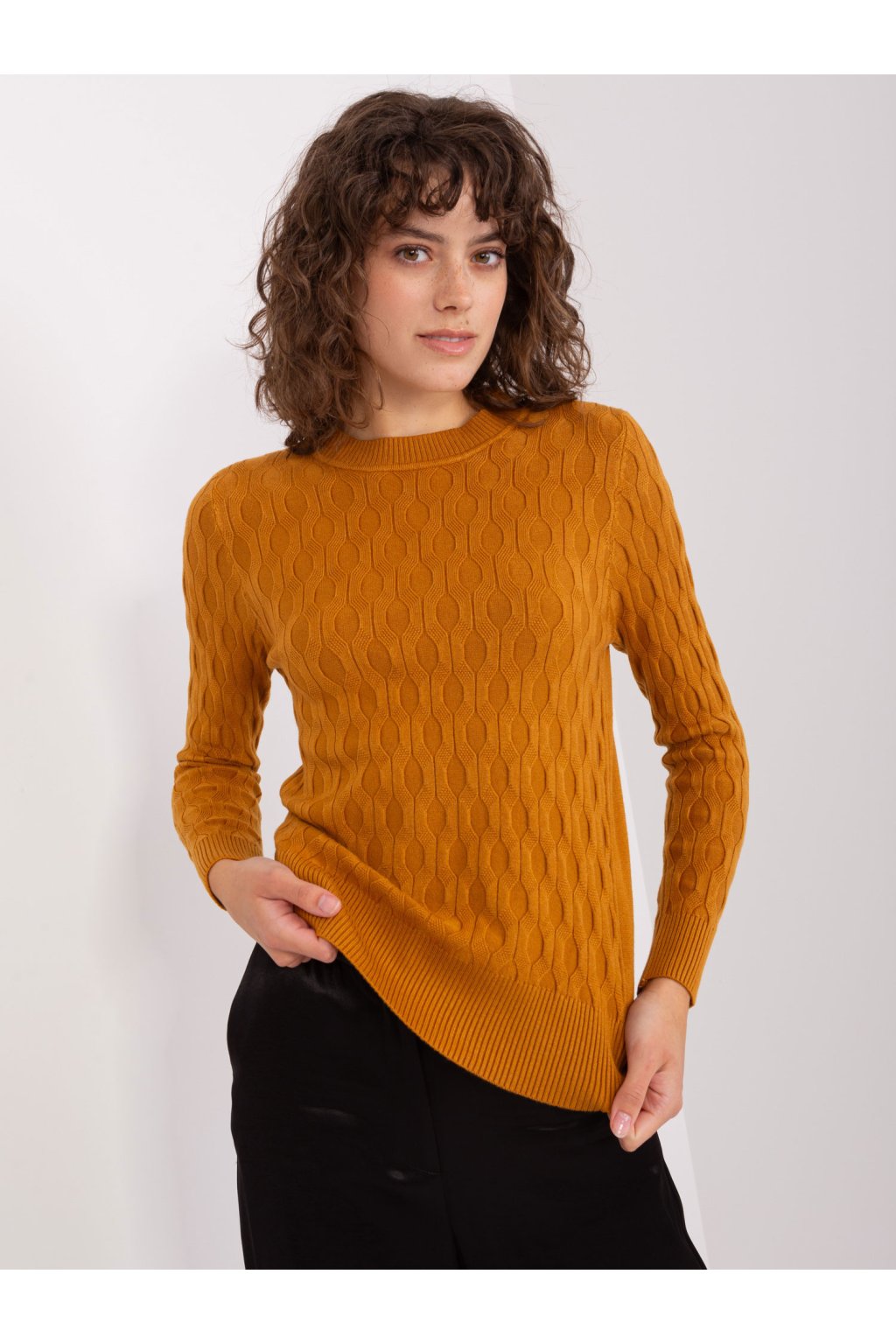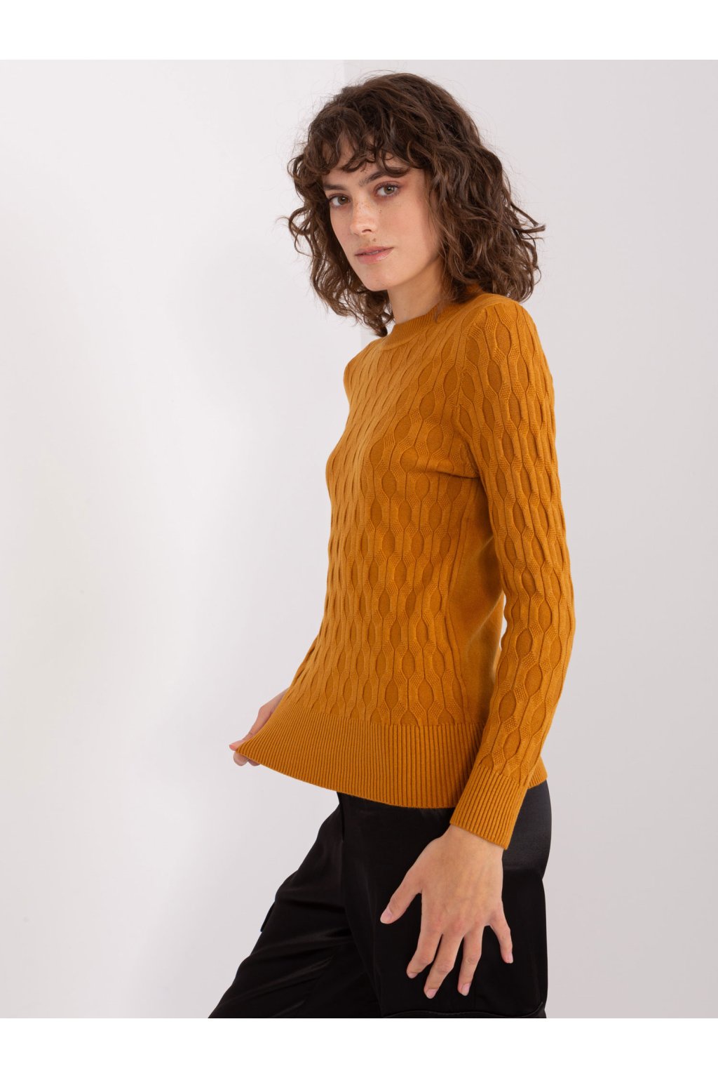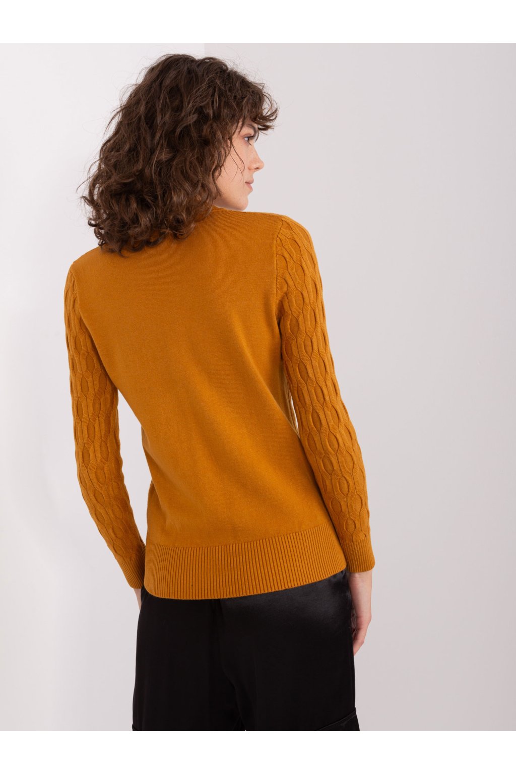 Klasický pletený sveter v horčicovej farbe.