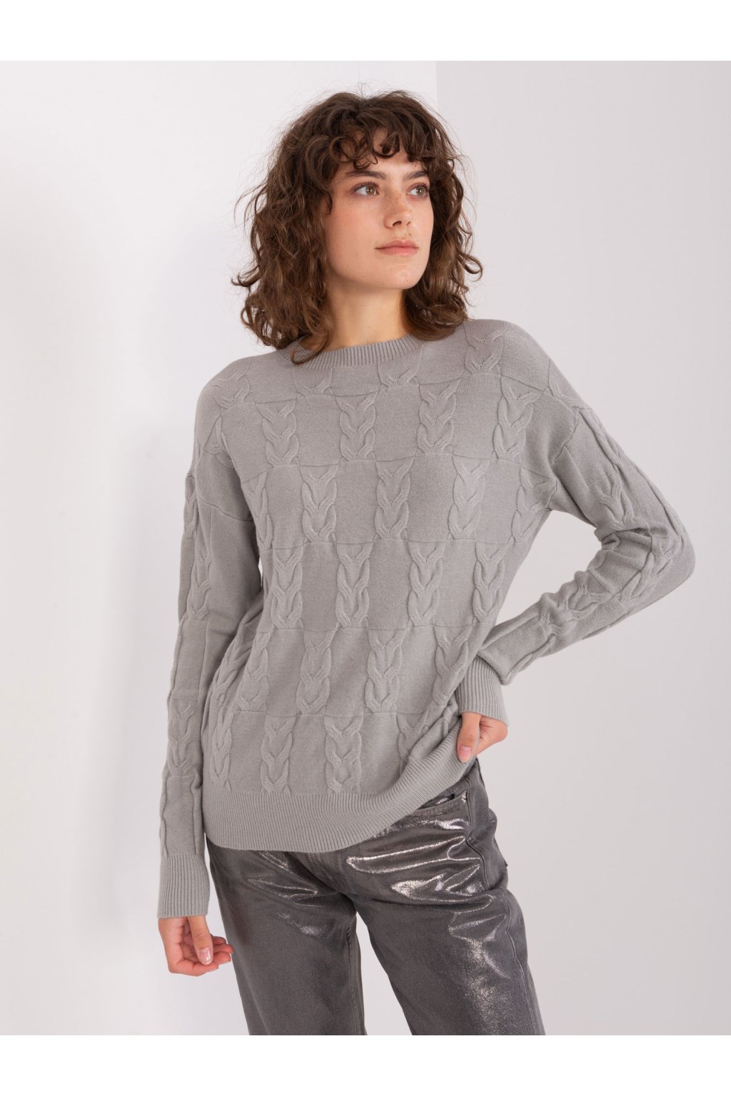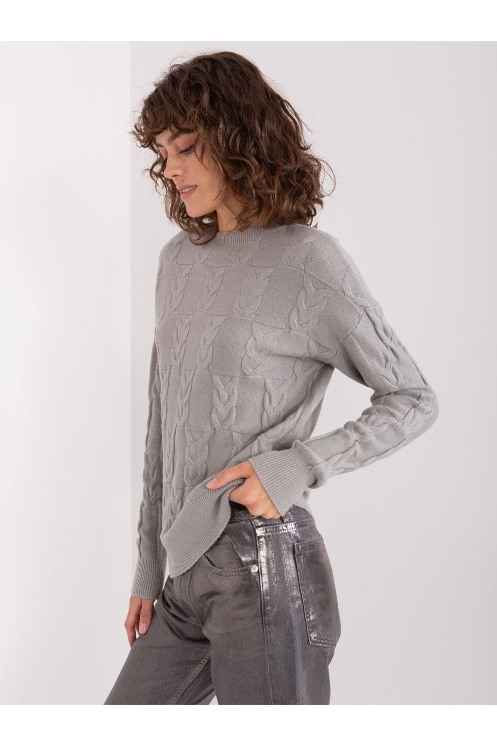 Šedý pletený kockovaný sveter.