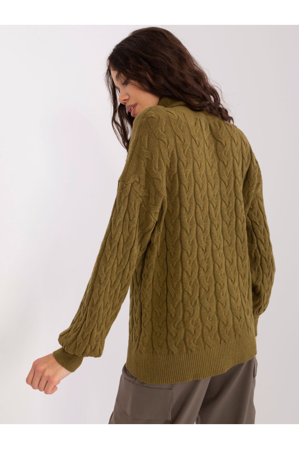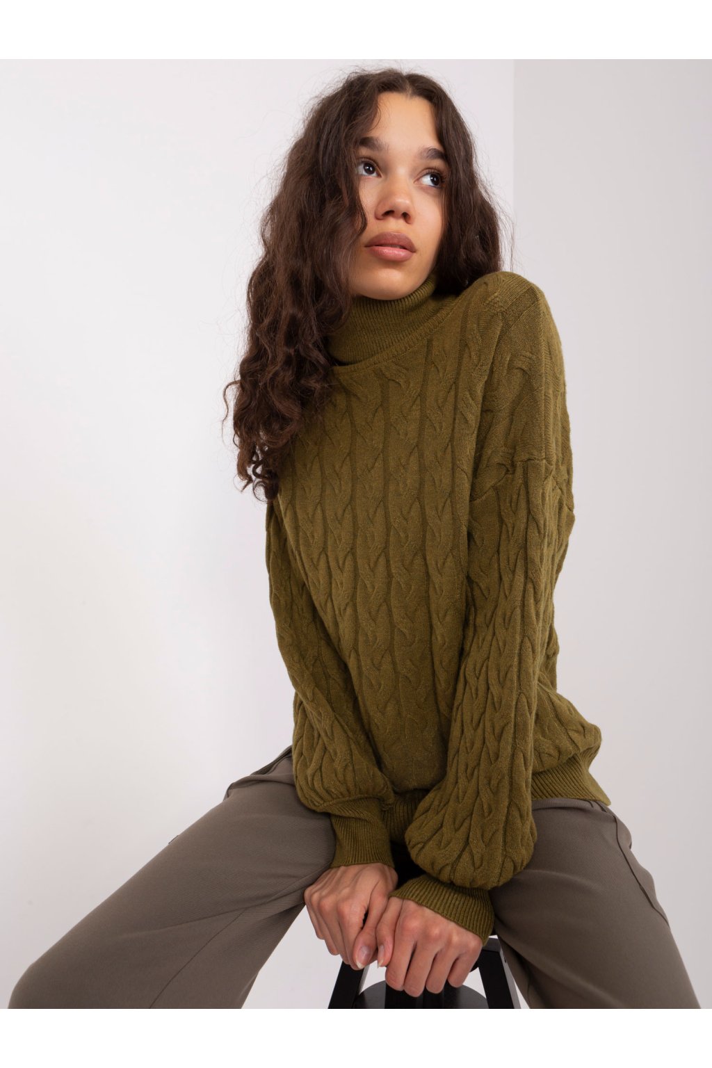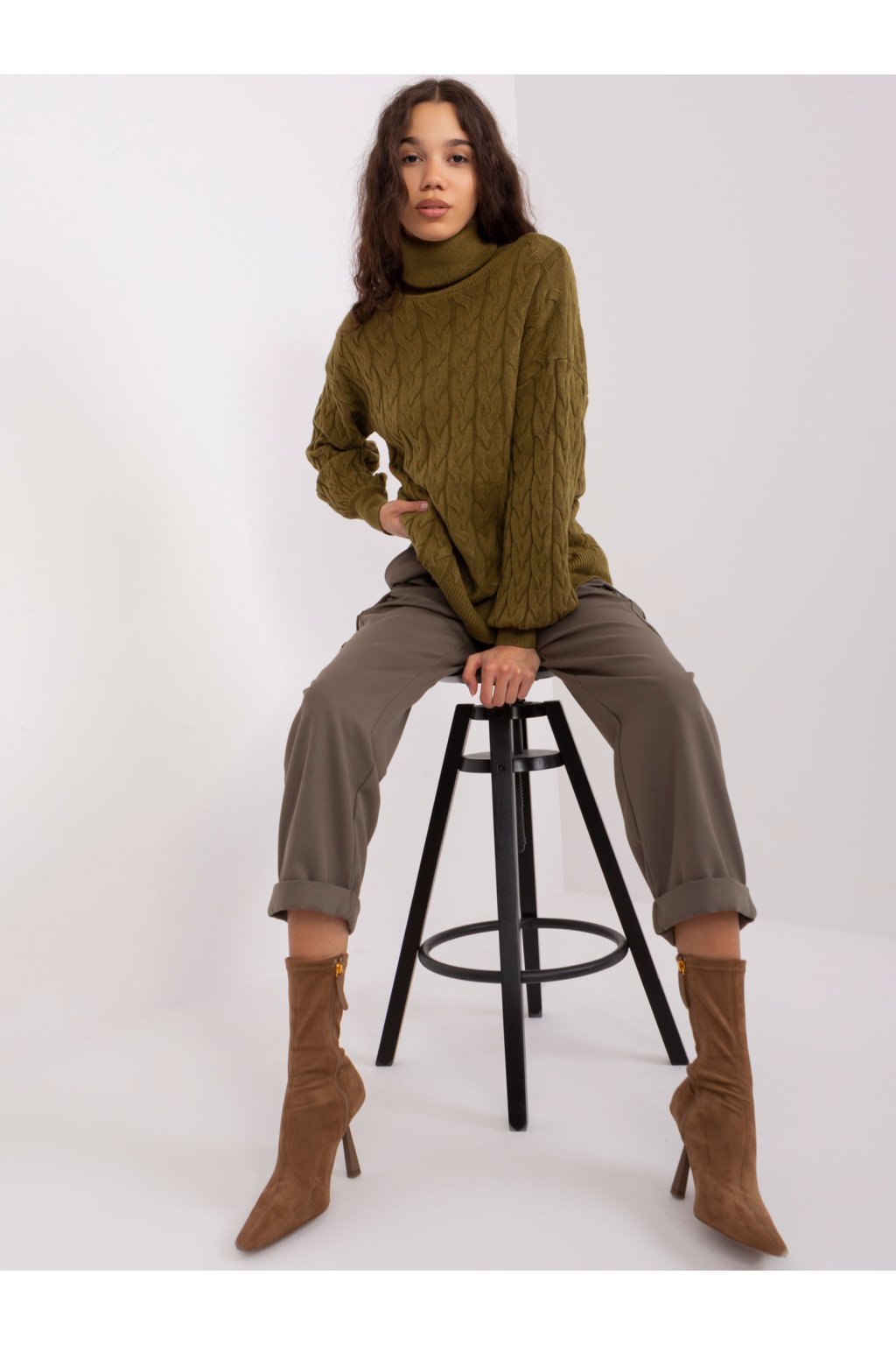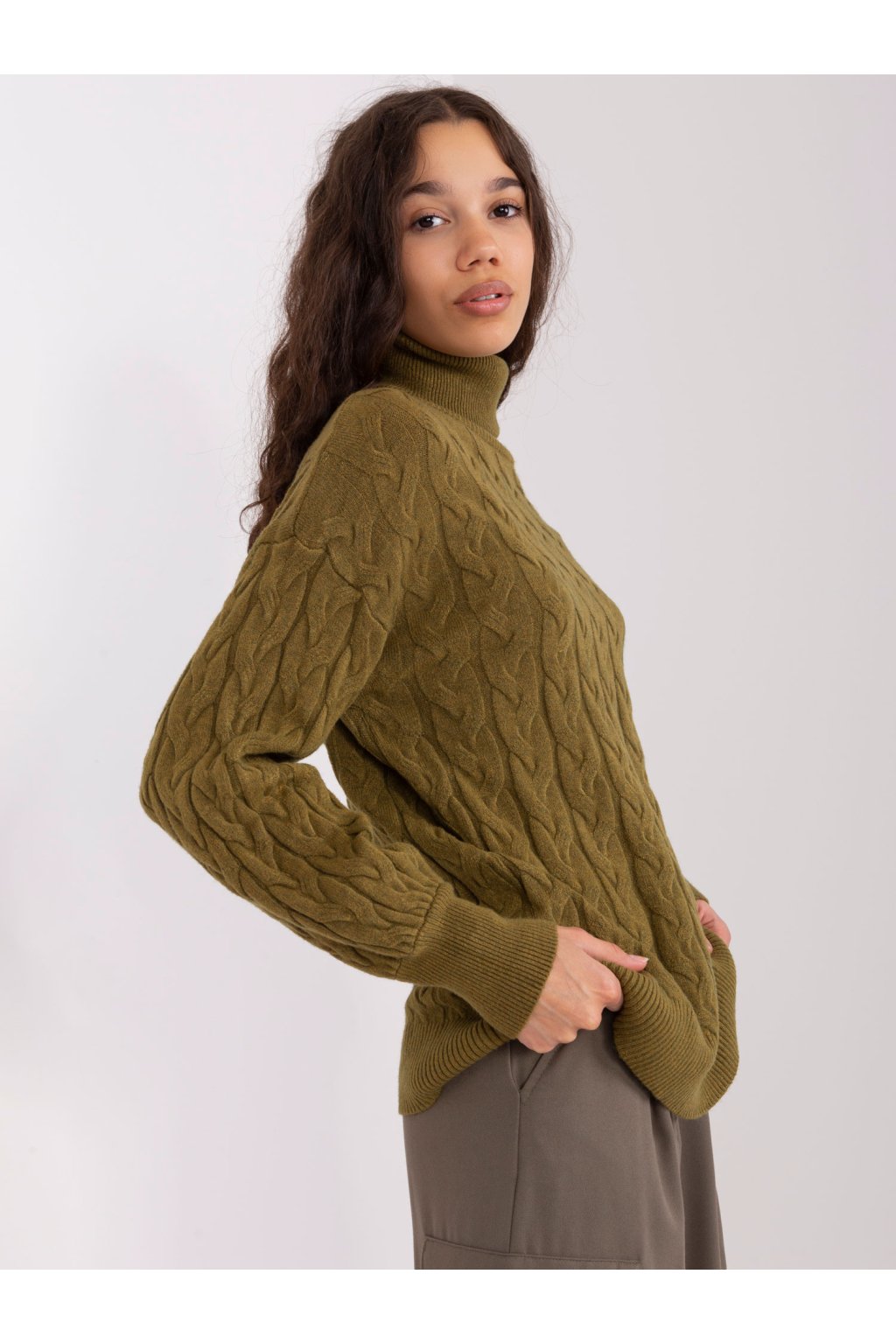 Khaki dámsky sveter s rolákom a rebrovanými manžetami .