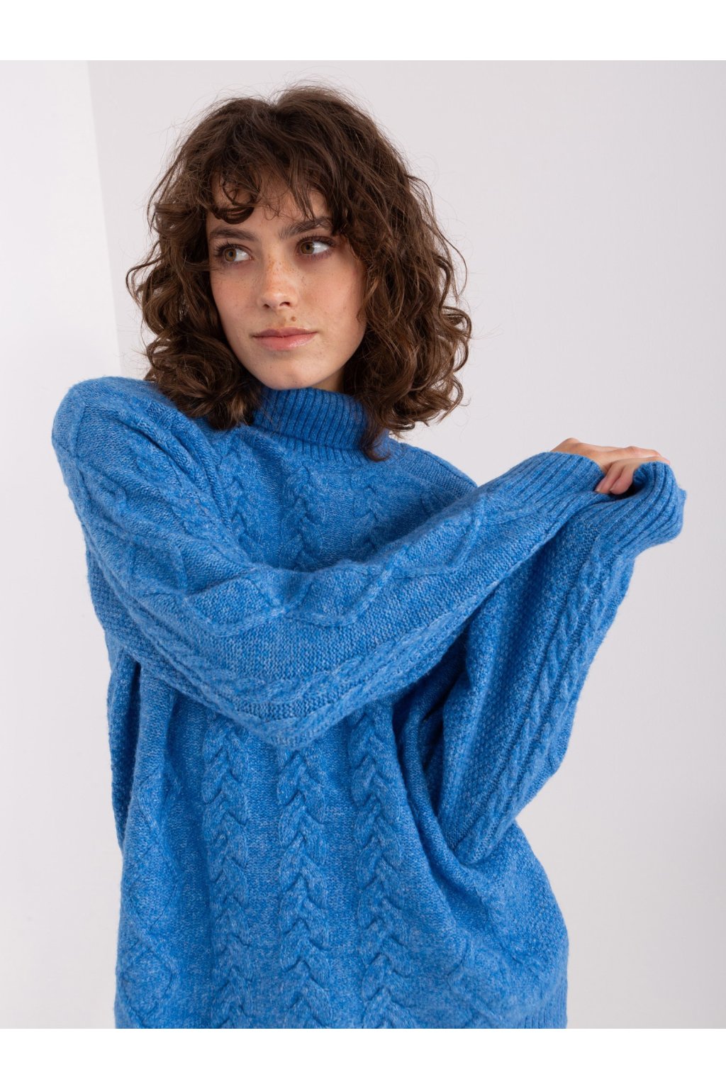 Modrý kockovaný sveter s oversize strihom .