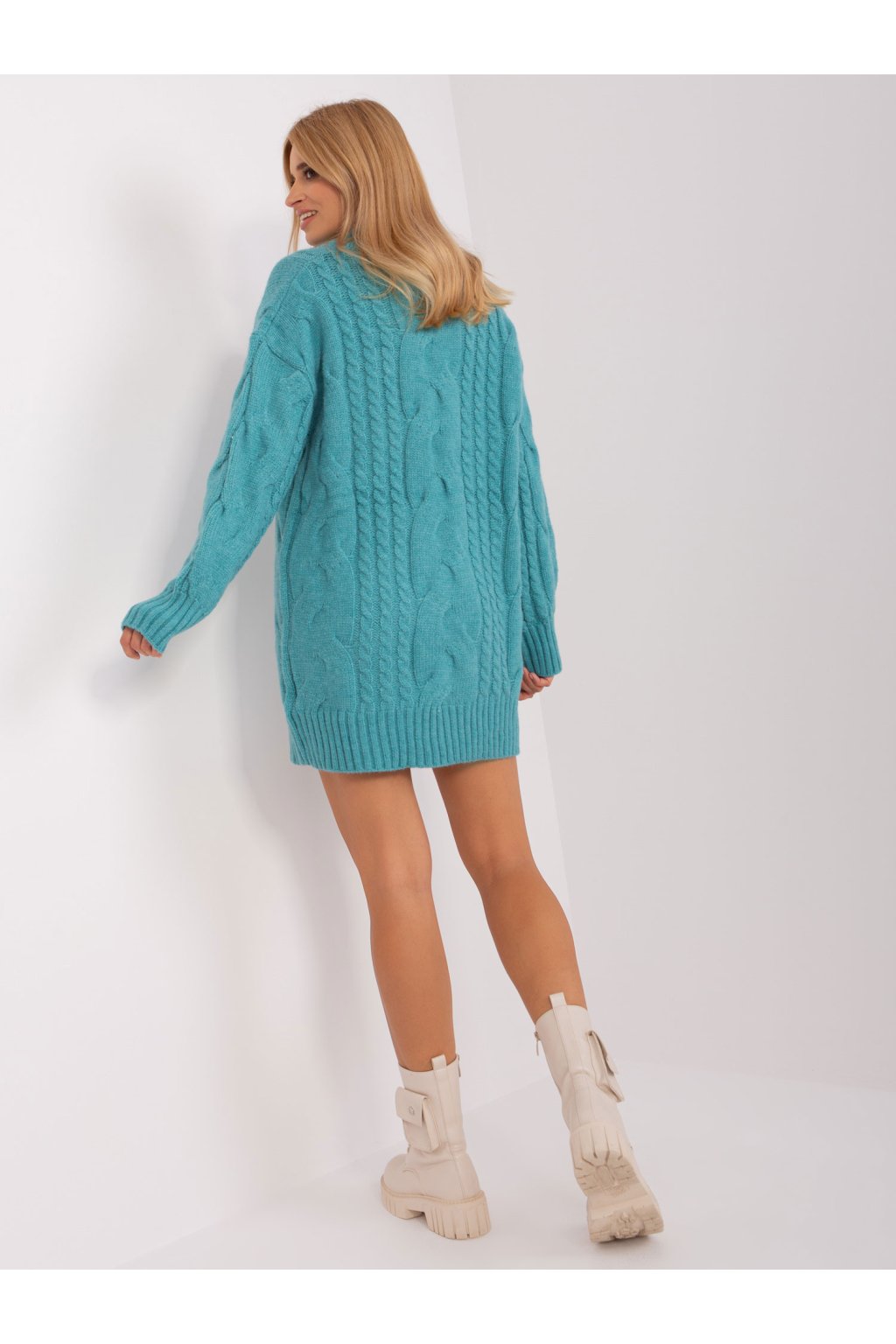 Tyrkysové pletené šaty s rolákom .