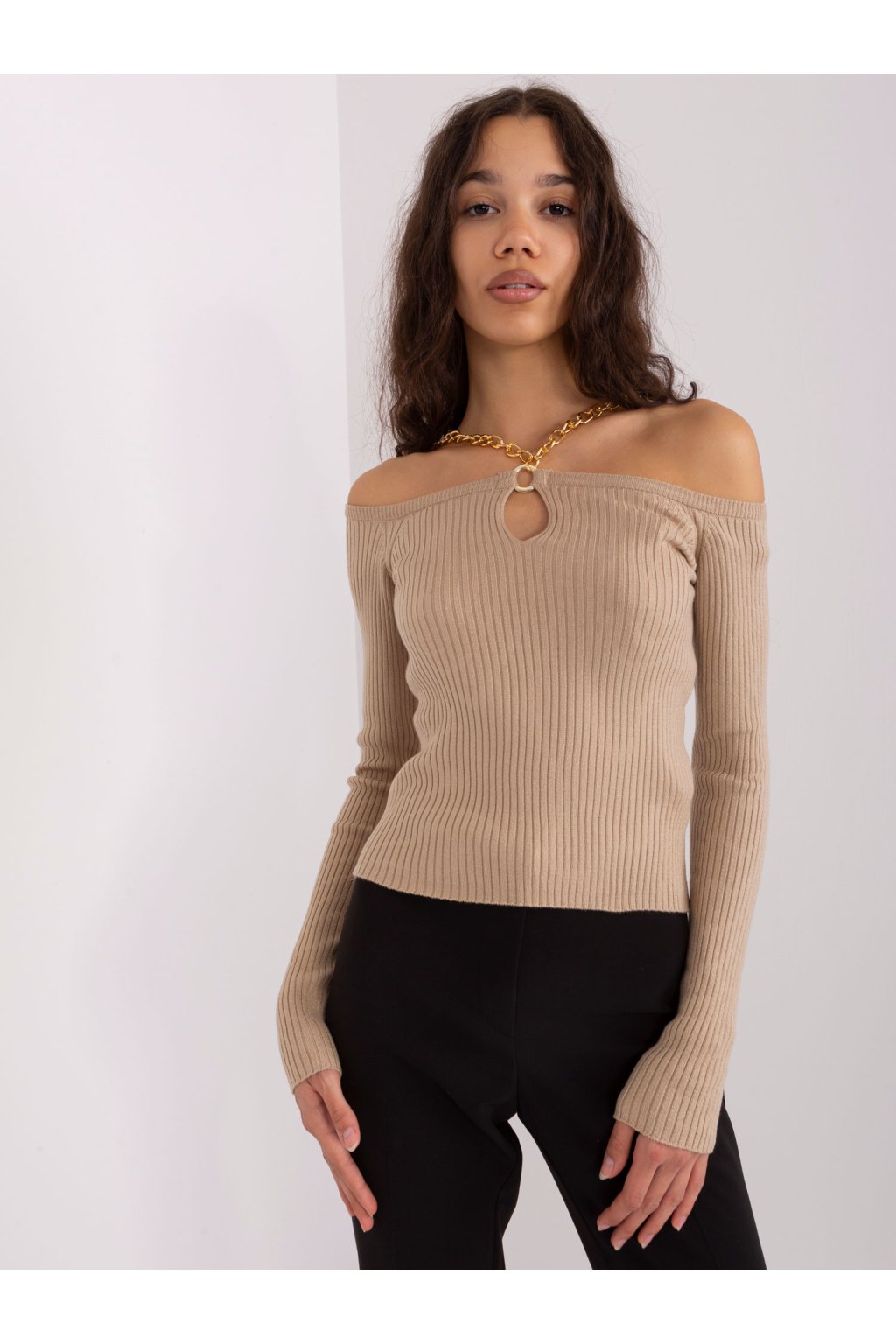 Béžový sveter s odhalenými ramenami a retiazkami.