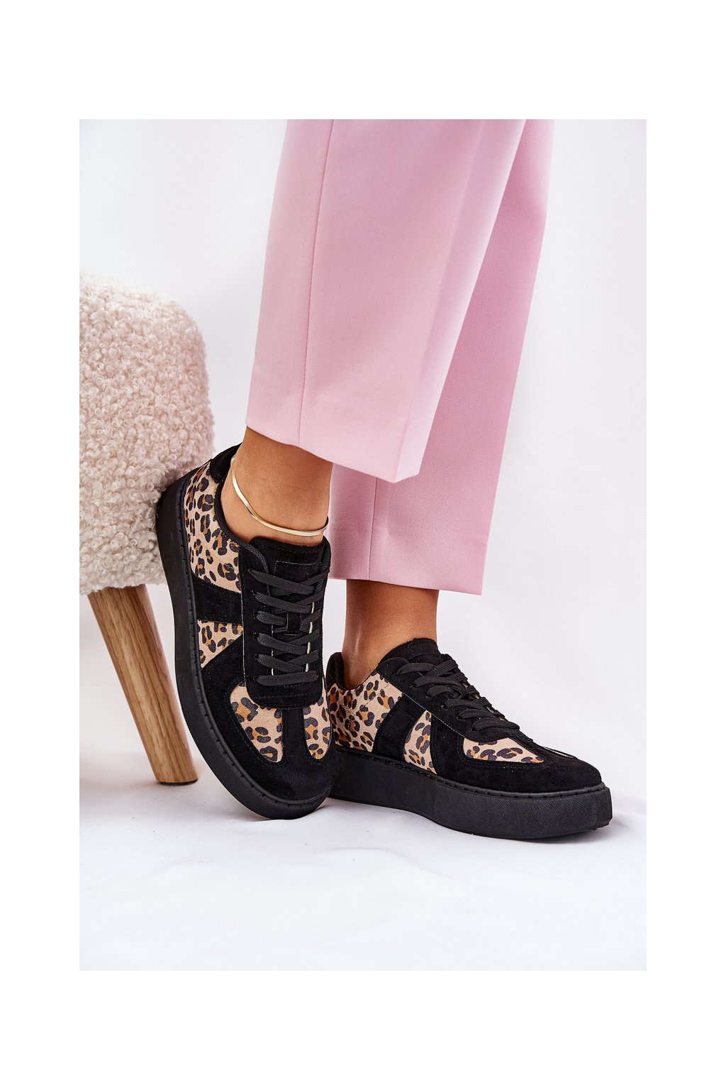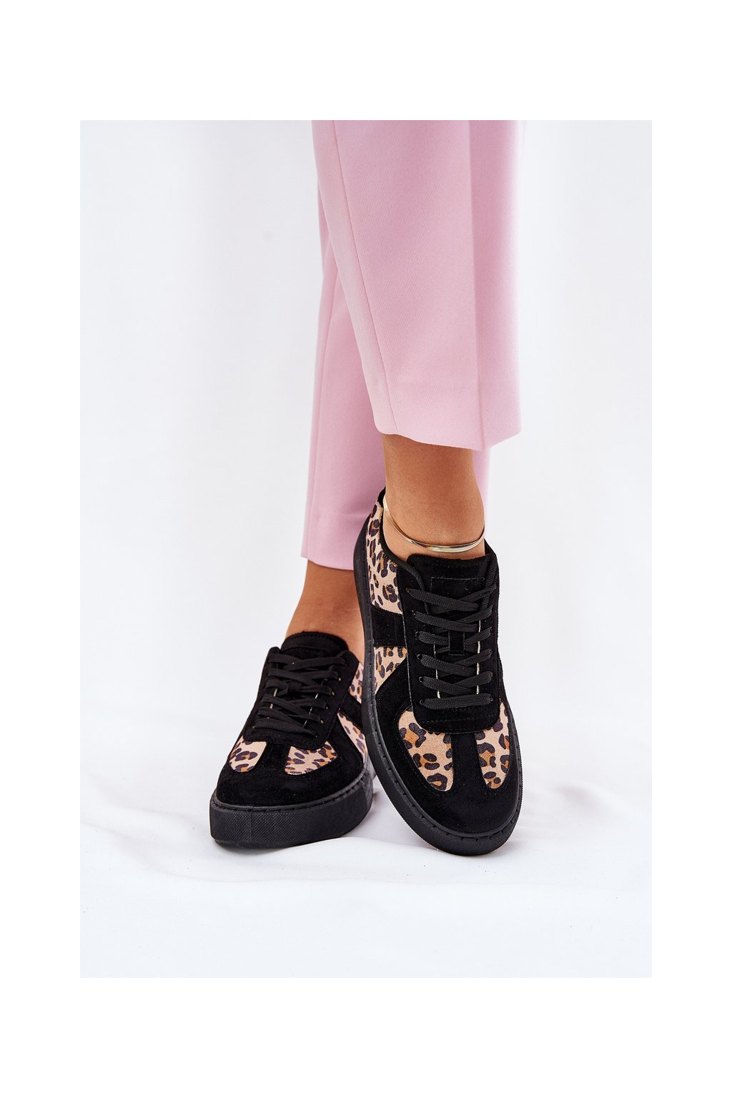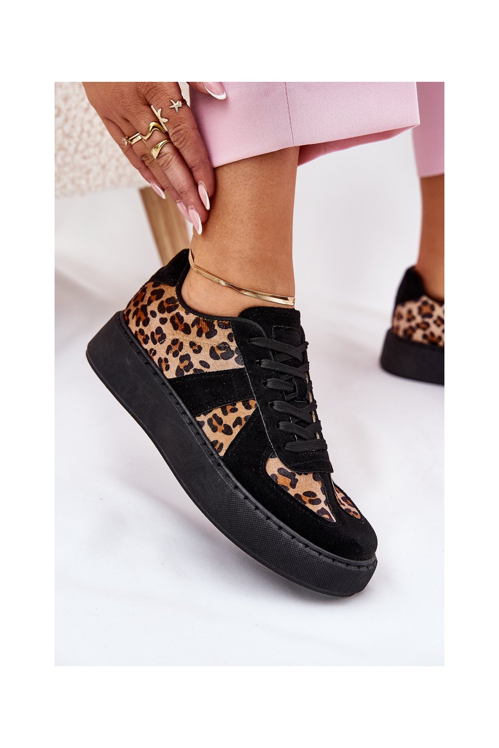Čierne dámske leopardie tenisky na platforme s viazaním, textil a eko koža, kód produktu NN622 BLACK