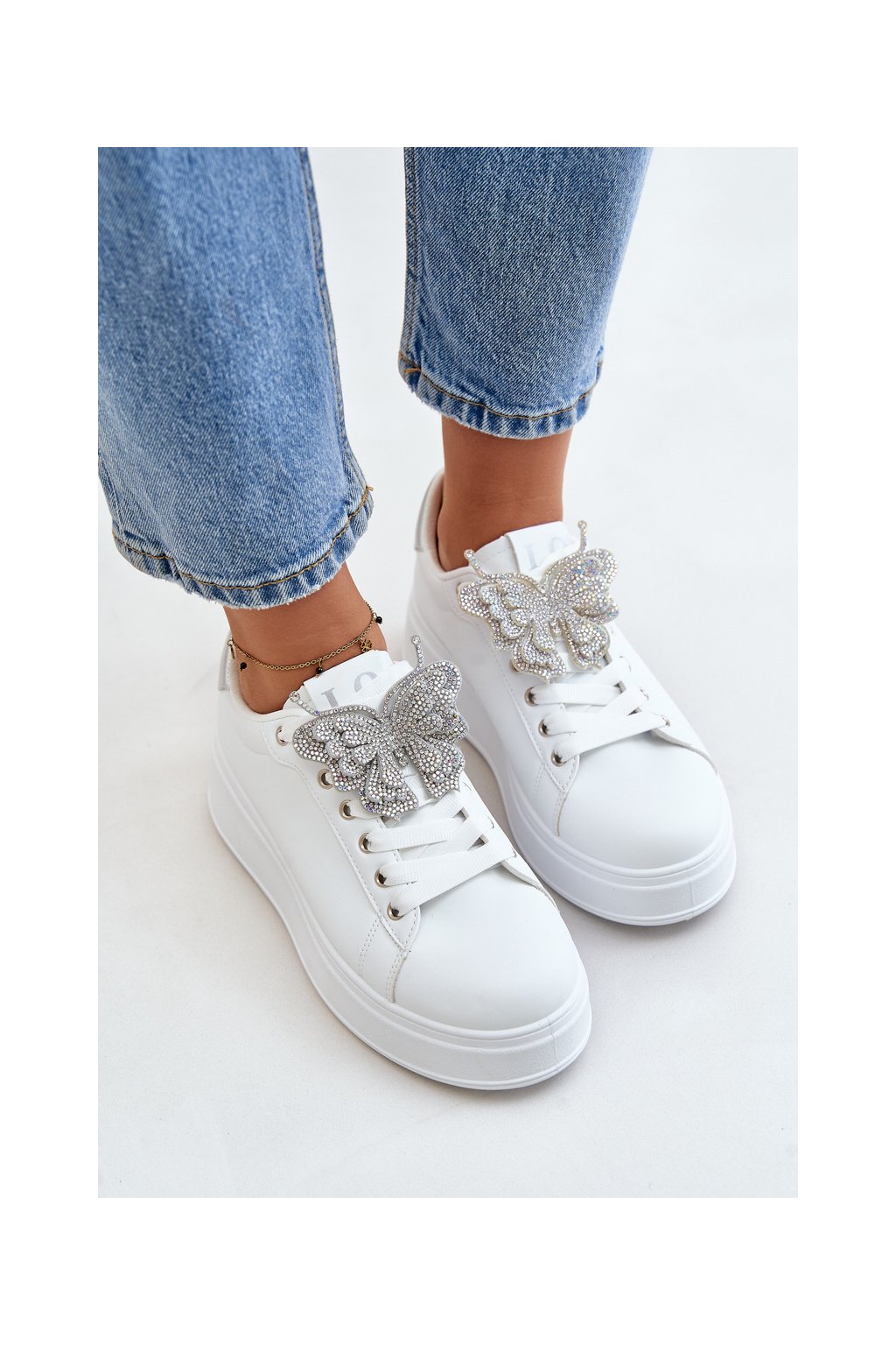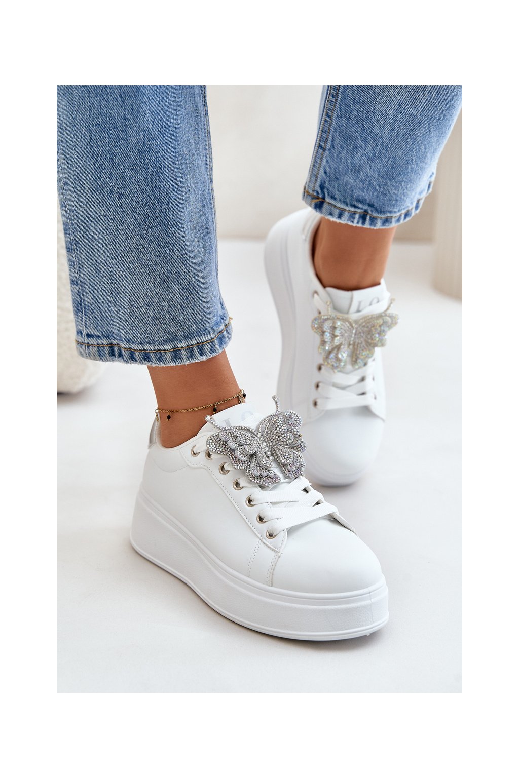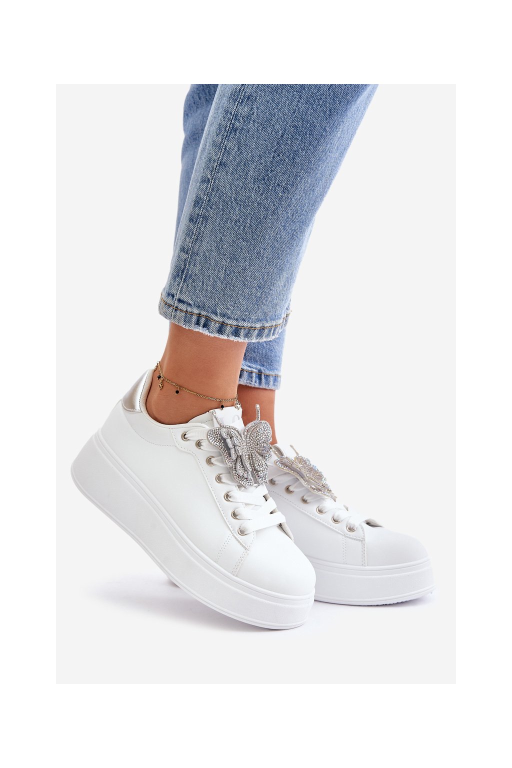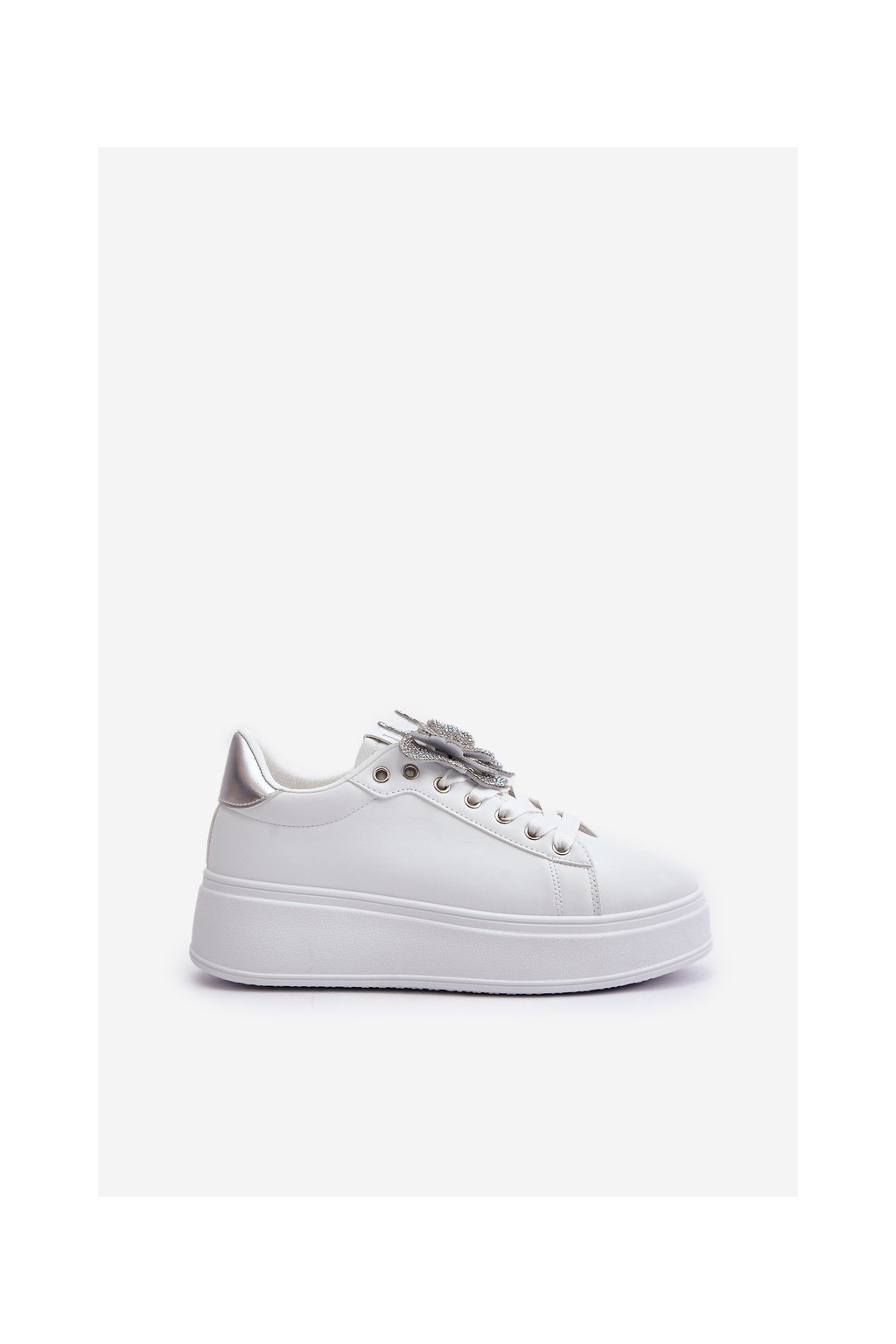 Dámske biele tenisky z eko kože na rovnej podrážke s ozdobným motýlikom, kód produktu YY-23 SILVER