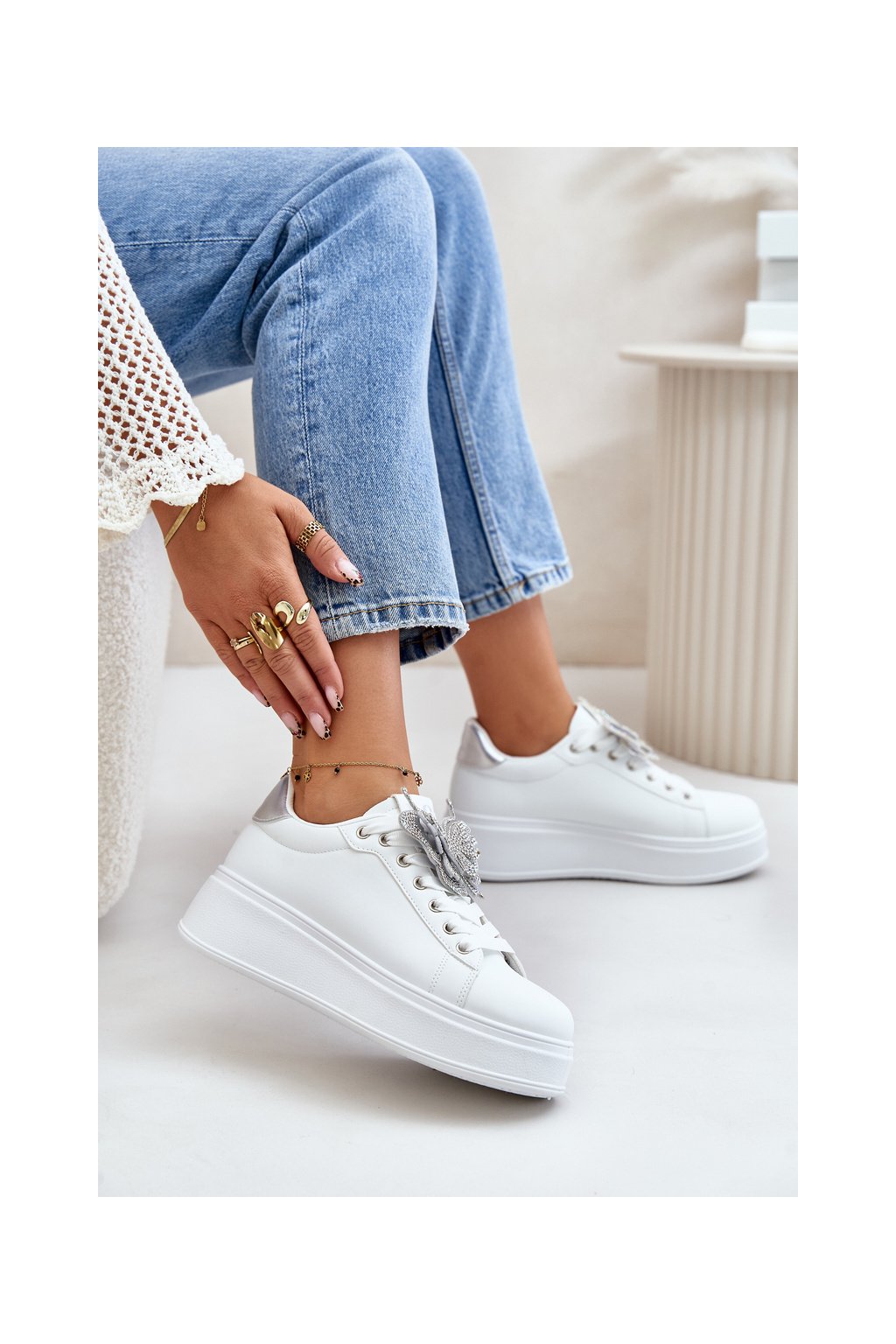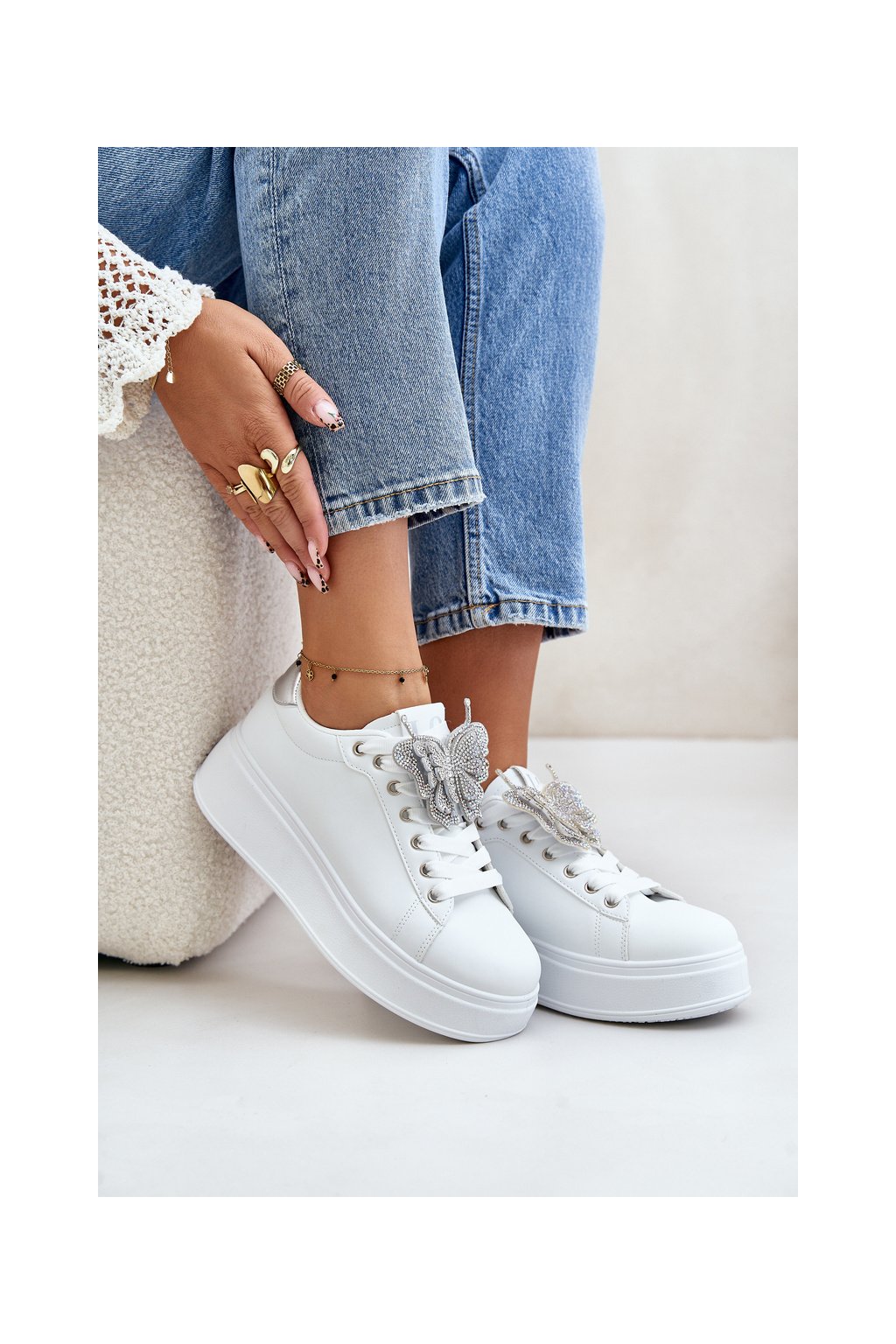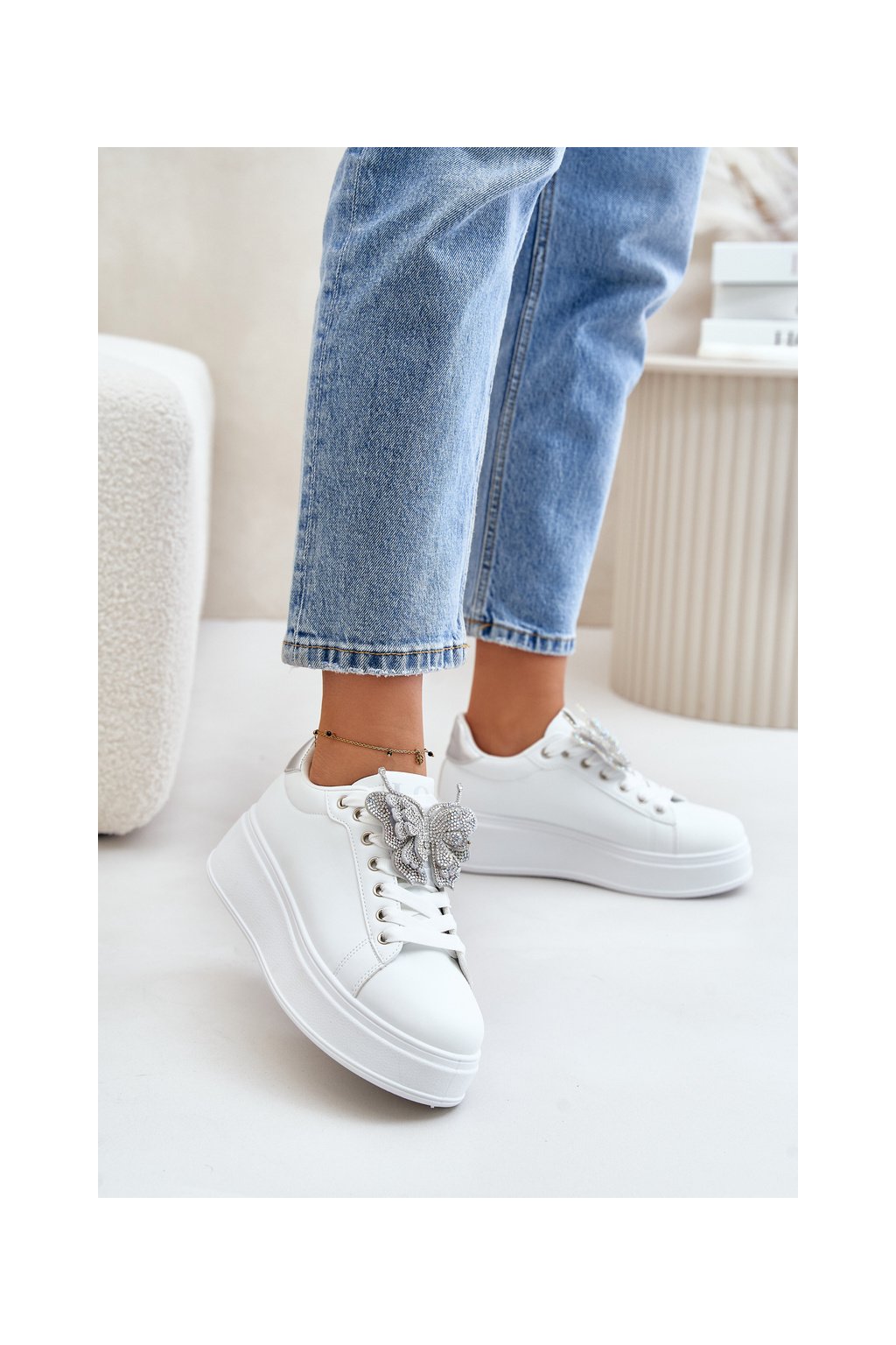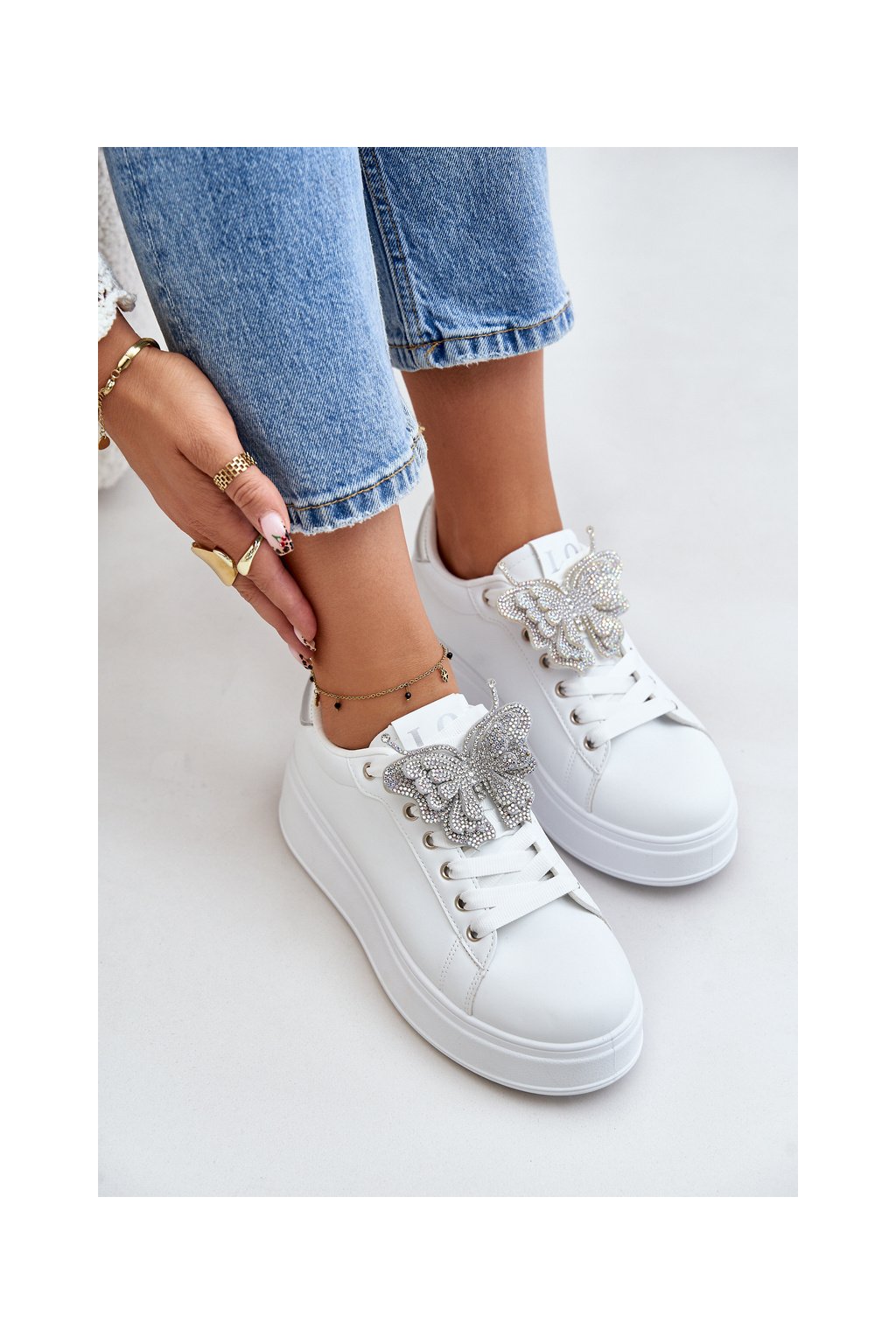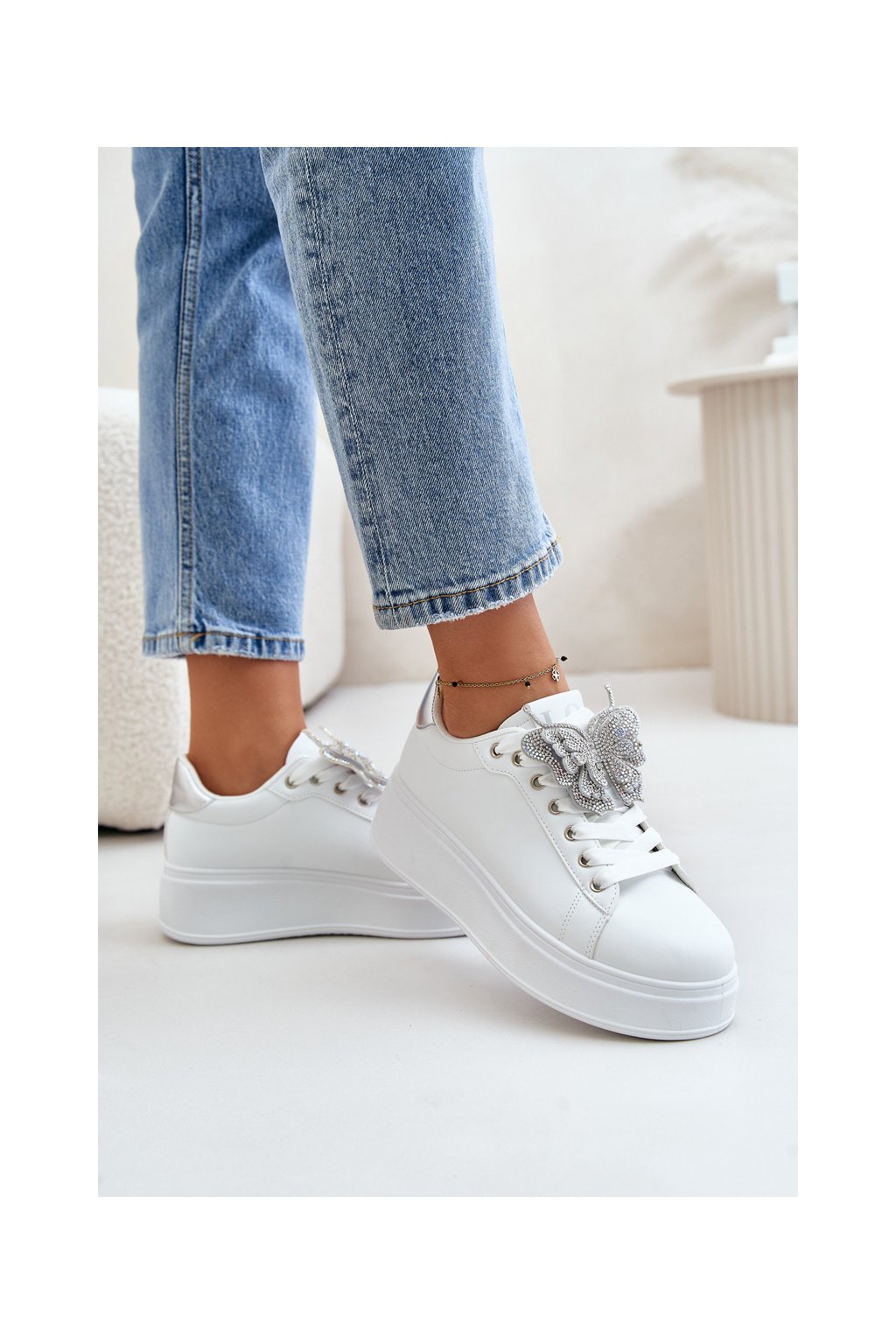 Dámske biele tenisky z eko kože na rovnej podrážke s ozdobným motýlikom, kód produktu YY-23 SILVER