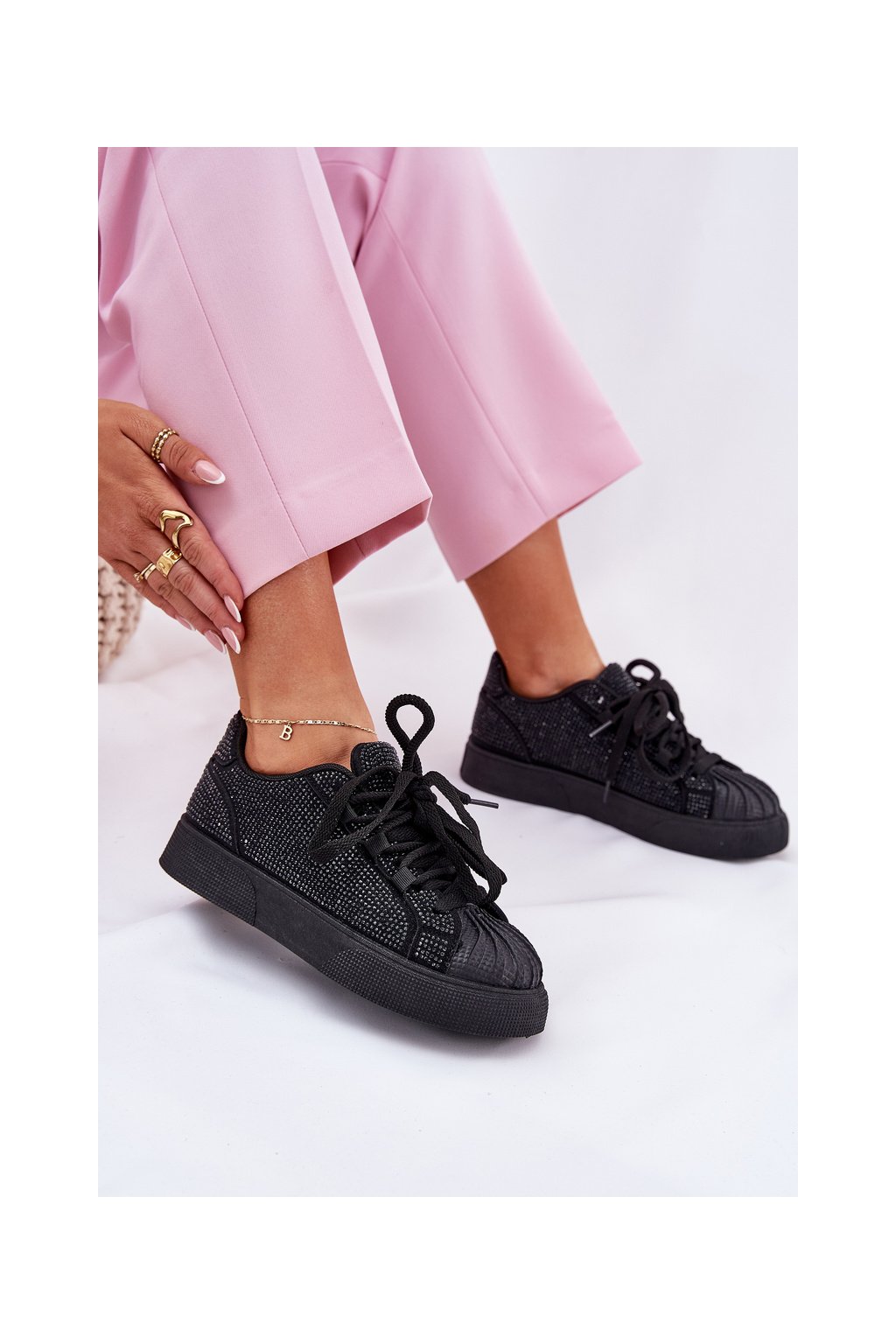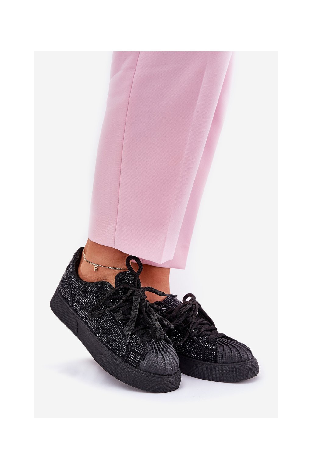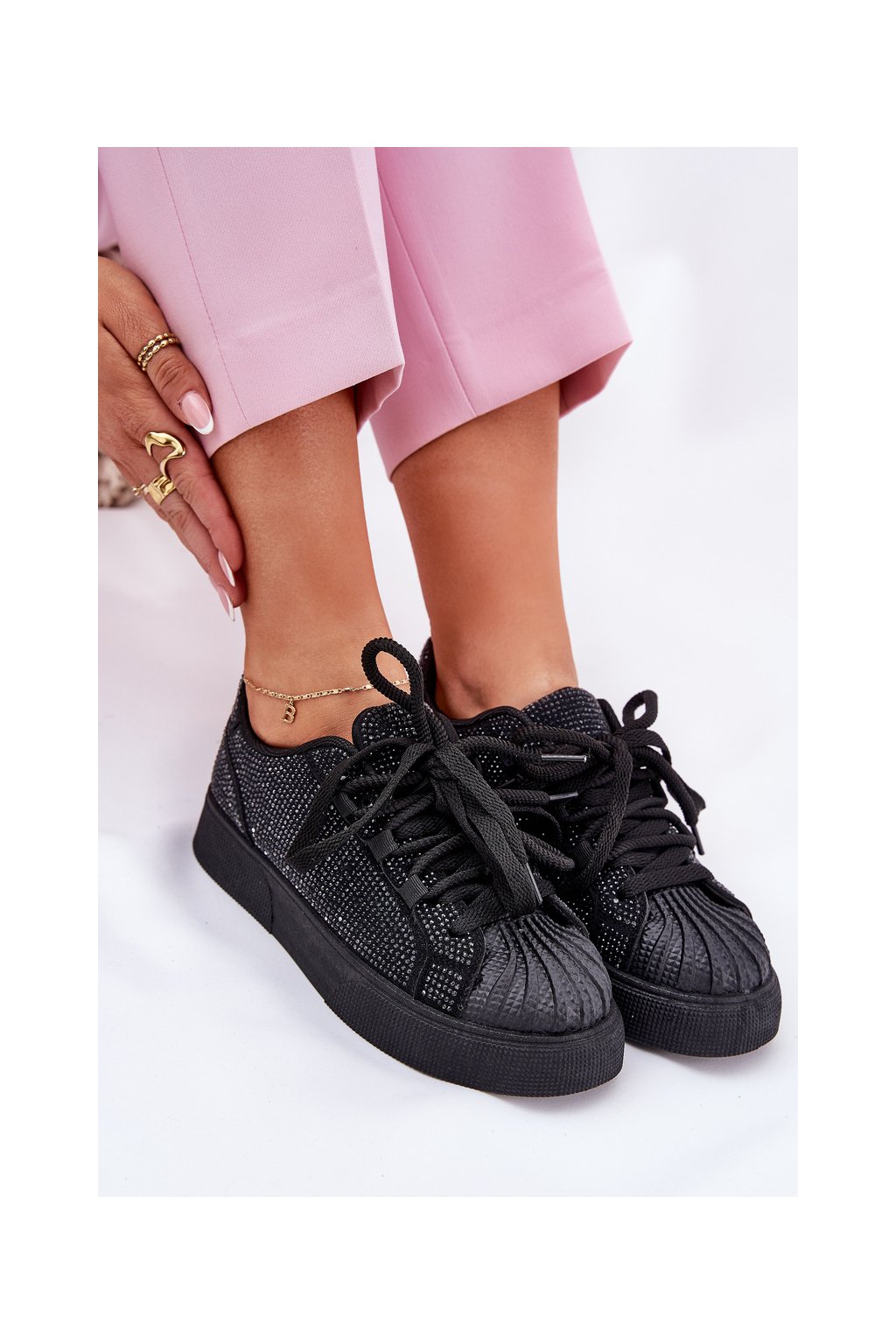 Čierne dámske semišové tenisky na platforme s rovnou podrážkou, zdobené zirkónmi, kód produktu 8970 BLACK