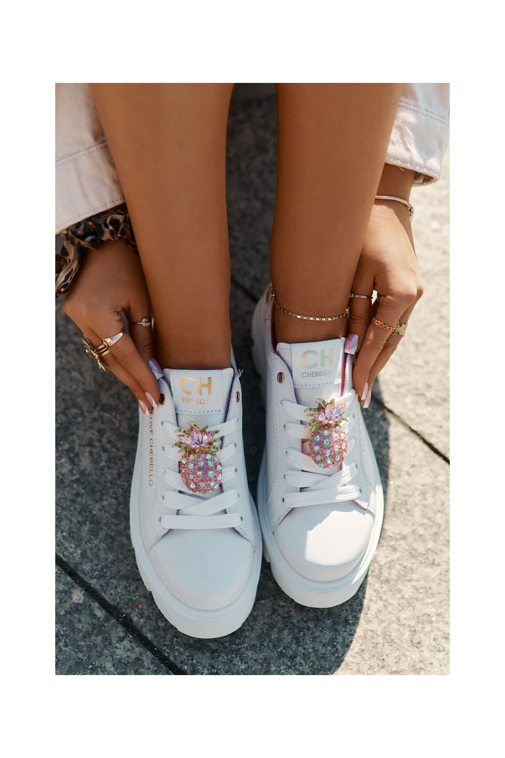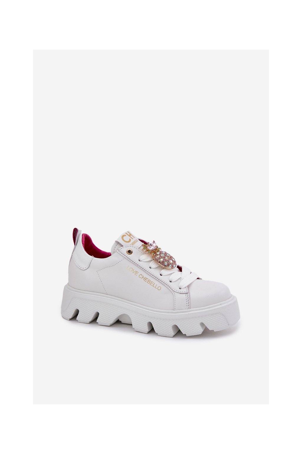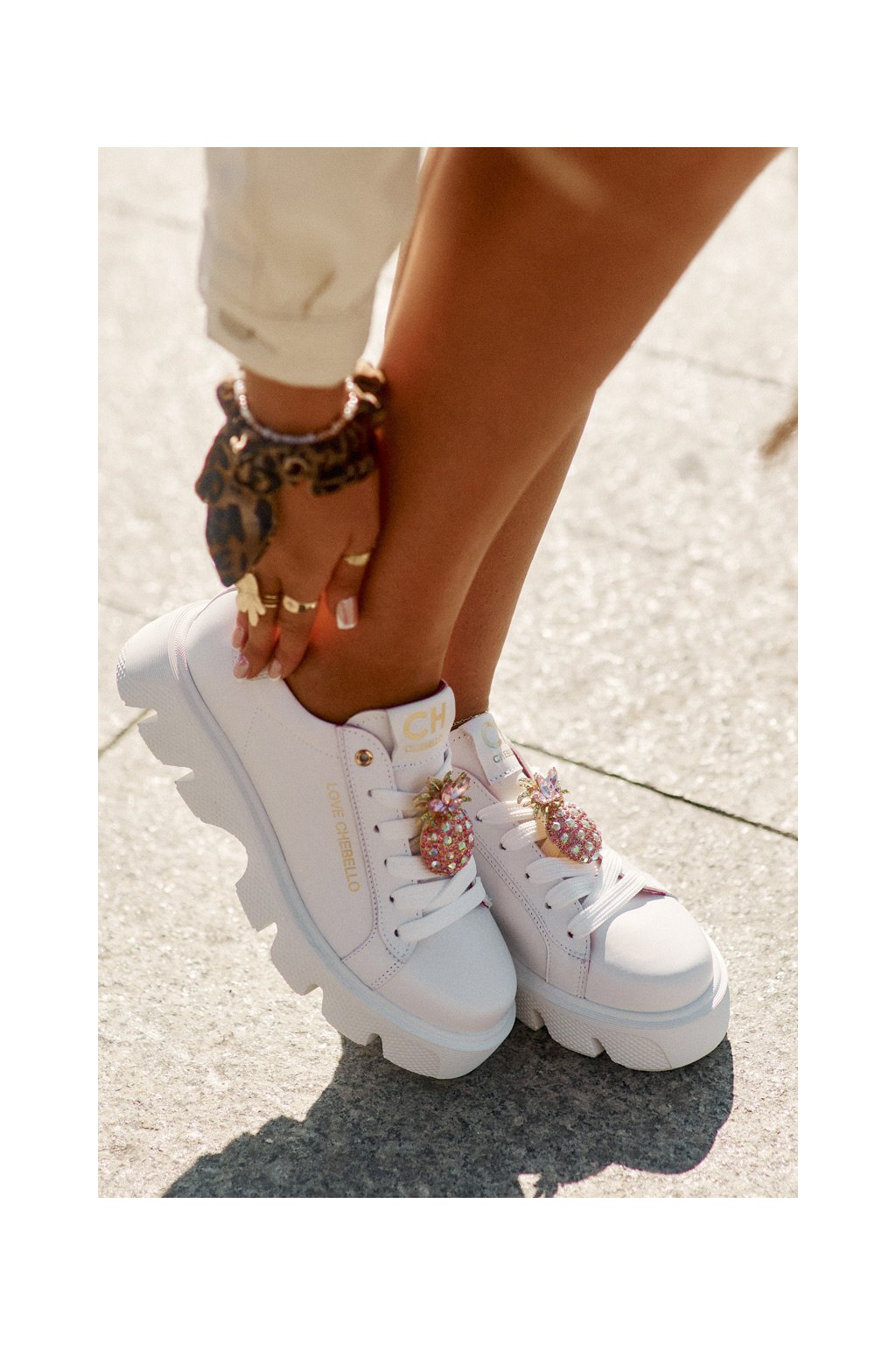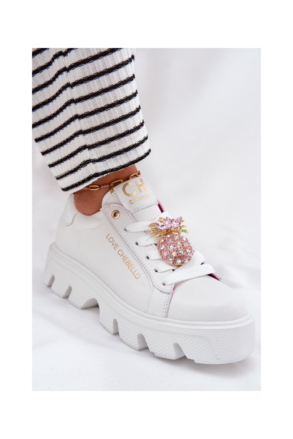 Biele dámske kožené tenisky s ozdobnou brožou ananás CheBello 4651 BIAŁY