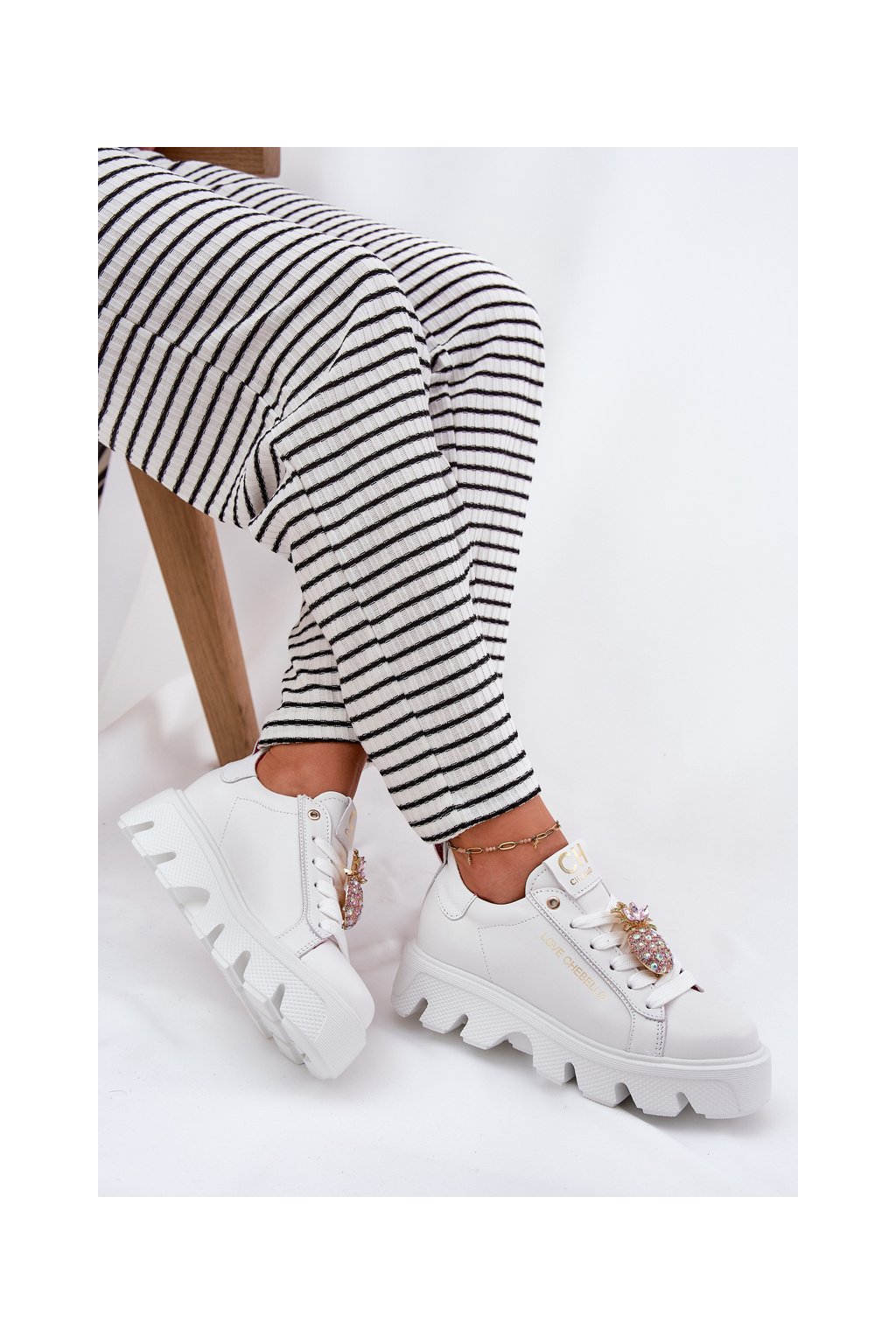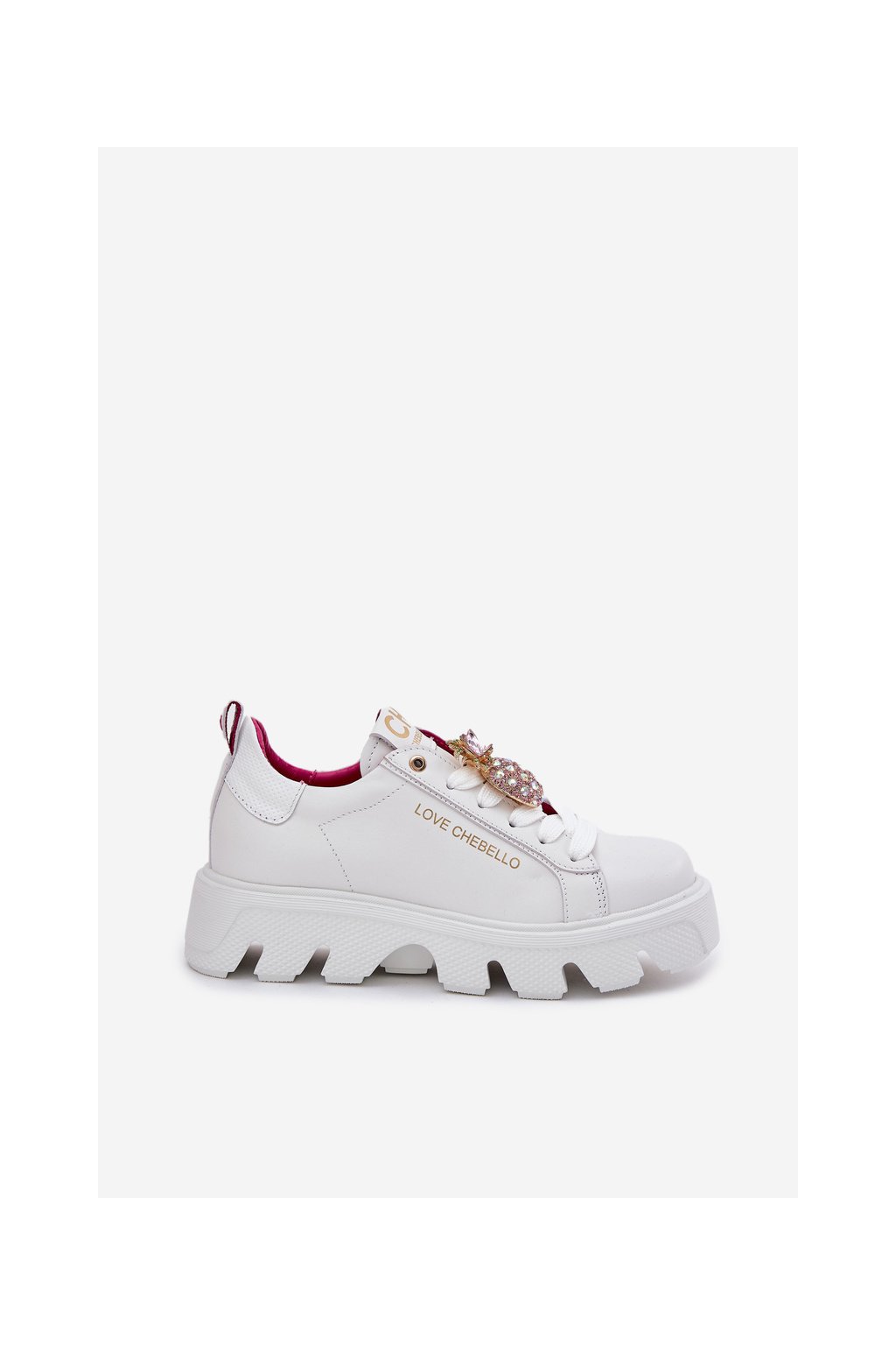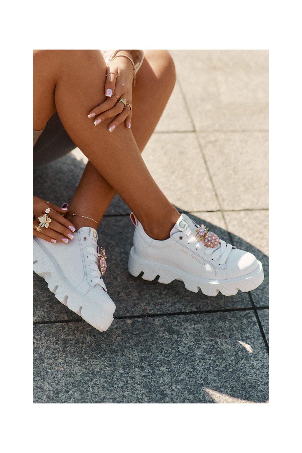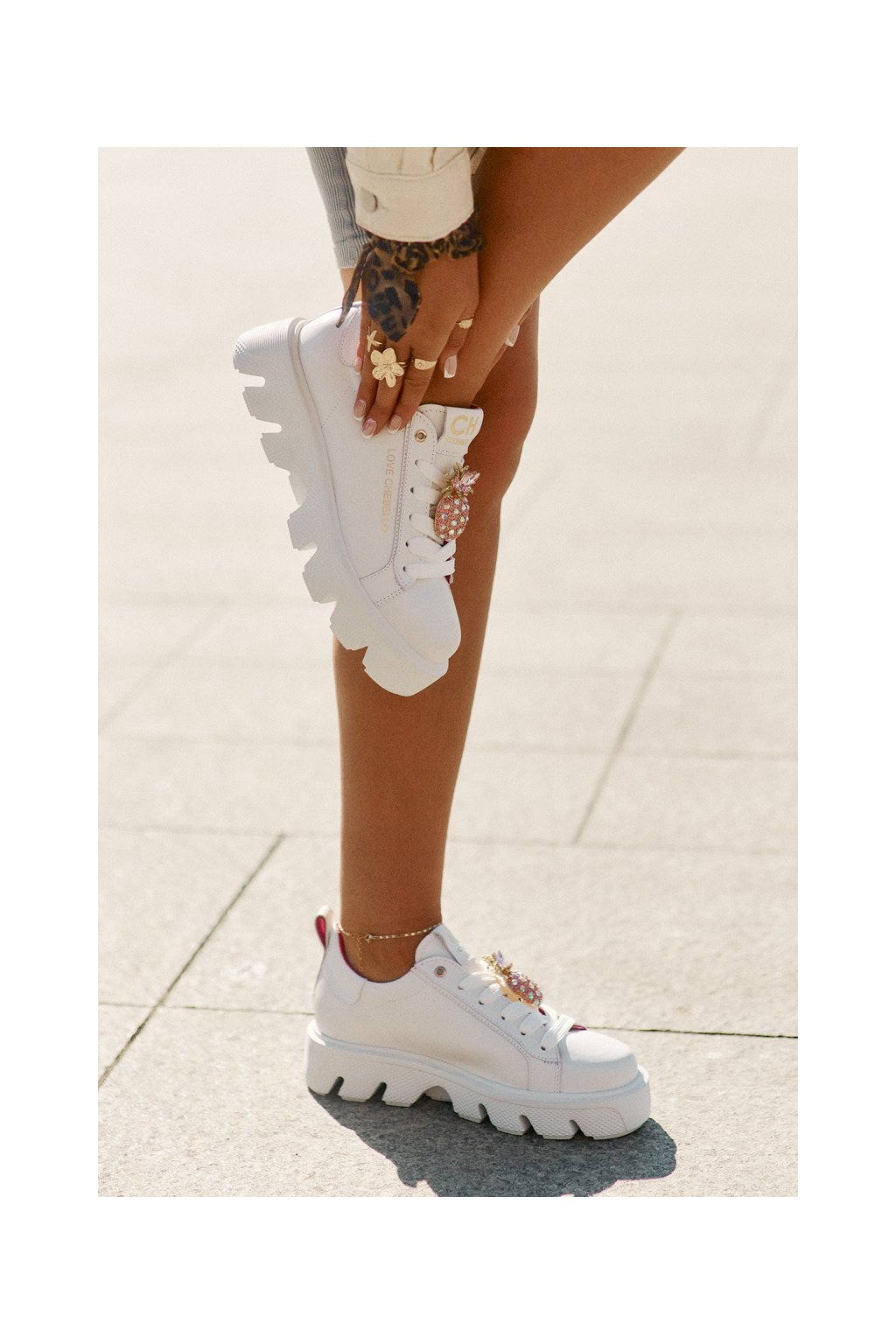 Biele dámske kožené tenisky s ozdobnou brožou ananás CheBello 4651 BIAŁY